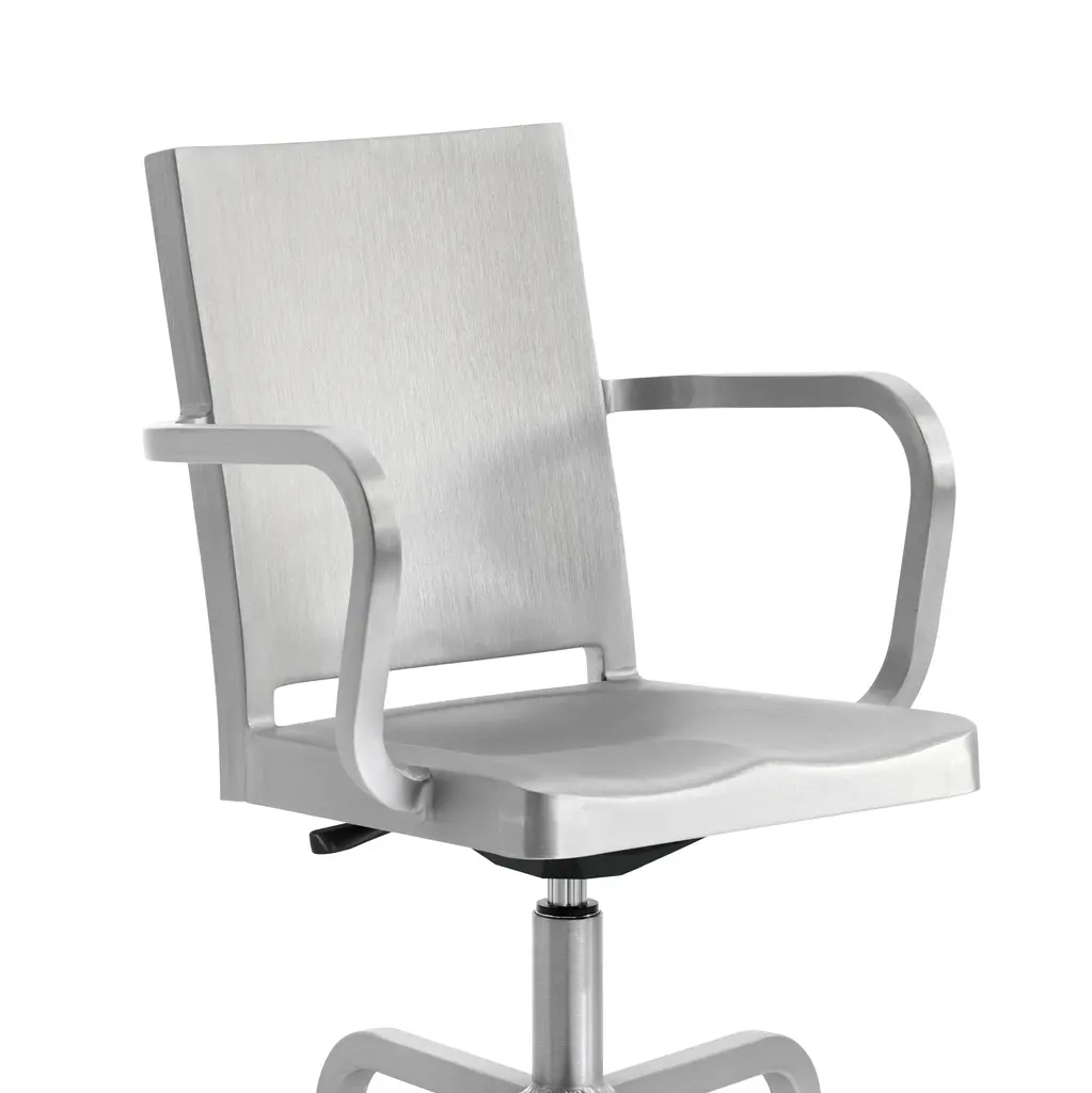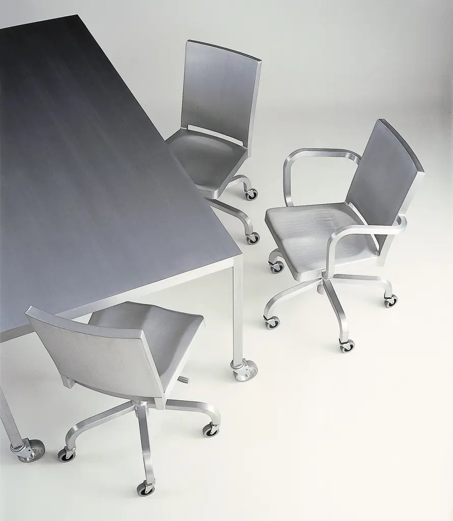 Hudson by Philippe Starck, 2000 A timeless piece, built for lifetimes of use, to be kept, cherished and passed on for generations. Made to order. Built by hand from 80% recycled aluminum in Hanover, Pennsylvania by our most skilled craftsmen. Guaranteed for life. The Hudson, designed for the Hudson hotel in NYC, is Emeco and Starck’s first collaboration. Starck described the chair as “washing the details from the Navy Chair”. Hudson is in MoMa’s permanent collection.