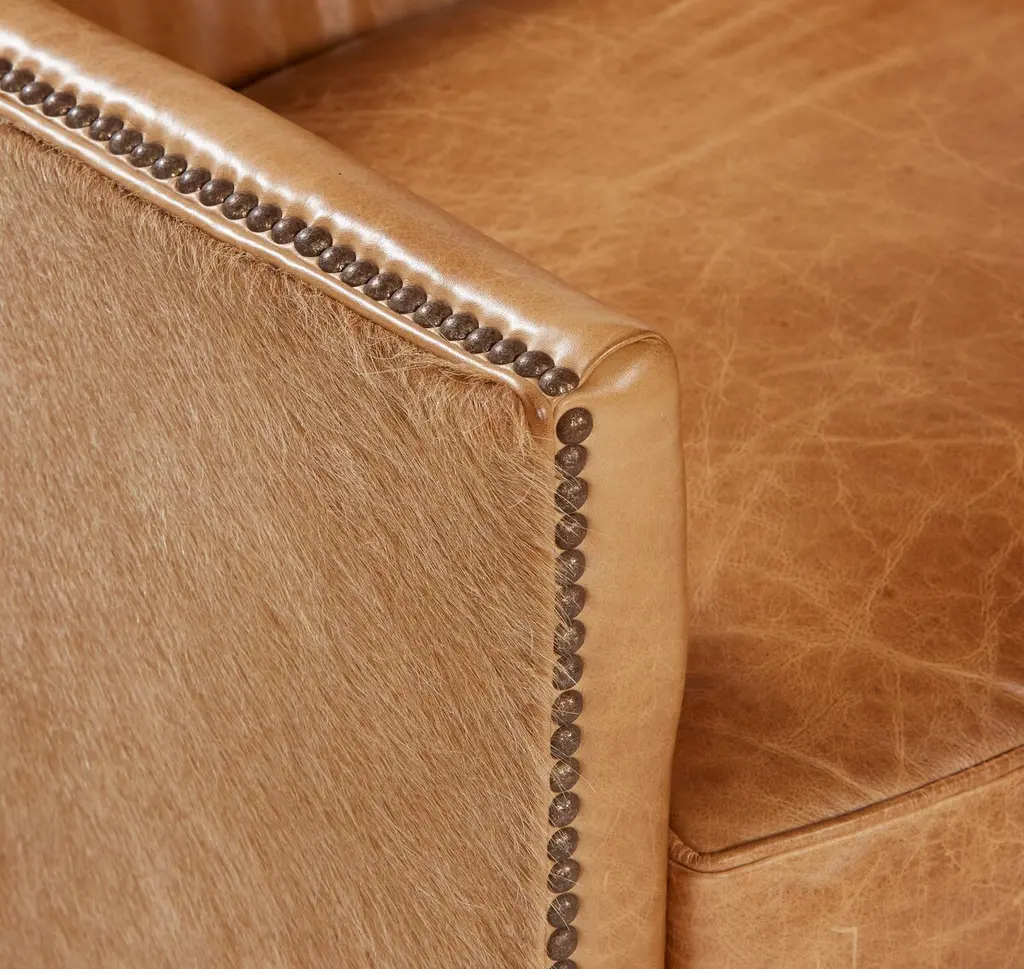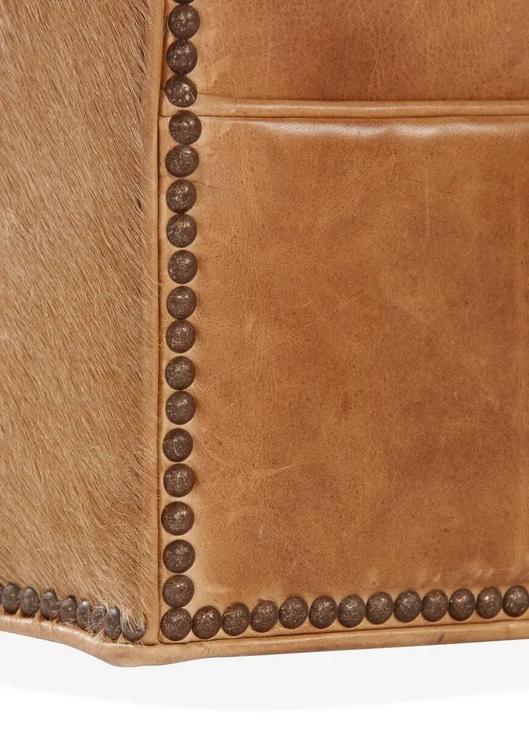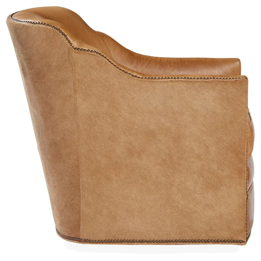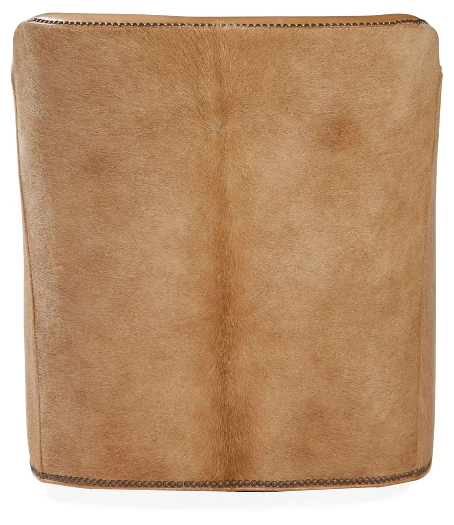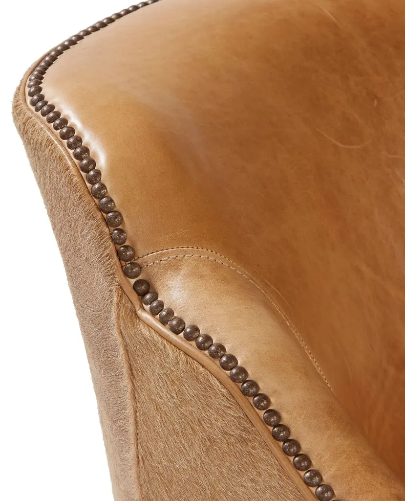 Outfitted in camel-hued leather with hair-on-hide backing, this finely crafted swivel chair adds a note of warmth and texture to any space. A foam fill wrapped in down ensures optimal comfort and support.