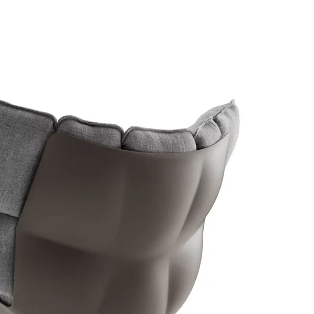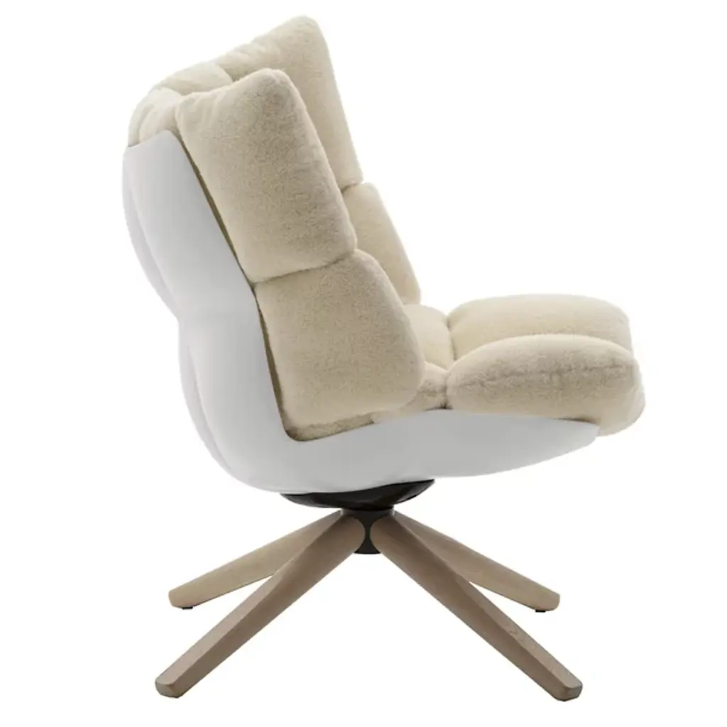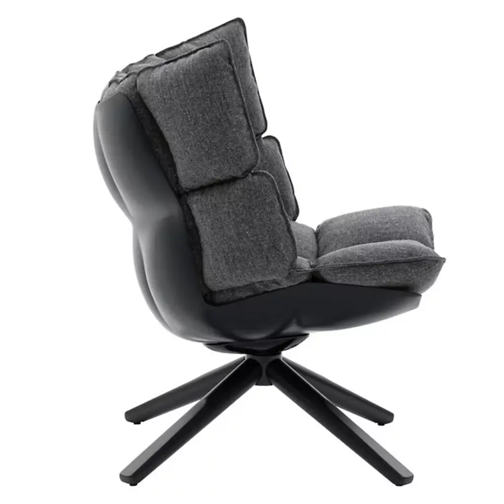 The Husk Swivel Armchair from B&B Italia delivers a cozy seating experience with its pattern of plump, eco-sustainable cushioning. Designer Patricia Urquiola's work connects the familiar to the unexplored, a process that is shown in the classic materials and their artful presentation at play. Creating a flowy silhouette, the chair's seat shell packs a Hirek® plastic made from recycled and recyclable polymers. The capitonné style padded cushion is made to create a supportive, hugging sensation.