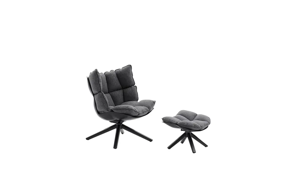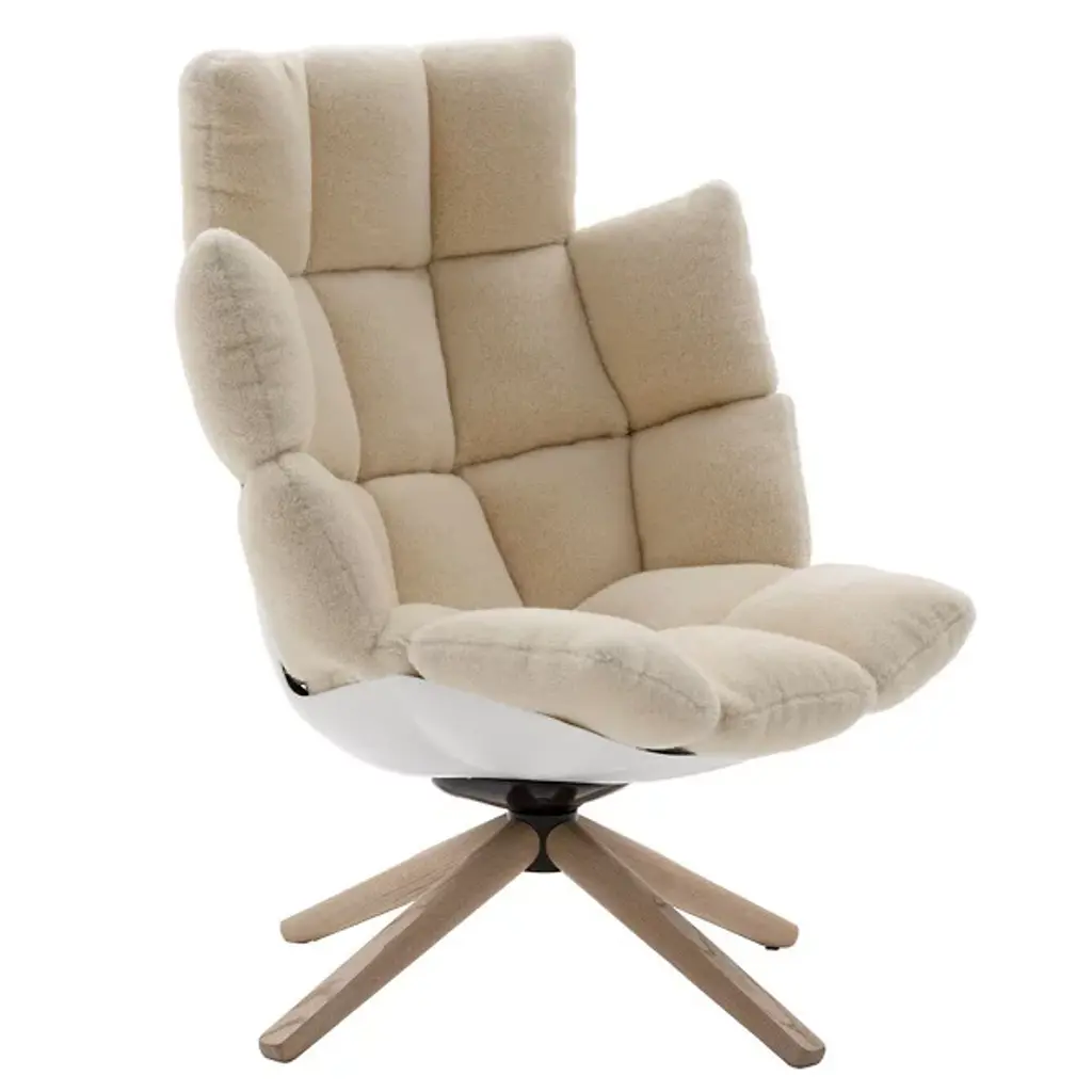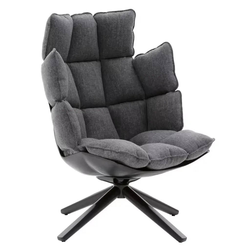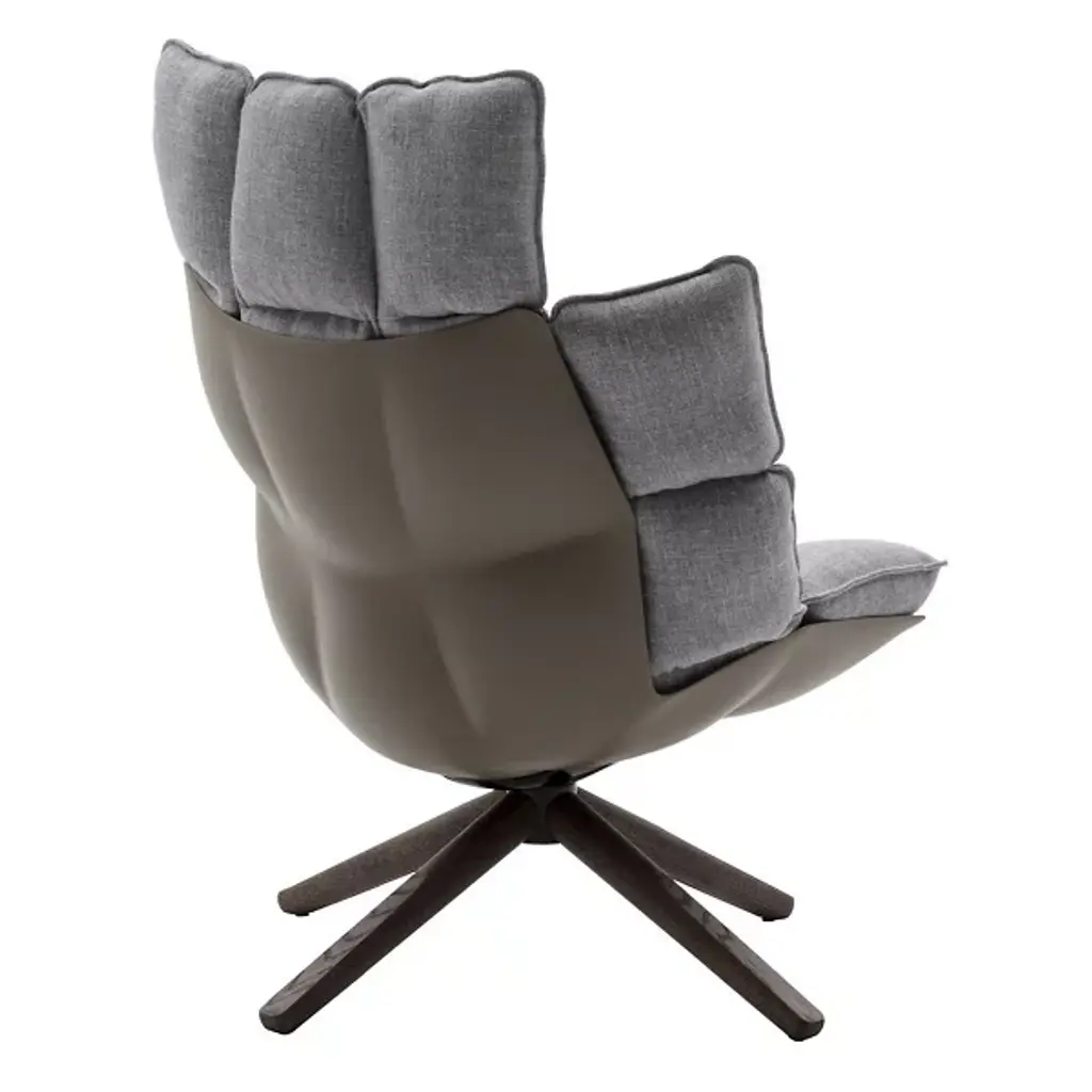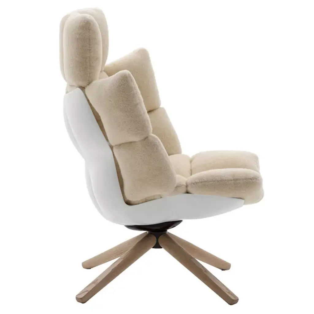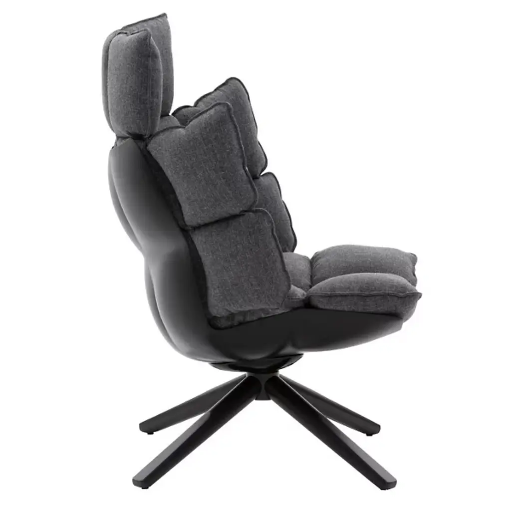The Husk Swivel High Armchair from B&B Italia presents an embracing design emphasizing comfort and eco-sustainability. The piece illustrates designer Patricia Urquiola's process of connecting the familiar to the unexplored. This chair surprises with swiveling capabilities at its elegant and anchoring tripod base. A sculptural seat shell slots on top sporting a strong Hirek® plastic crafted from recycled and recyclable polymers. Evoking throwback style in its capitonné design, the seat cushion rounds out with capsule-like forms for a laidback lounging experience.