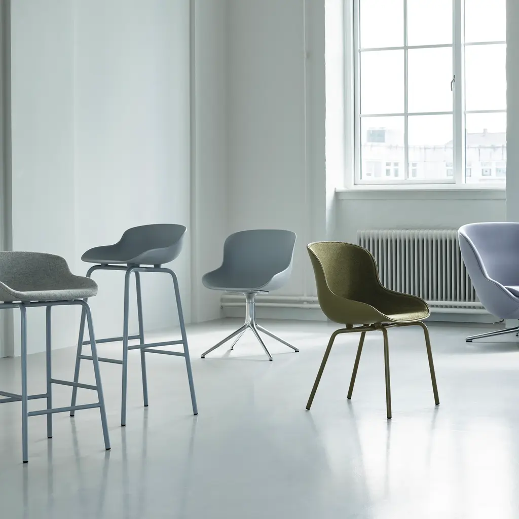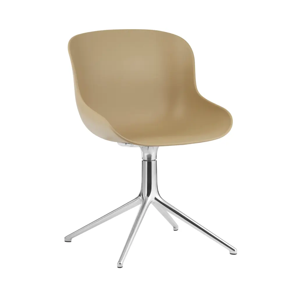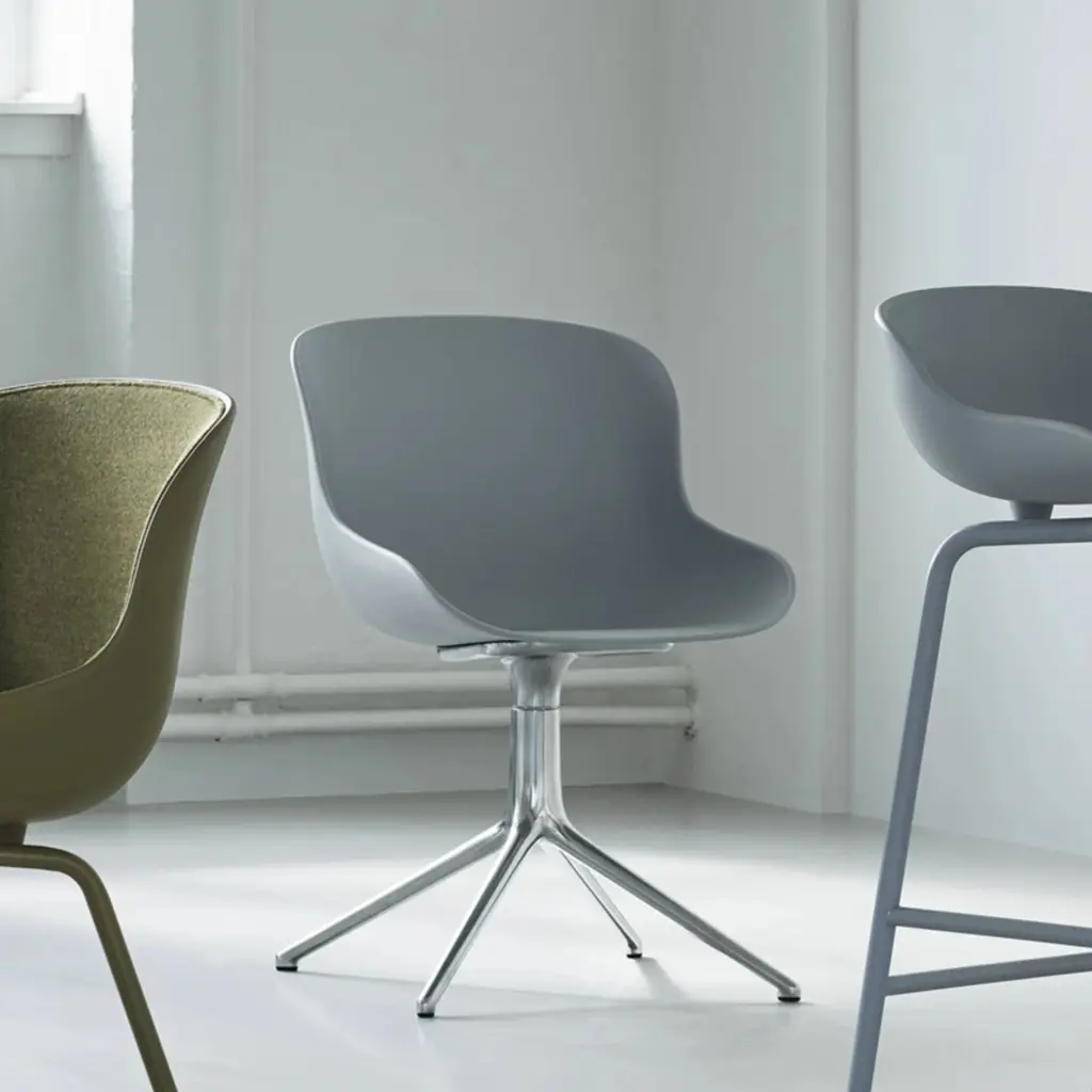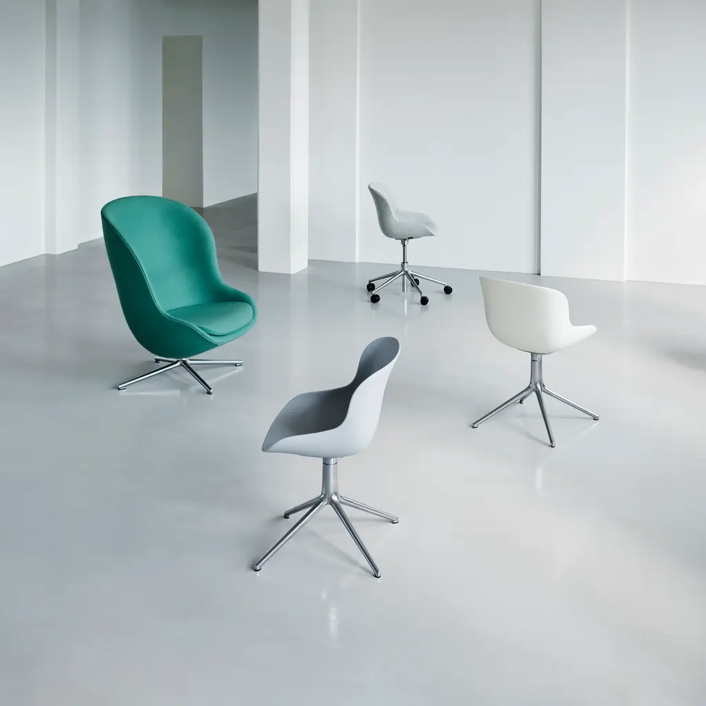 A swivel option makes Copenhagen designer Simon Legald's seating Hyg particularly suitable for locales like conference rooms and restaurants. In a choice of silver or black aluminum, the rotating base adds increased utility to the chair's expansive proportions. Inspired by the Danish notion of hygge, the sculpted shape provides for a range of comfortable positions as well as a sense of embracing security with its signature raised seat edge.