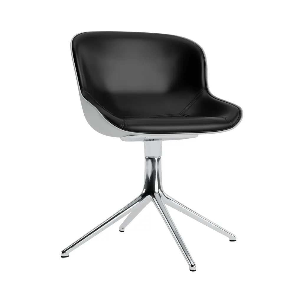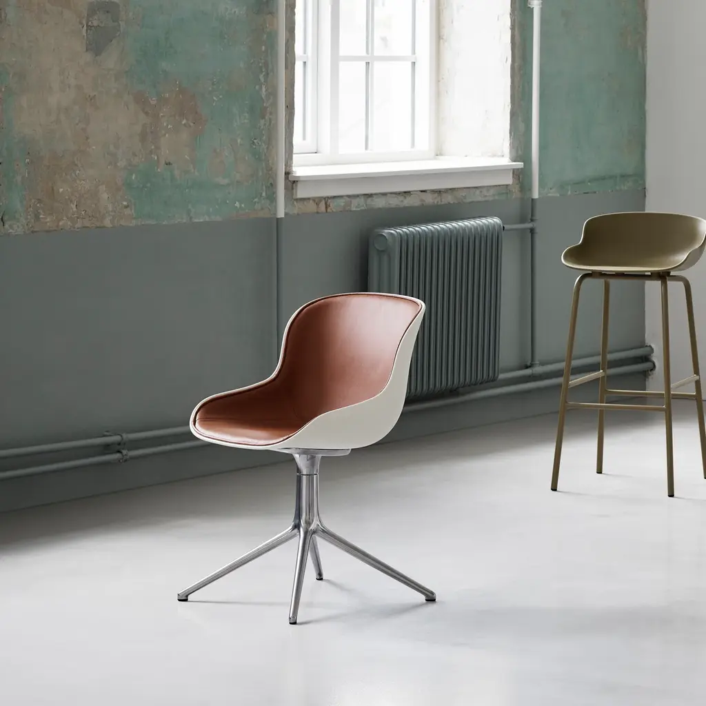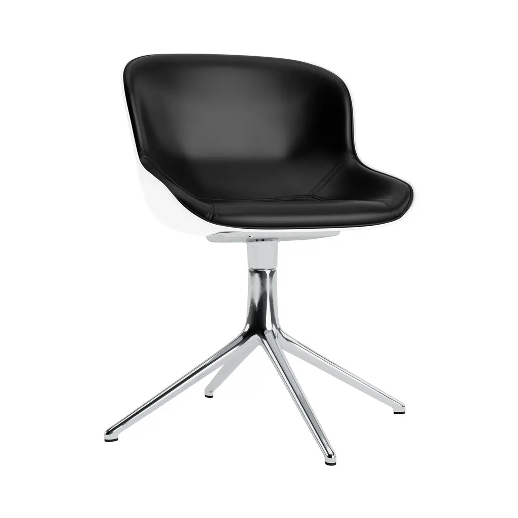 For settings like office conference rooms and restaurants, Hyg adds the custom option of front upholstery for its swivel chair. Designer Simon Legald's sculpted seating accommodates a range of fine fabric and leather selections to complement the rotating base in a choice of silver or black aluminum. Reflecting the vaunted Danish hygge, the chair's expansive proportions allow for a range of comfortable seated positions with the added utility of rotating movement.