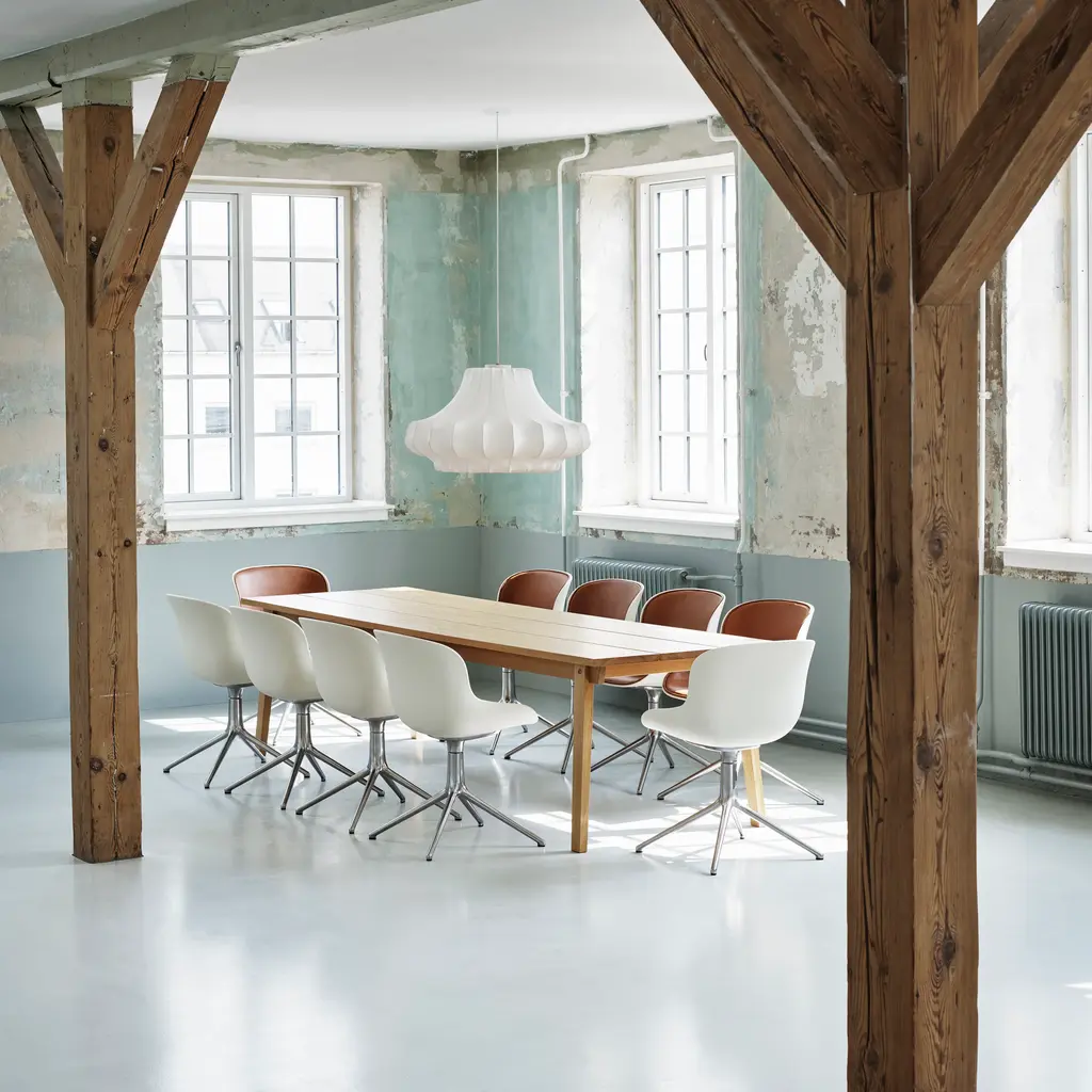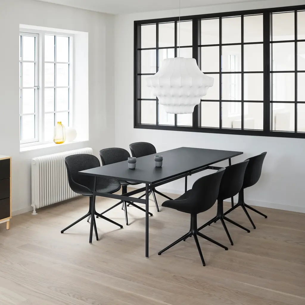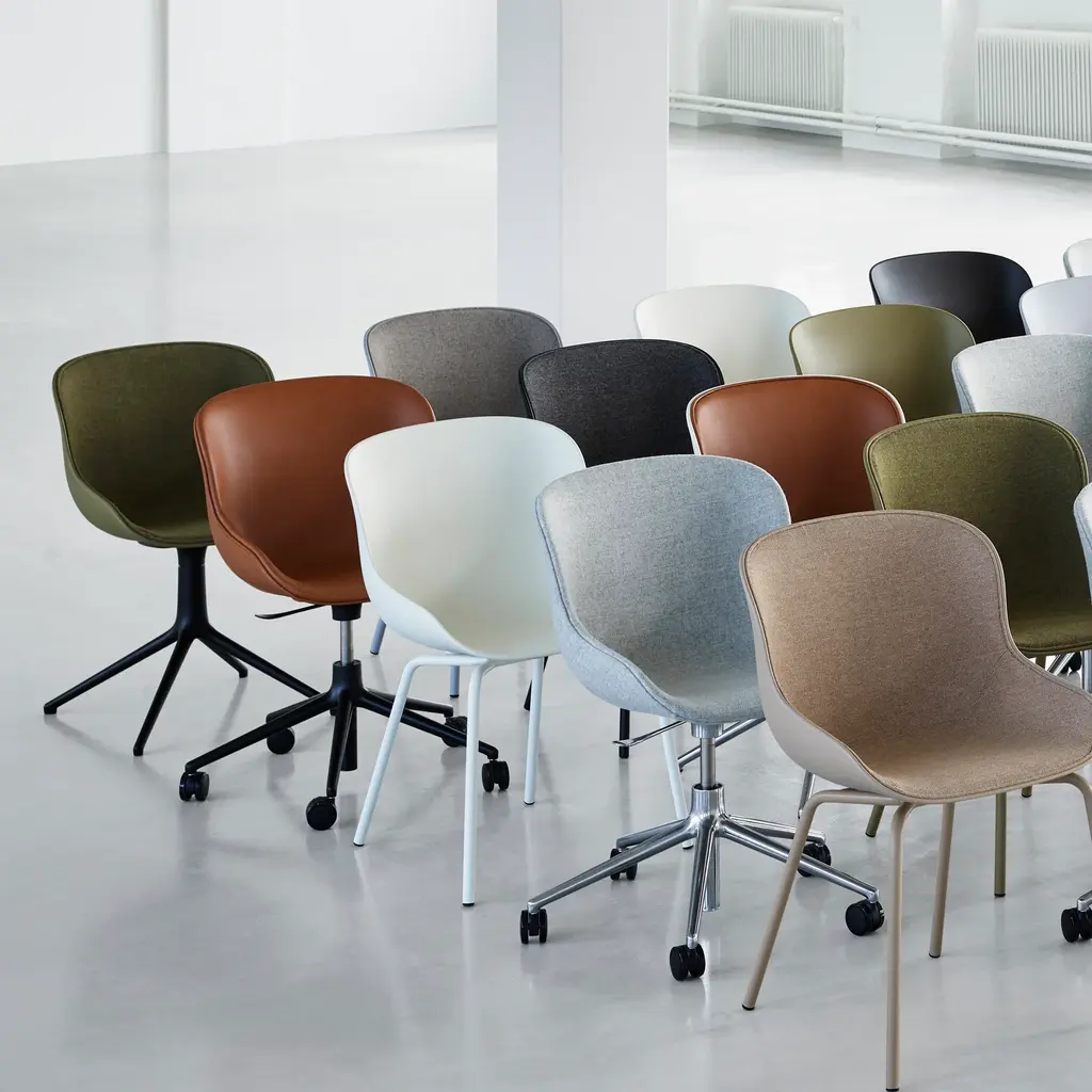For settings like office conference rooms and restaurants, Hyg adds the custom option of front upholstery for its swivel chair. Designer Simon Legald's sculpted seating accommodates a range of fine fabric and leather selections to complement the rotating base in a choice of silver or black aluminum. Reflecting the vaunted Danish hygge, the chair's expansive proportions allow for a range of comfortable seated positions with the added utility of rotating movement.