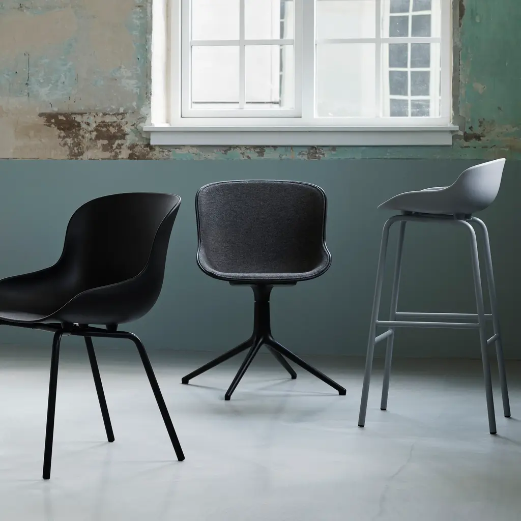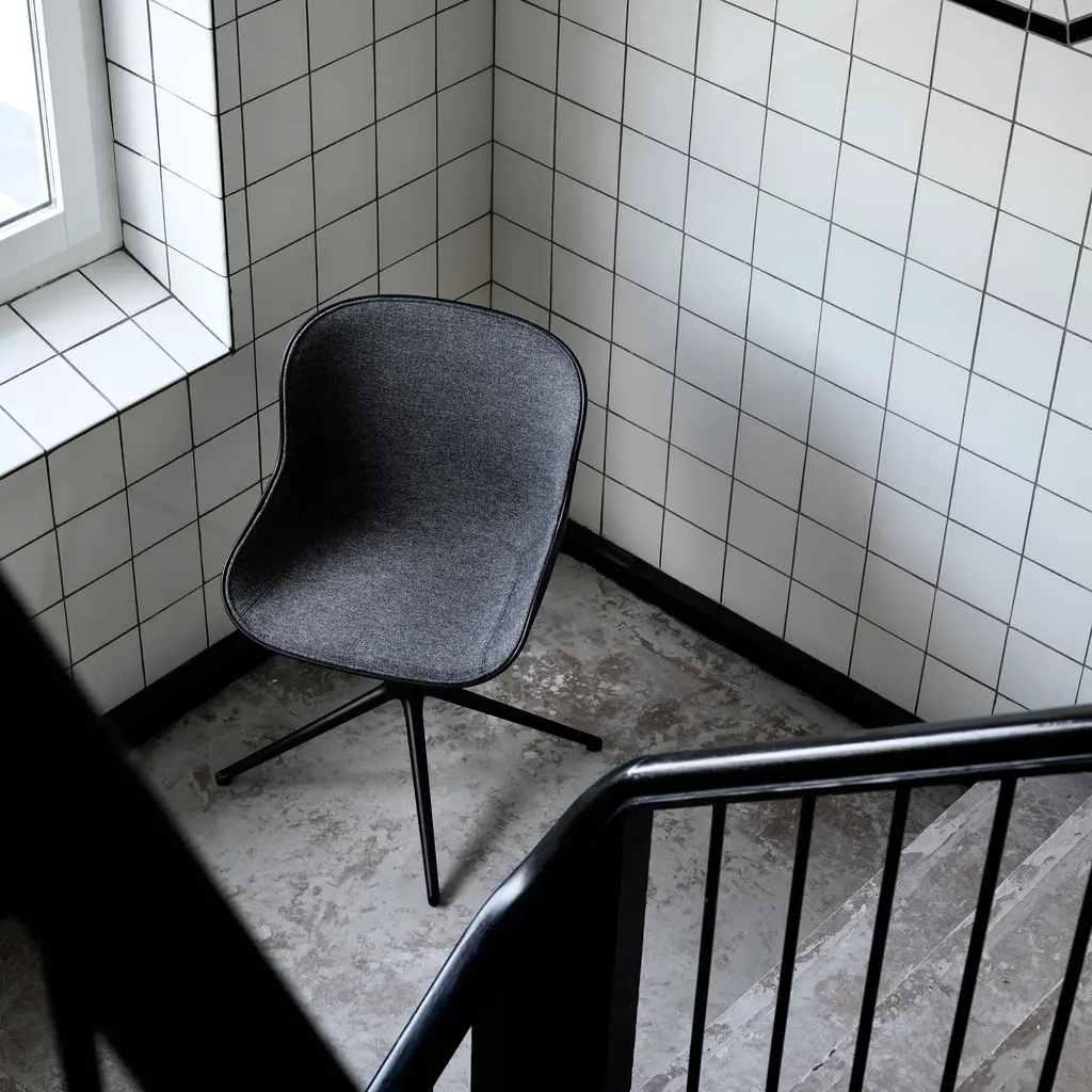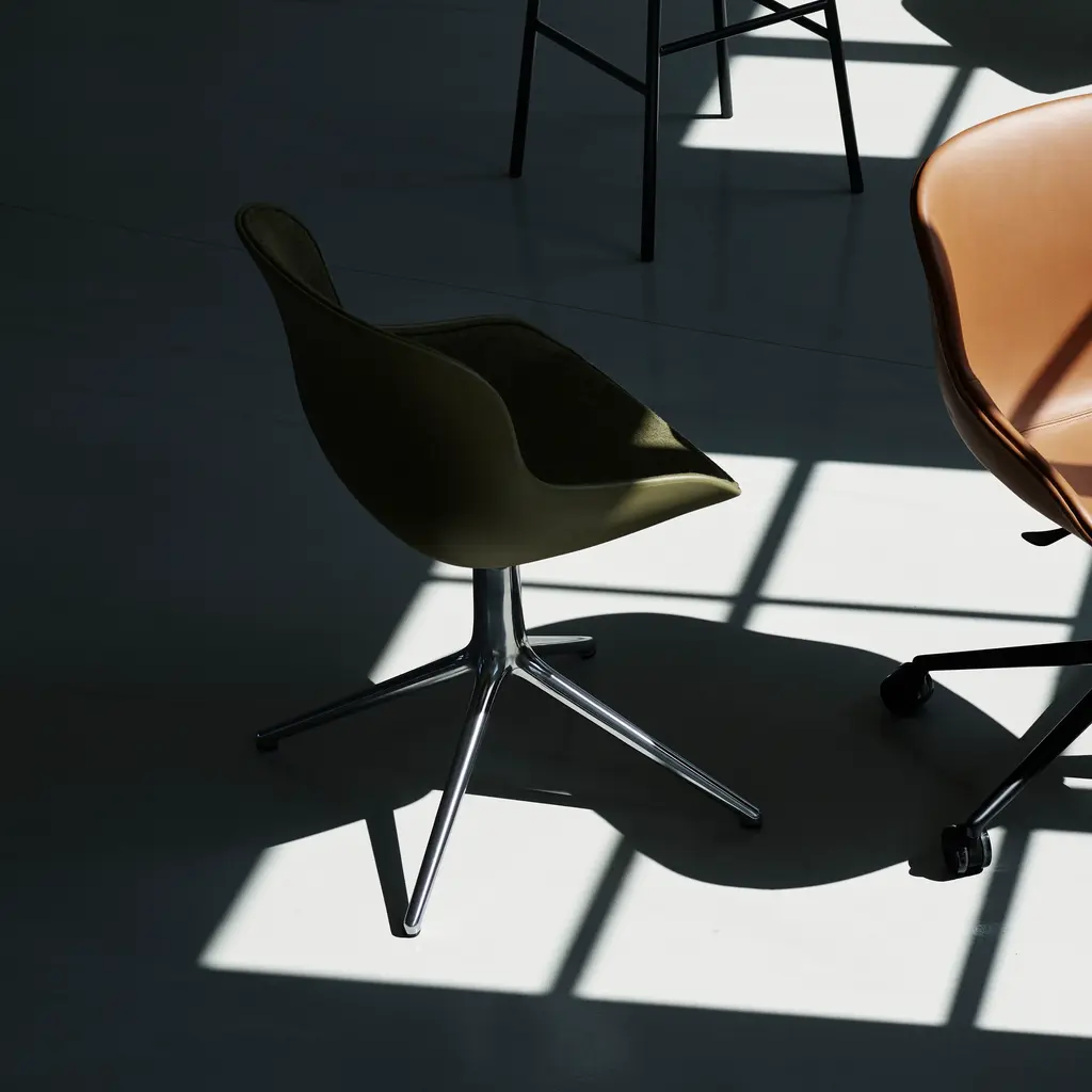 For settings like office conference rooms and restaurants, Hyg adds the custom option of front upholstery for its swivel chair. Designer Simon Legald's sculpted seating accommodates a range of fine fabric and leather selections to complement the rotating base in a choice of silver or black aluminum. Reflecting the vaunted Danish hygge, the chair's expansive proportions allow for a range of comfortable seated positions with the added utility of rotating movement.