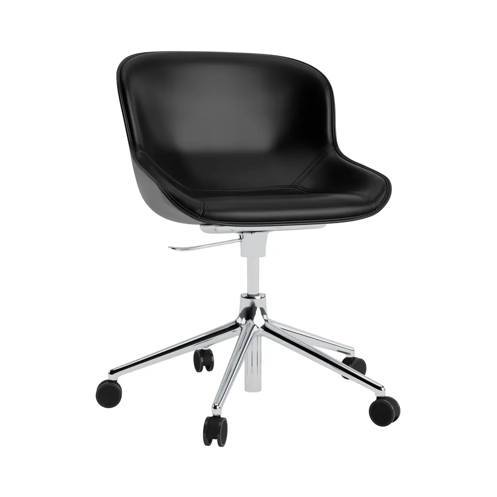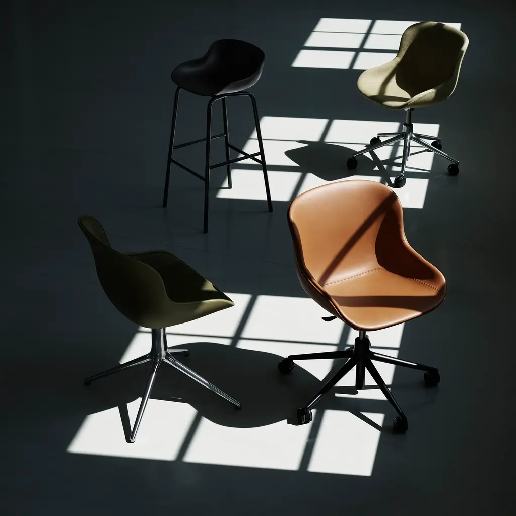 Designer Simon Legald adds a customizable workaday version of Hyg, kitted out with a rolling swivel base on castors and a front upholstered seat. The chair's comfortably organic curves get their inspiration from the enviable Danish tradition of hygge, a feeling of well-being. The front-facing contours can be sheathed in a choice of premium textiles or leather for a unique look that complements the textured polypropylene shell and either polished or black aluminum base.