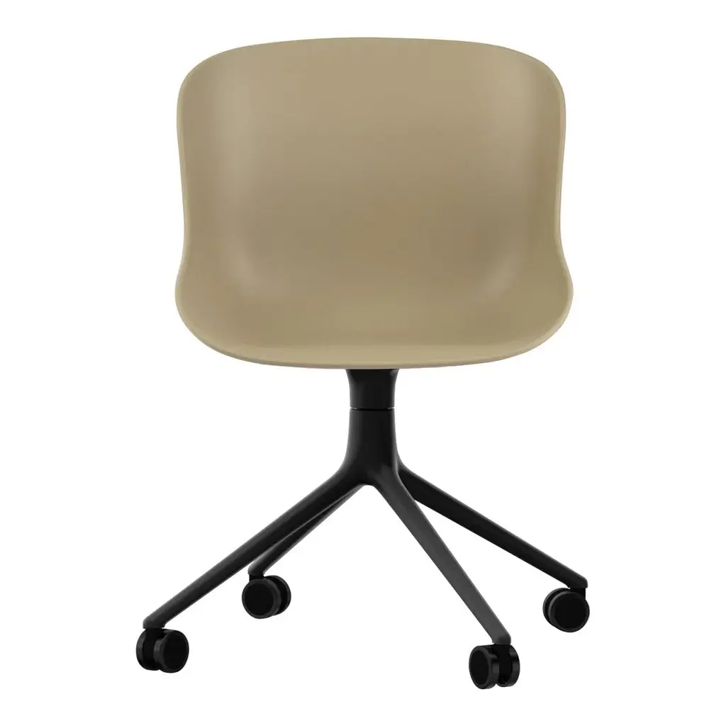 A shell of high-strength polypropylene is mounted to a swivel base with four wheels. The Hyg chair swivel 4W is available with frontor full upholstery following the shell color. The Hyg chair swivel4W is delivered fully assembled.