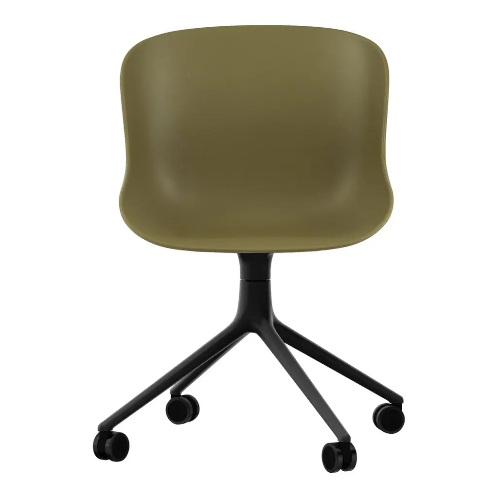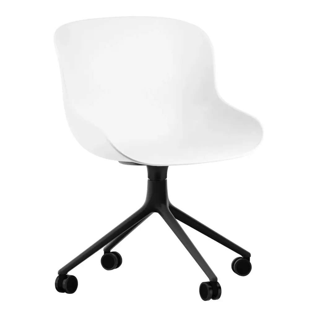 A shell of high-strength polypropylene is mounted to a swivel base with four wheels. The Hyg chair swivel 4W is available with frontor full upholstery following the shell color. The Hyg chair swivel4W is delivered fully assembled.