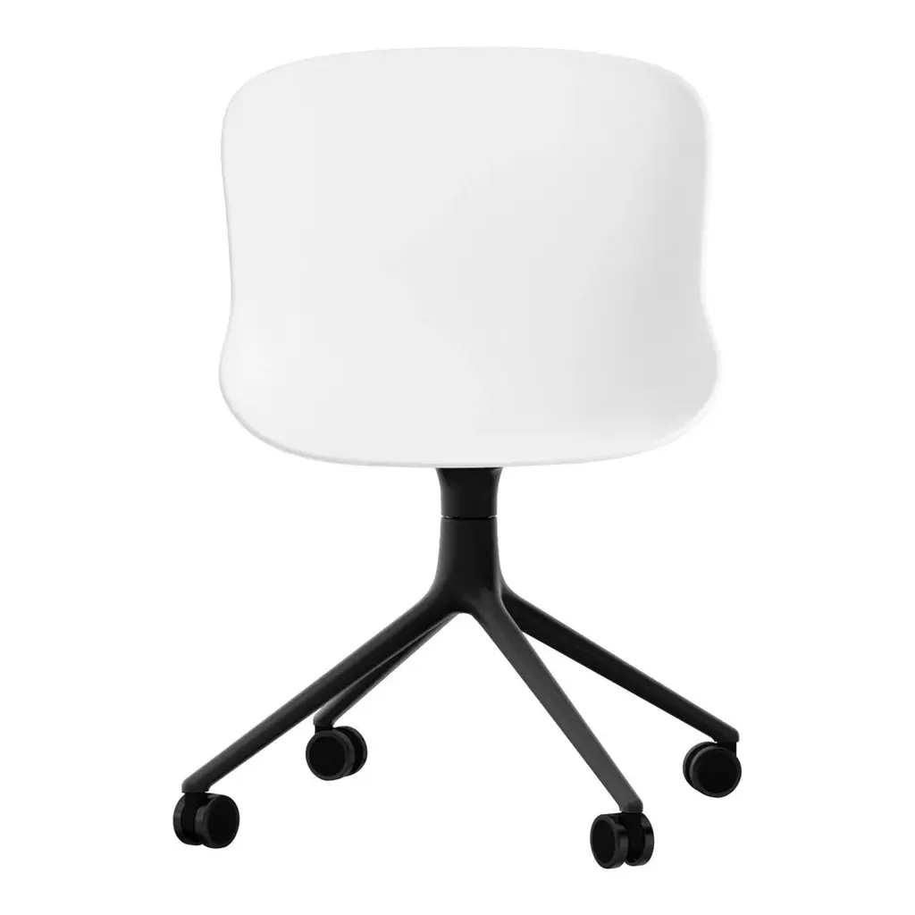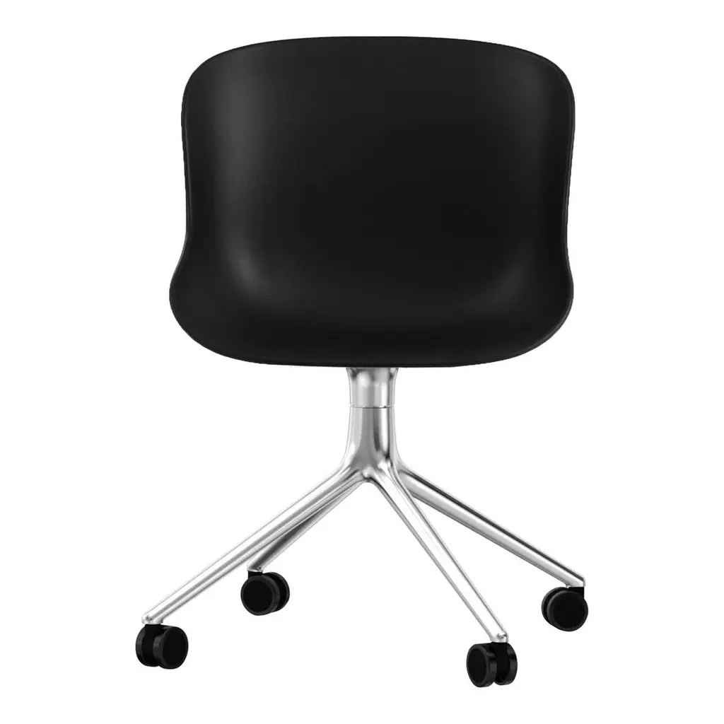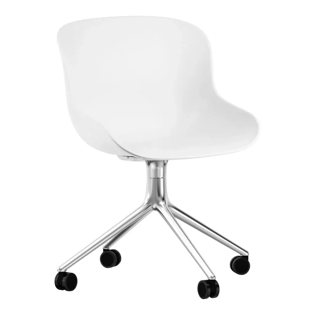A shell of high-strength polypropylene is mounted to a swivel base with four wheels. The Hyg chair swivel 4W is available with frontor full upholstery following the shell color. The Hyg chair swivel4W is delivered fully assembled.