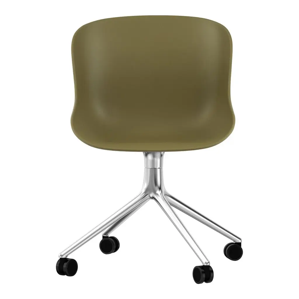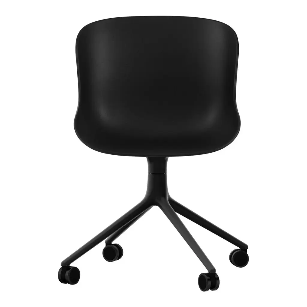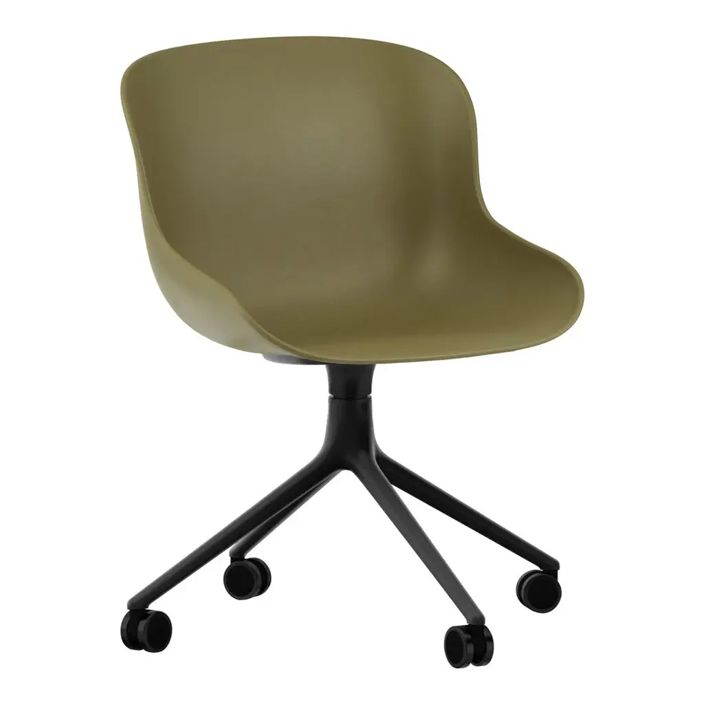 A shell of high-strength polypropylene is mounted to a swivel base with four wheels. The Hyg chair swivel 4W is available with frontor full upholstery following the shell color. The Hyg chair swivel4W is delivered fully assembled.
