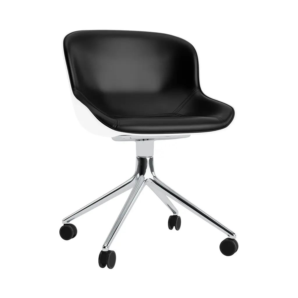 With a front-upholstered shell and crisp 4-star swivel base on castors, designer Simon Legald offers a versatile take on workaday seating. The molded chair's extremely comfortable contours are inspired by the covetable Danish sense of well-being known as “hygge.” Site-specific personalization comes from the custom choice of a fine textile or leather to pair with the textured polypropylene shell in a range of accommodating hues.