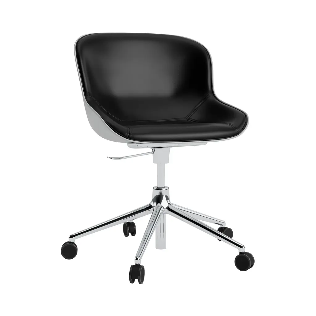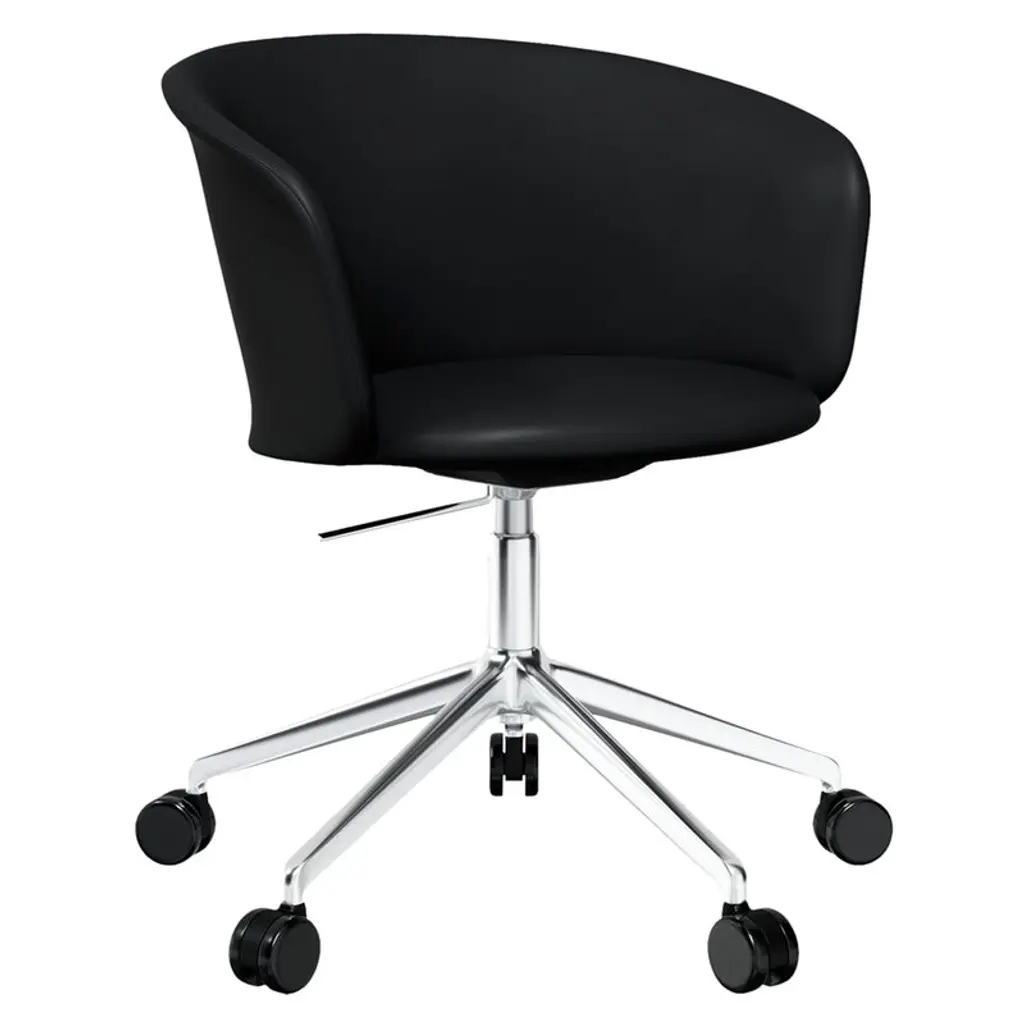 With a front-upholstered shell and crisp 4-star swivel base on castors, designer Simon Legald offers a versatile take on workaday seating. The molded chair's extremely comfortable contours are inspired by the covetable Danish sense of well-being known as “hygge.” Site-specific personalization comes from the custom choice of a fine textile or leather to pair with the textured polypropylene shell in a range of accommodating hues.