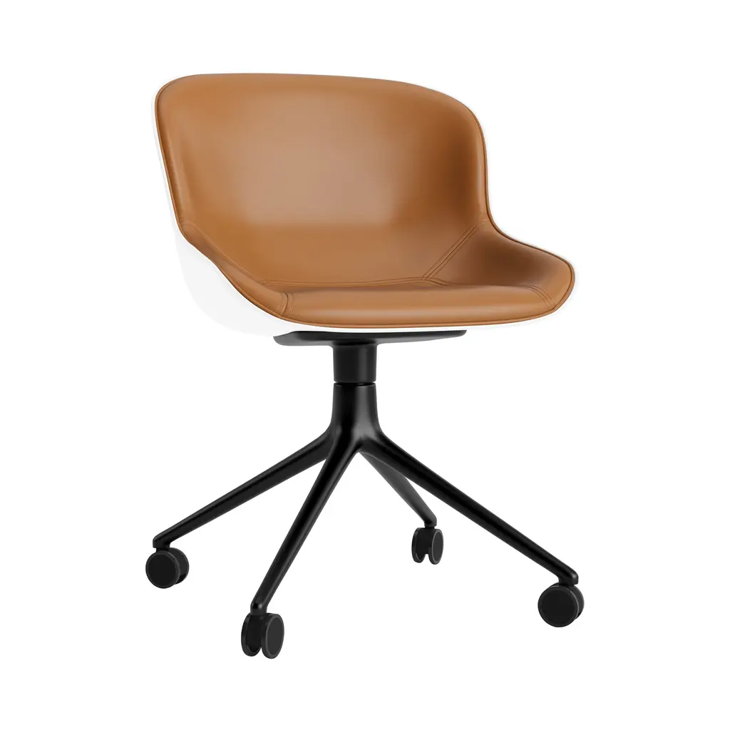 With a front-upholstered shell and crisp 4-star swivel base on castors, designer Simon Legald offers a versatile take on workaday seating. The molded chair's extremely comfortable contours are inspired by the covetable Danish sense of well-being known as “hygge.” Site-specific personalization comes from the custom choice of a fine textile or leather to pair with the textured polypropylene shell in a range of accommodating hues.
