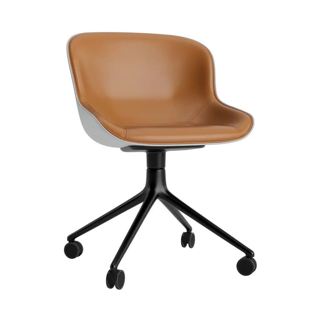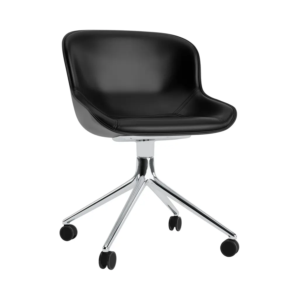 With a front-upholstered shell and crisp 4-star swivel base on castors, designer Simon Legald offers a versatile take on workaday seating. The molded chair's extremely comfortable contours are inspired by the covetable Danish sense of well-being known as “hygge.” Site-specific personalization comes from the custom choice of a fine textile or leather to pair with the textured polypropylene shell in a range of accommodating hues.