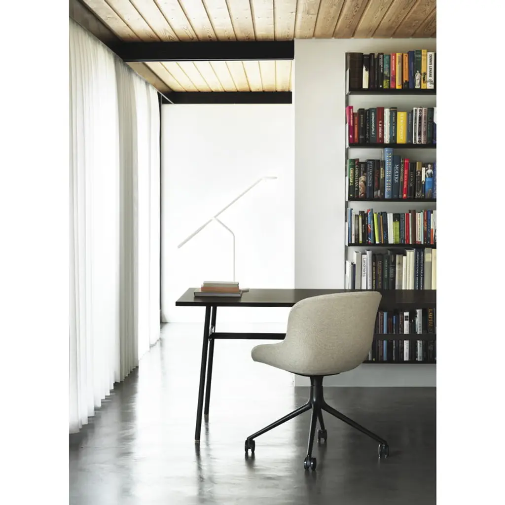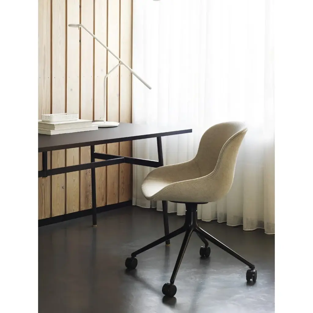Normann Copenhagen's Hyg swivel chair, with its voluminous silhouette and soft, curvy lines, exudes warmth and comfort. The inspiration behind the cozy Hyg collection is the word “hygge”: in the spirit of perhaps the most well-known word of the Danish language, designer Simon Legald wanted to create a shell chair with a sense of security and solace. The Hyg chair is like a safe haven, a nest where you can feel comfortable, be it in your own study, a busy office or a conference room. The upholstered chair is equipped with wheels and is height-adjustable. “The feeling of hygge is not only linked to the visual experience of the design; it lies in the overall sensuous experience. A lot of effort has gone into sculpting the shape to provide rest and support for the human body, to make it comfortable to sit in, basically,” Simon Legald has said.