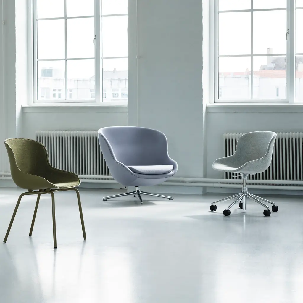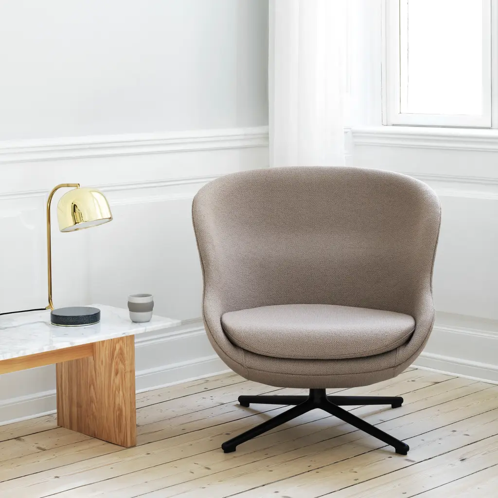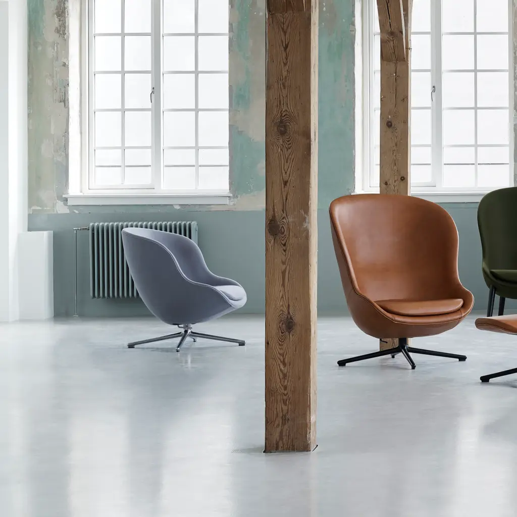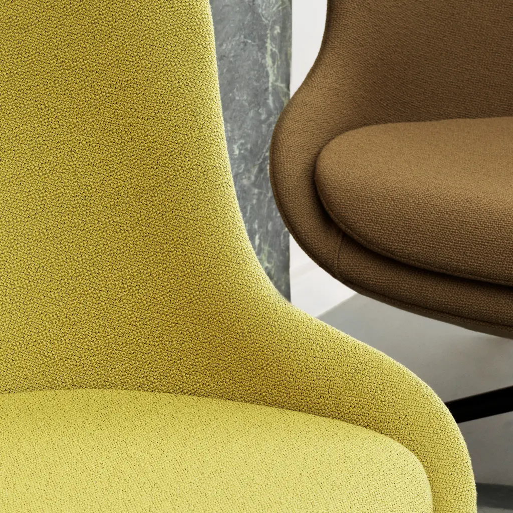 A swivel base brings added versatility to this lounge chair named for its virtues of coziness and calm. Hyg (short for the beloved Danish tradition of hygge) combines sheltering contours and a broad seat to accommodate a wide range of relaxed positions. Upholstery in a fine textile or rich leather enrobes the chair's concave shape, making for a luxurious respite for relaxation or intimate conversation.