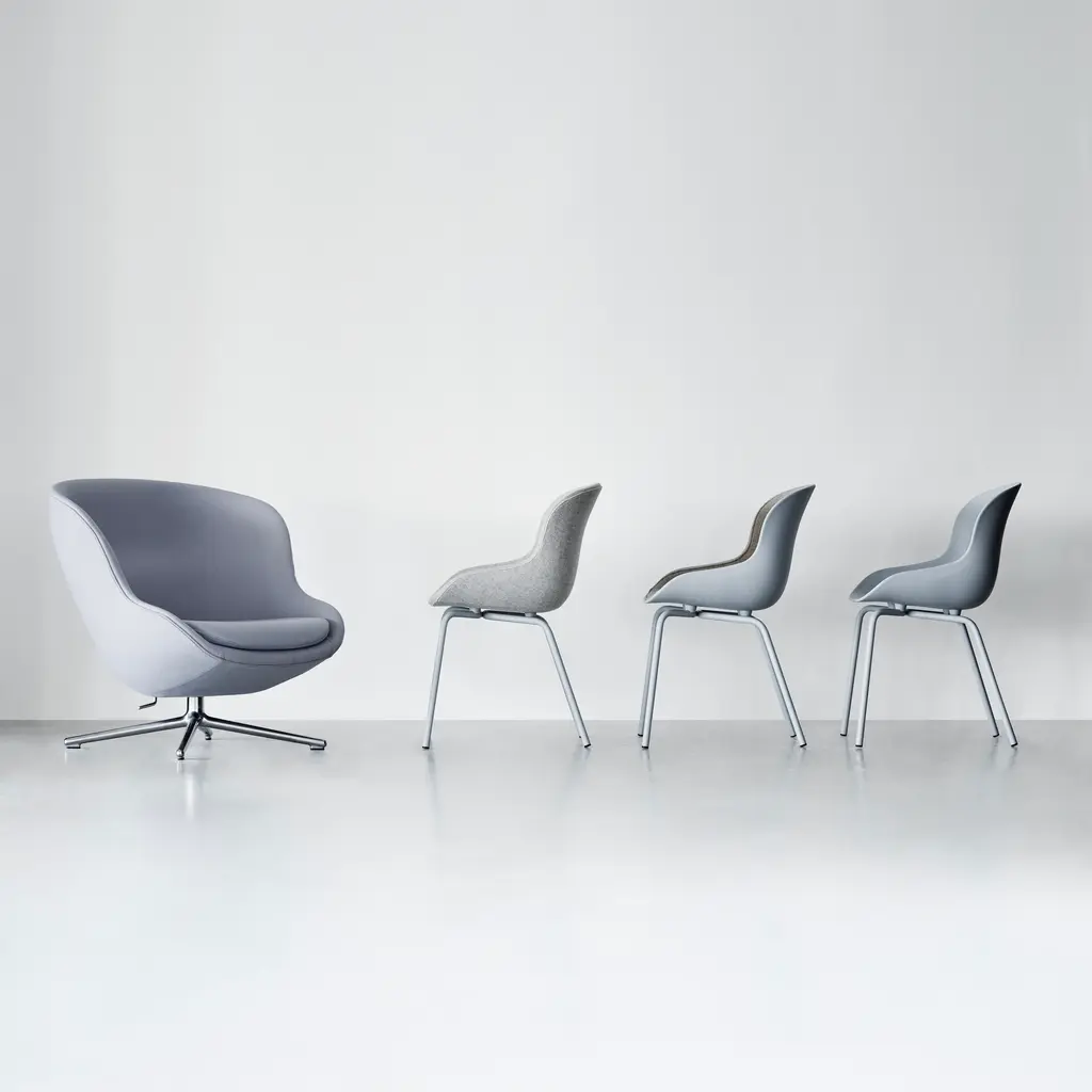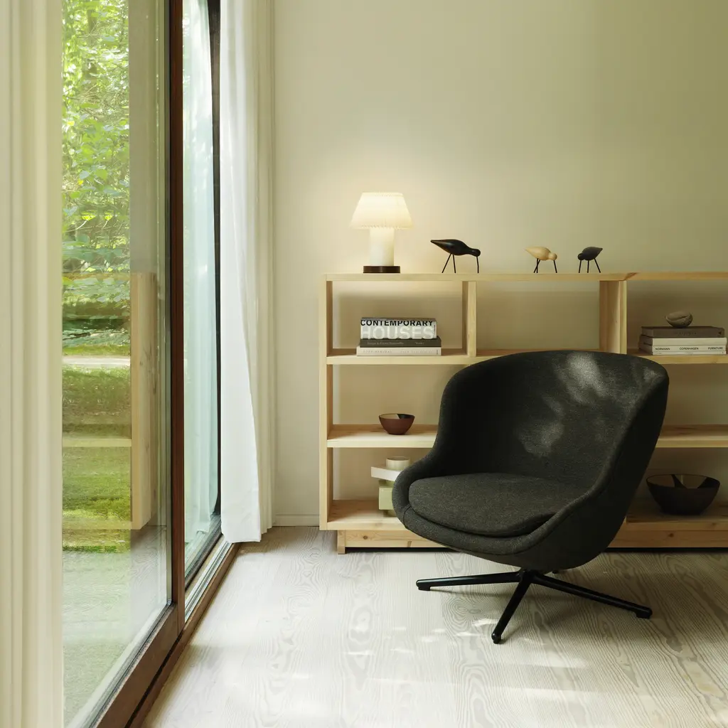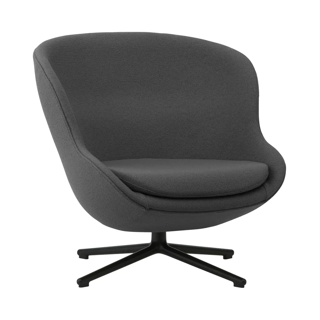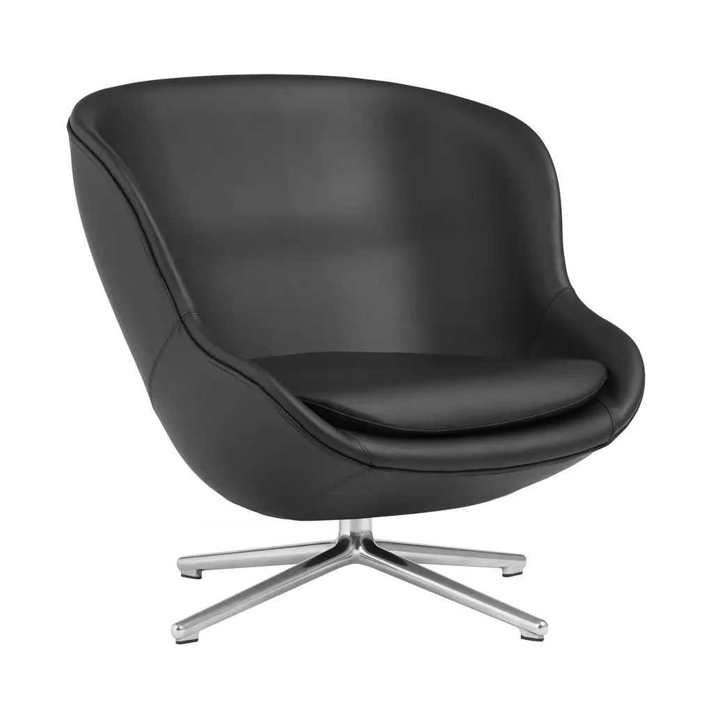 A swivel base brings added versatility to this lounge chair named for its virtues of coziness and calm. Hyg (short for the beloved Danish tradition of hygge) combines sheltering contours and a broad seat to accommodate a wide range of relaxed positions. Upholstery in a fine textile or rich leather enrobes the chair's concave shape, making for a luxurious respite for relaxation or intimate conversation.