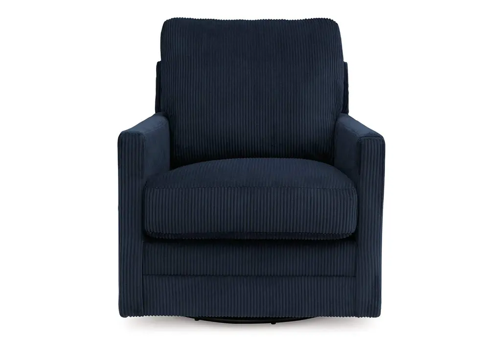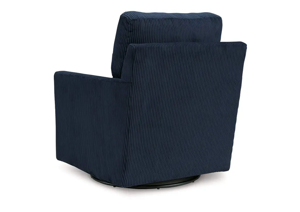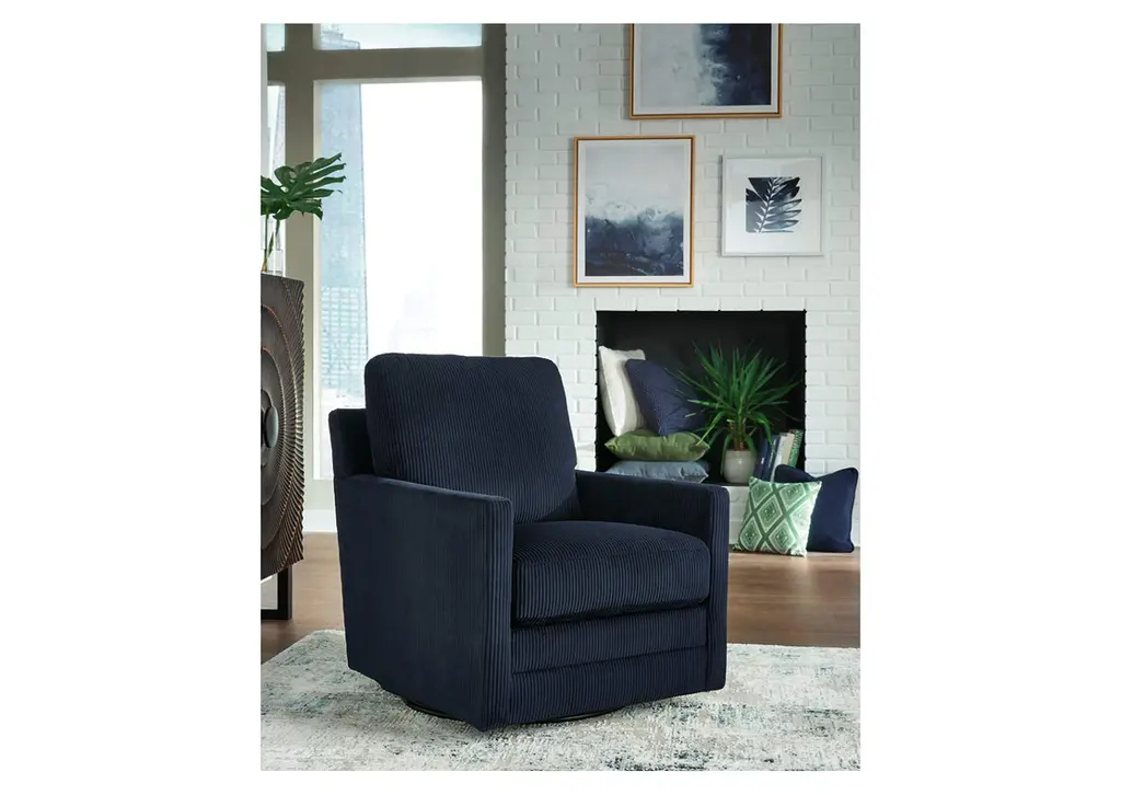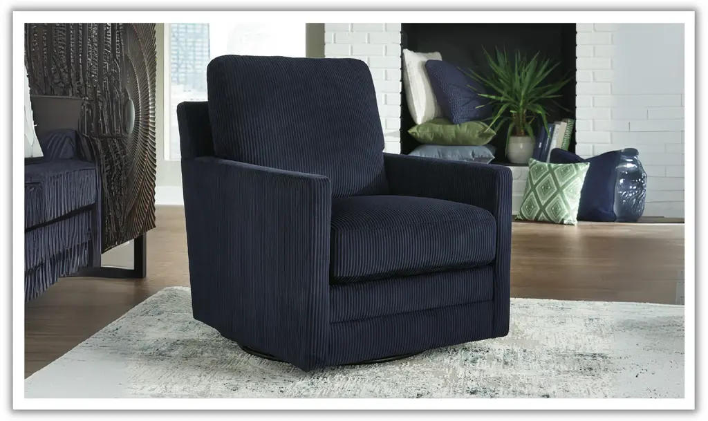 Clean-lined, contemporary style. Relaxed, homey comfort. The Icaman swivel chair has it all. Lightweight navy blue corduroy upholstery makes it a cozy yet head-turning piece. Factor in the 360-degree spin, and you've got a win-win. Weight 78.000 lbs. (35.1kgs.)