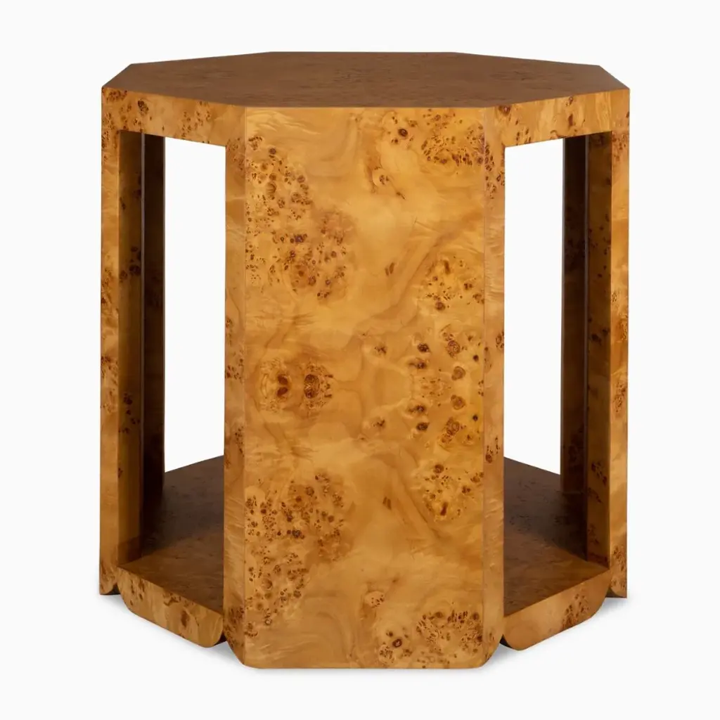 Swirling dark and light natural wood grains embody the beauty of this octagon burl wood side table. Open on every other side, it offers an airy component as well as an area for contents.