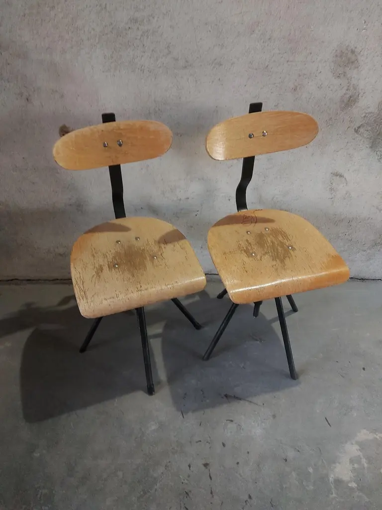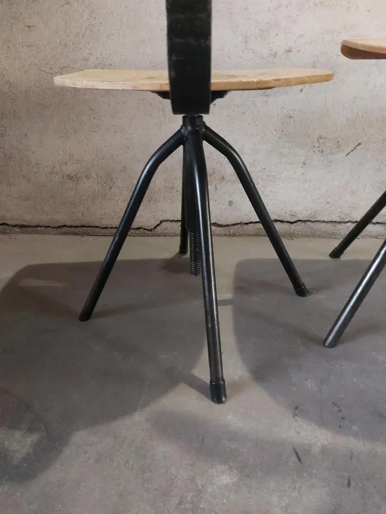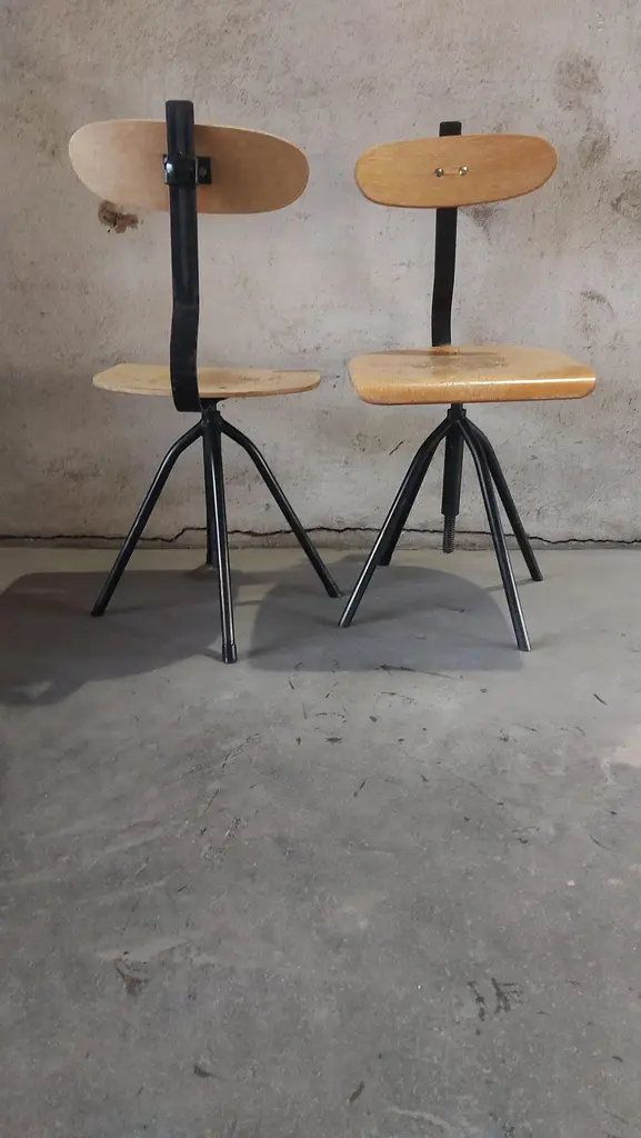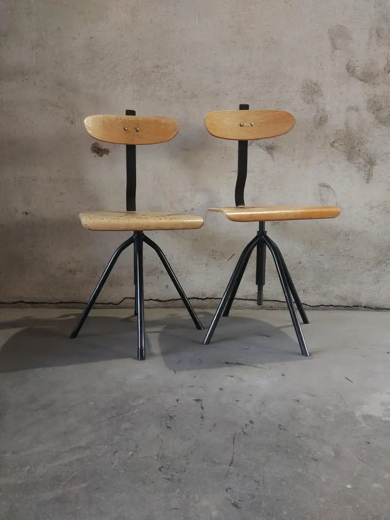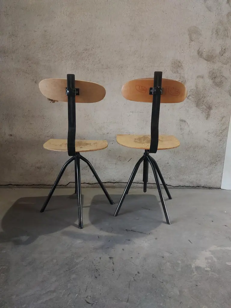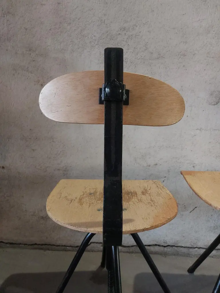 INDUSTRIAL swivel chair made in the 60s in Yugoslavia from metal and plywood. These kind of chairs were used in schools and workshops for working and teaching in engineering.Height adjustable from min 44 cm to maximum 60 cm, back height also adjustable turning a screw.Dimensions:Seat height from 41 cm to 60 cm.Condition:Beautiful patina on metal and wood. Great piece of furniture.