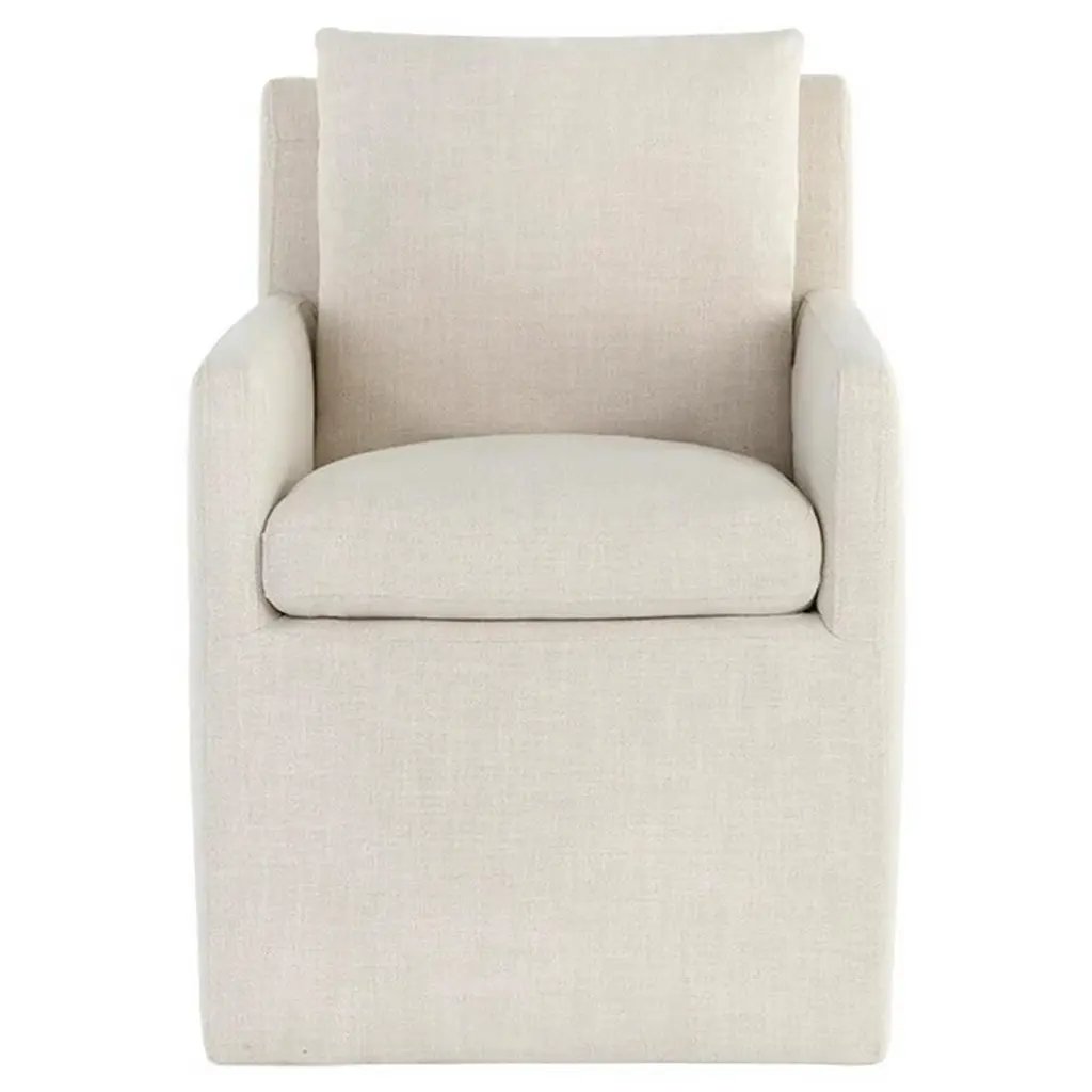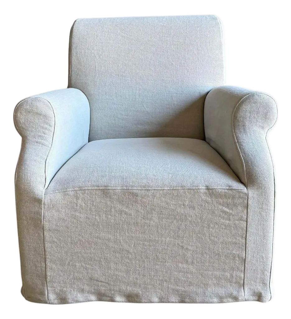 With comfortable cushioning and swivel functionality, the Iris swivel chair may just be the best seat in the house. Its timeless silhouette features simple lines, gently sloped arms, and a relaxed slipcover in a soft cream hue. Style this versatile piece on its own or as a pair to create a cozy seating area for two.