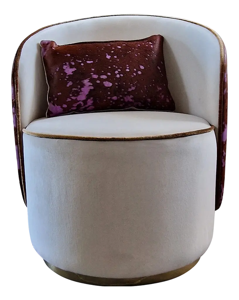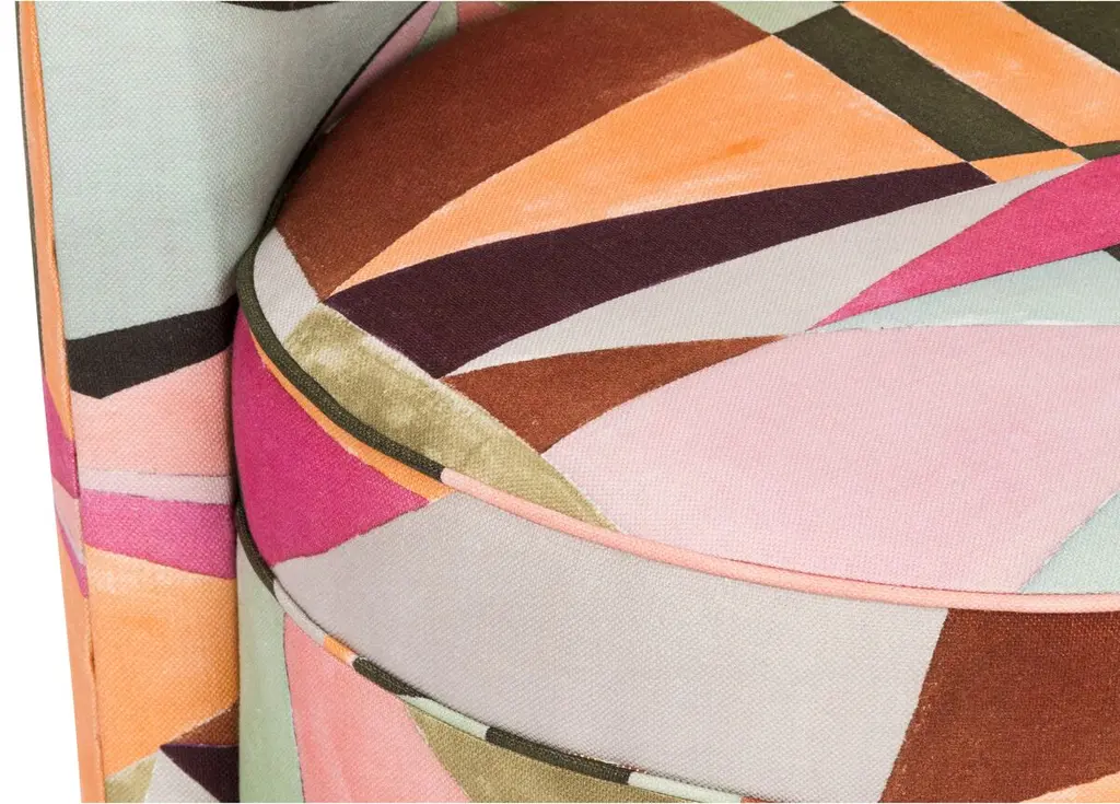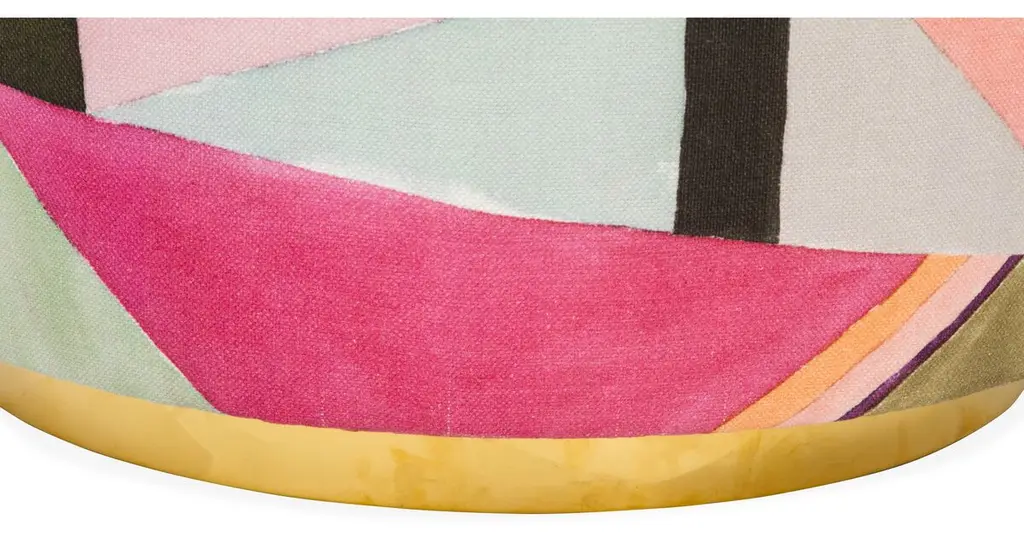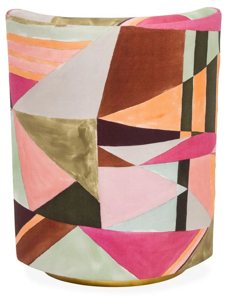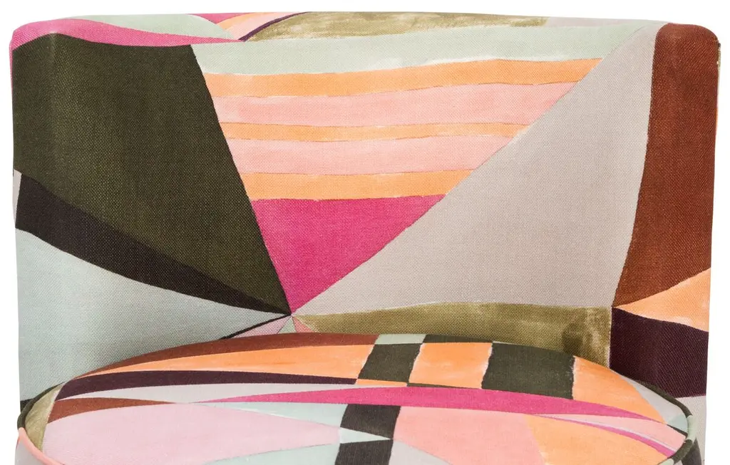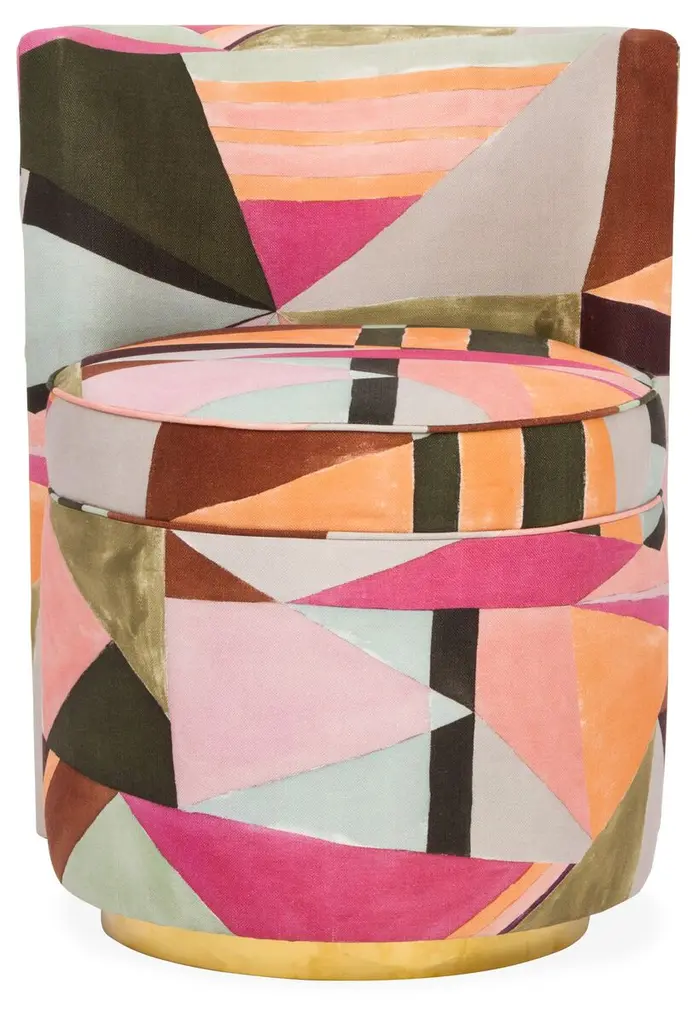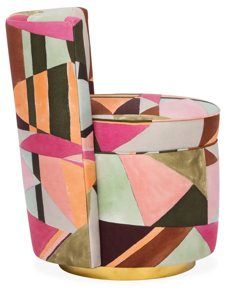 Perfectly proportioned for a vanity, this swivel chair boasts a modern silhouette, patterned upholstery, and brass finish on its round, recessed base. Generous foam-and-Dacron padding ensures long-lasting comfort and support. Handcrafted in the USA.