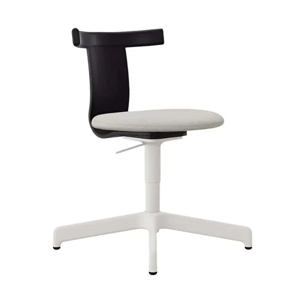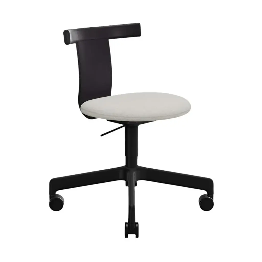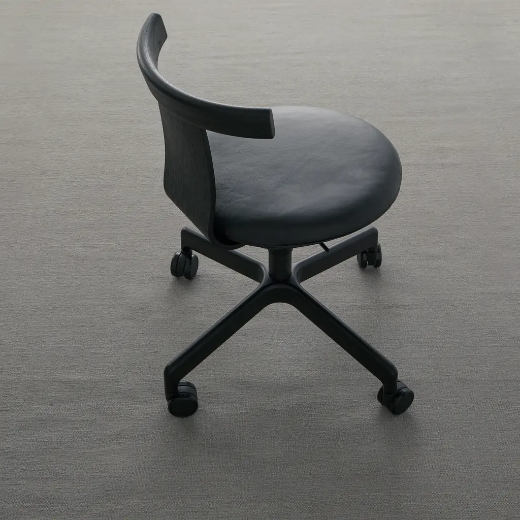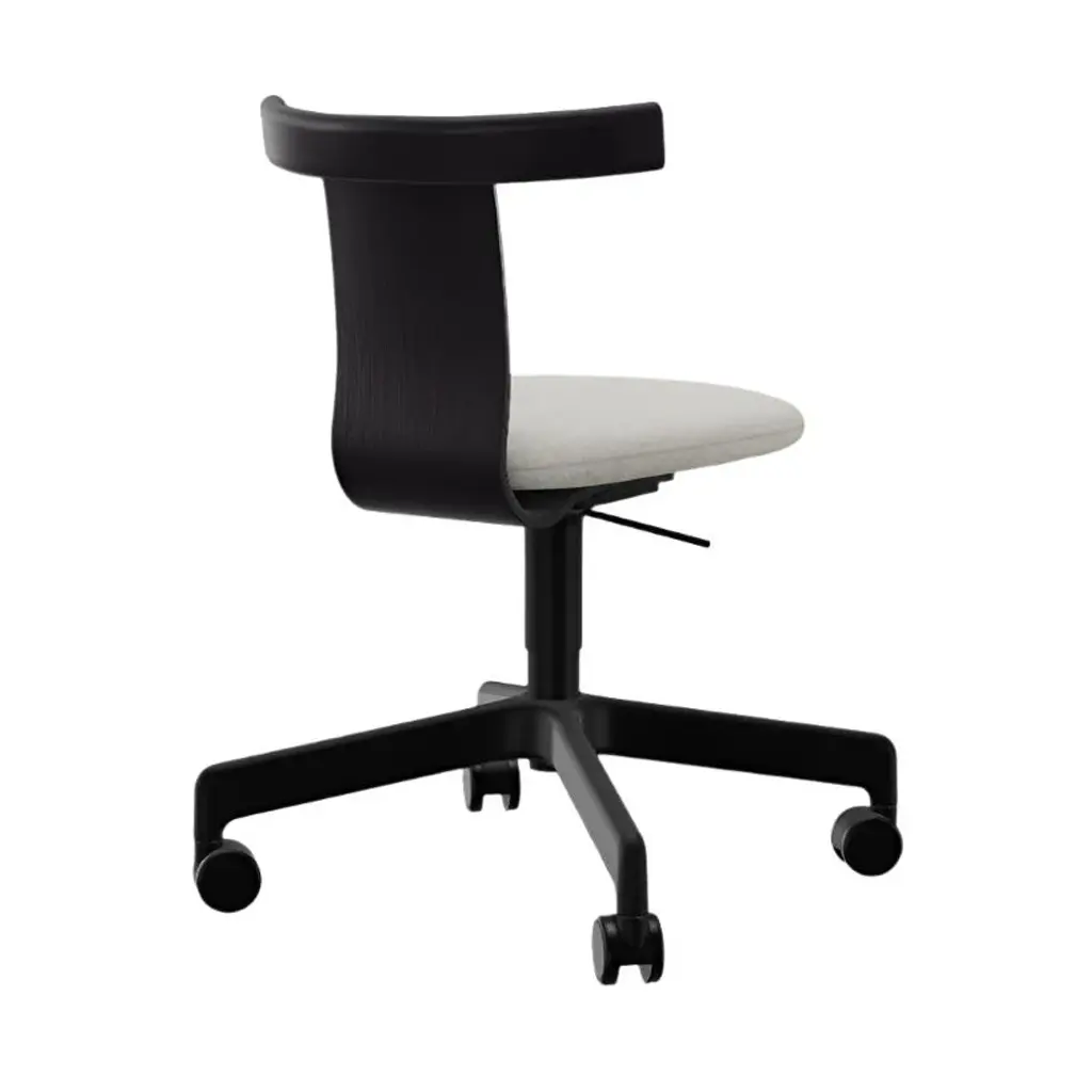Elevate your office or home work space with the Jiro Swivel Upholstered Chair from Resident. Its finely balanced oak construction and 4-star die-cast base offer ergonomic and responsive support. The concentric design and low back promote active movement and comfort. Choose from various configurations including casters and height adjustability for the ultimate seating experience. Highlights