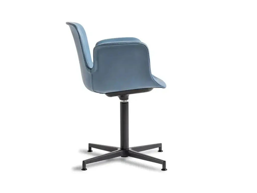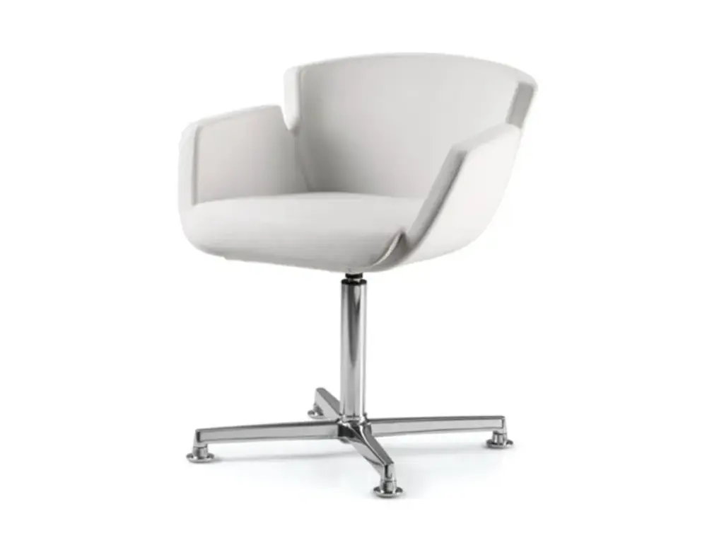 The apex of twenty years of creative experimentation by Werner Aisslinger, the Juli Soft armchair stands out for its sophisticated and elegant appearance.Fully upholstered in fabric, leather or eco leather, the Juli Soft armchair sits on top of a base that comes in following versions: a goblet base with a polished chrome finish, matte white, matte anthracite, or matte mud; with 4 ash legs with a bleached finish, oak stained, wengé stained, or black stained; with 4 or 5 aluminum legs in a polished aluminum version, matte white, matte anthracite, or matte mud; 4 tubular iron legs with a polished chrome, matte white, matte anthracite, or matte mud finish; with a sled base, with versions in polished chrome, matte white, matte anthracite, or a matte mud finish.Thanks to its remarkable stability, the robust injection-molded seat and the fresh, contemporary look, the Juli Soft armchair is the perfect solution for home and Contract settings, such as offices and restaurants.Structure shell made of linear polyethylene in a selection of colours: JBI white (RAL 9010), JNE black (RAL 9011), JBL blue (RAL 5007), JAR vermilion (RAL 2002), JVE green (RAL 6016), JFA mud (RAL 7006)Structure under the seat die-cast aluminium in a selection of finishes: 412 polished aluminium, 01 matt white, 48 matt anthracite, 71 matt mudColumn base swivelling or swivelling with return spring in a selection of finishes: 407 polish chrome, 01 matt white, 48 matt anthracite, 71 matt mud4 wooden legs base massive ashwood in a selection of colours: 113 bleached ash, 116 oak-stained ash, 115 wengé-stained ash, 112 black-stained ash4-5 spokes base in die-cast aluminium with plastic feet, swivelling or swivelling with return spring in a selection of finishes: 412 polished aluminium, 01 matt white, 48 matt anthracite, 71 matt mud4 metal legs/Sled base base metal tube in a selection of finishes: 407 polish chrome, 01 matt white, 48 matt anthracite, 71 matt mud