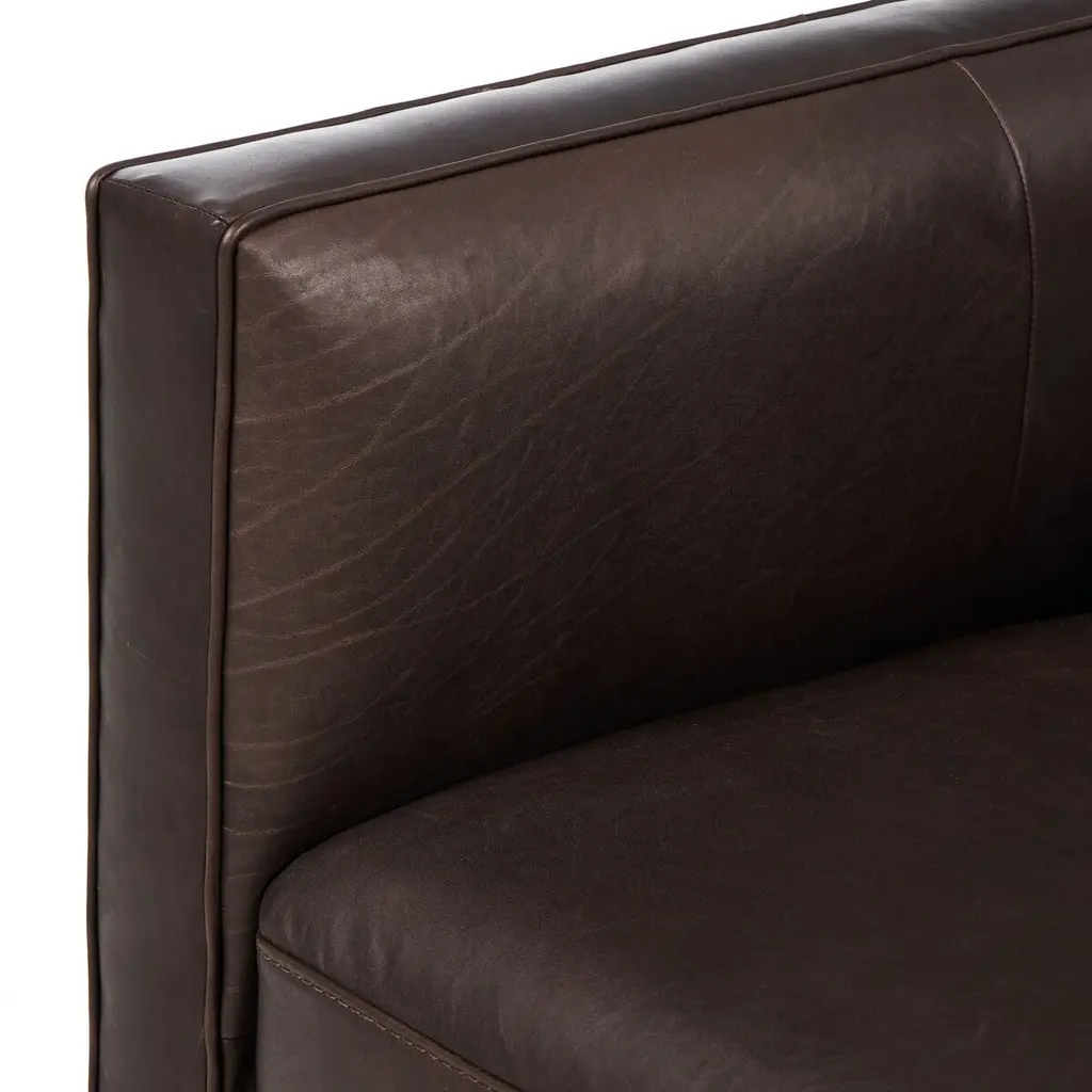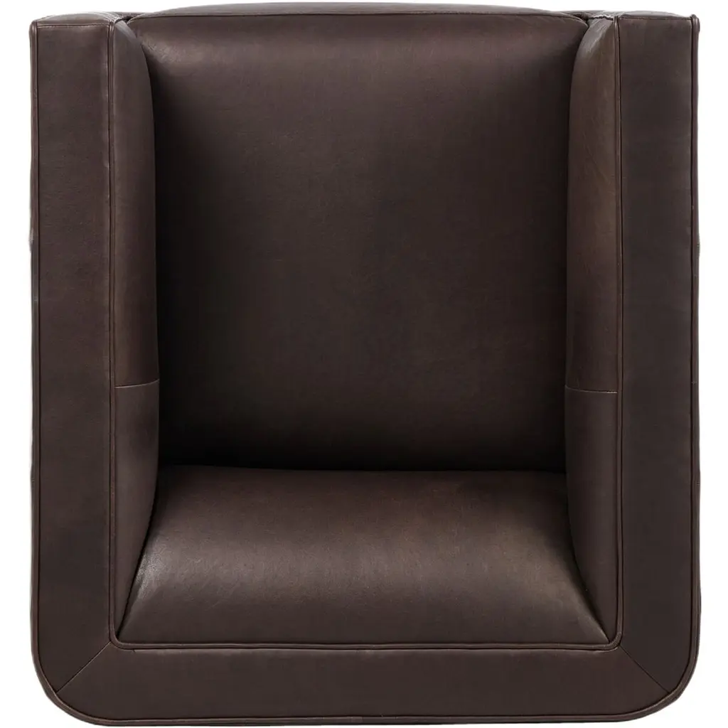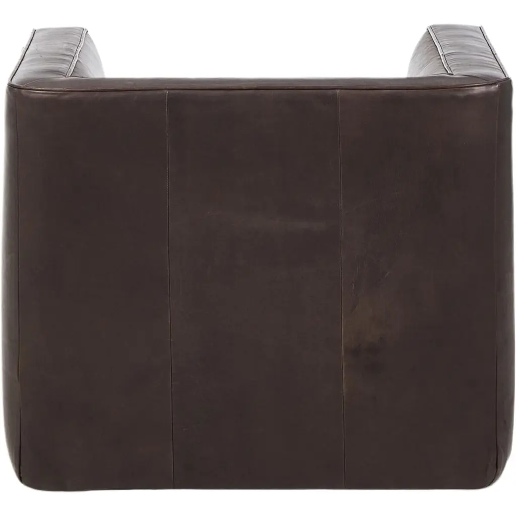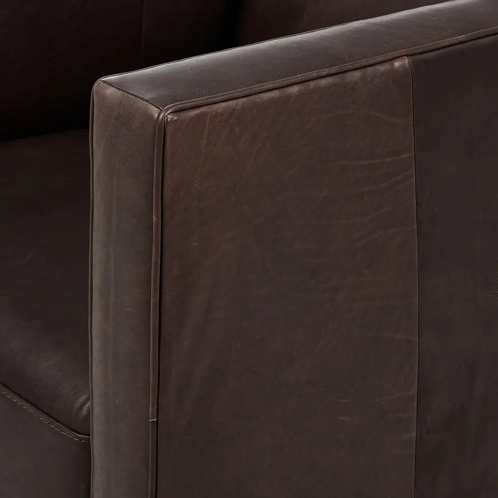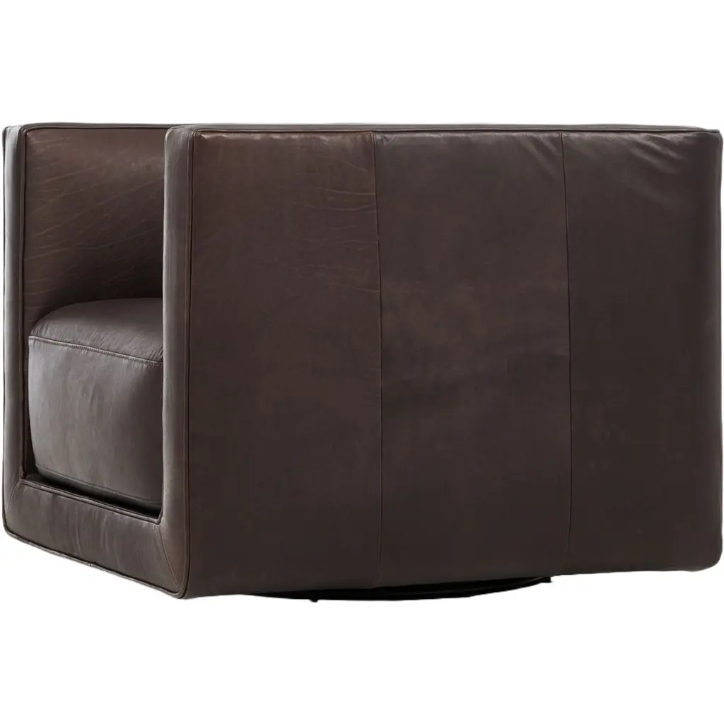 Style meets substance in this sleek swivel chair. Blind stitching along the seat and back cushions creates a polished complement to the heritage frame. The slight pronounced seat cushion creates an illusion of being loose, but is actually a fixed cushion with expert tailoring. A piping channel detail gives the arm a finished look. This chair is crafted with materials that showcase an abundance of natural markings and variations, resulting in beautifully supple, buttery soft textures with an unmatched depth of color and richness, offering an authentic lived-in look.