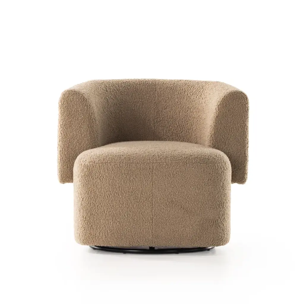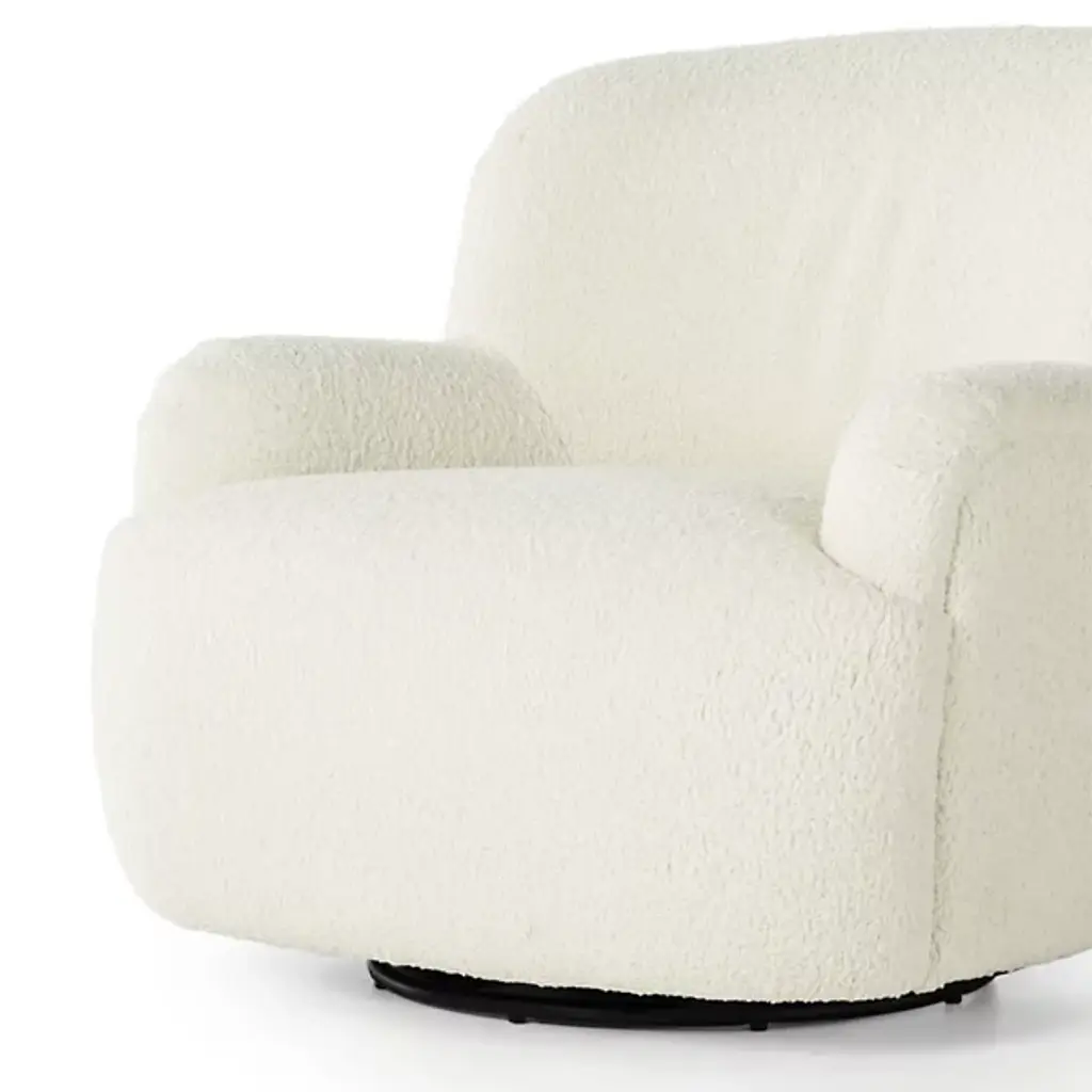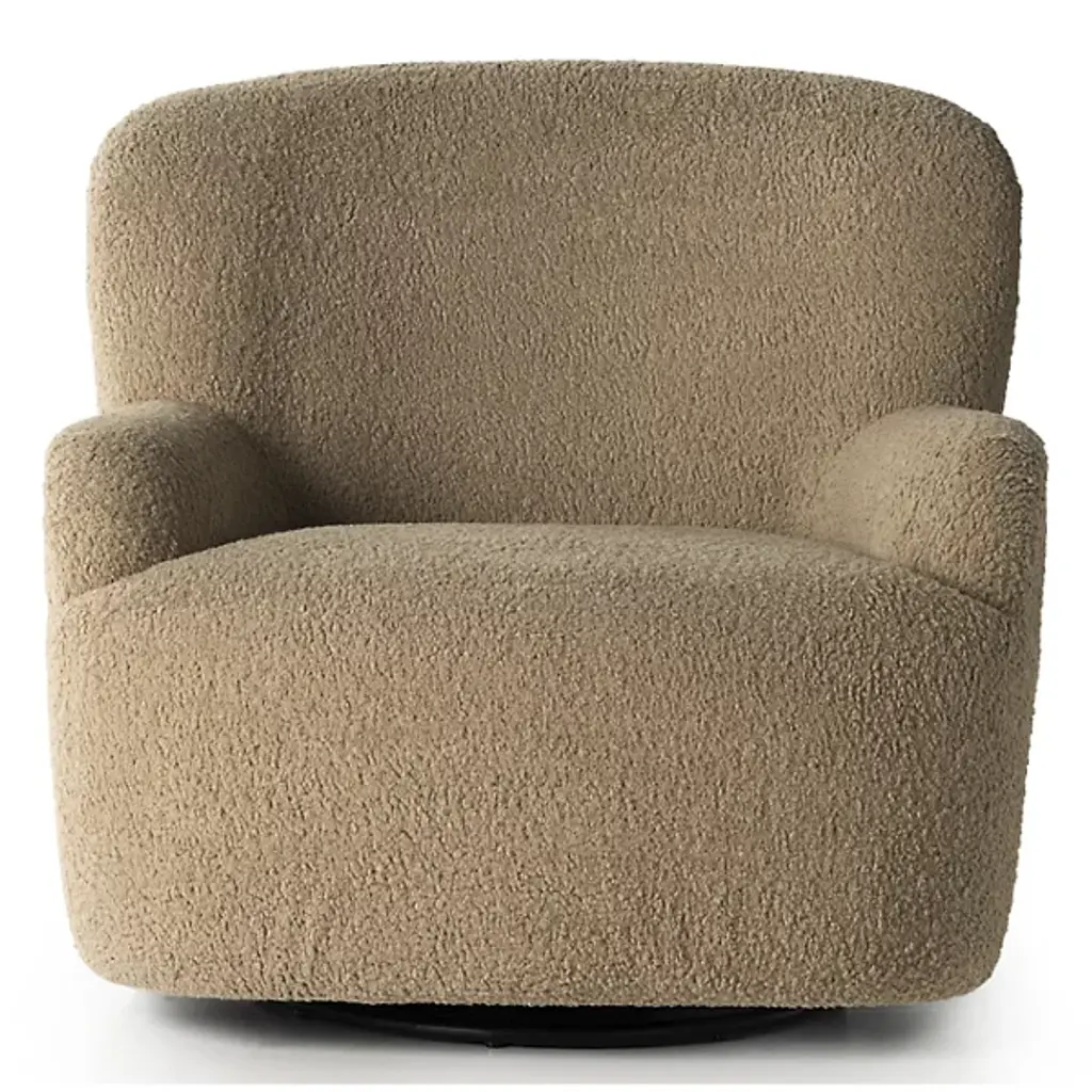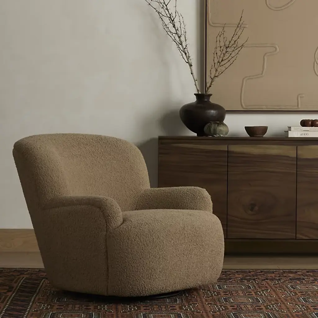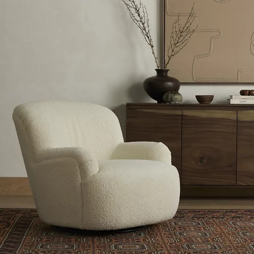 The Kadon Swivel Chair from Four Hands effortlessly embodies timeless elegance. It boasts a high wing back that harmonizes beautifully with softly rolled arms, creating a curvy silhouette that looks inviting and offers exceptional comfort. The shearling-upholstered seating provides a luxurious touch and sits atop a 360-degree swivel, enhancing its functionality. This design effortlessly merges classic aesthetics with modern convenience, making it a sophisticated addition to any space.