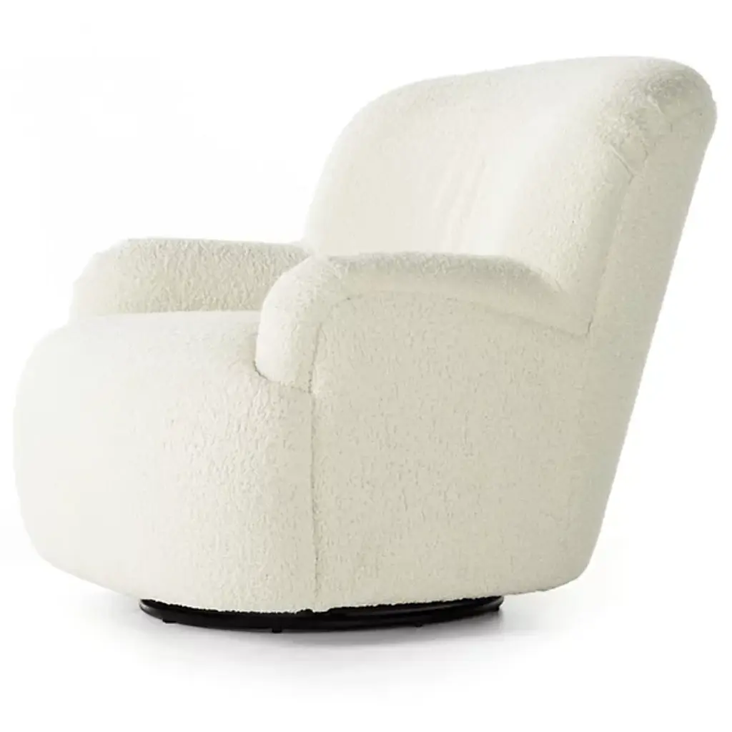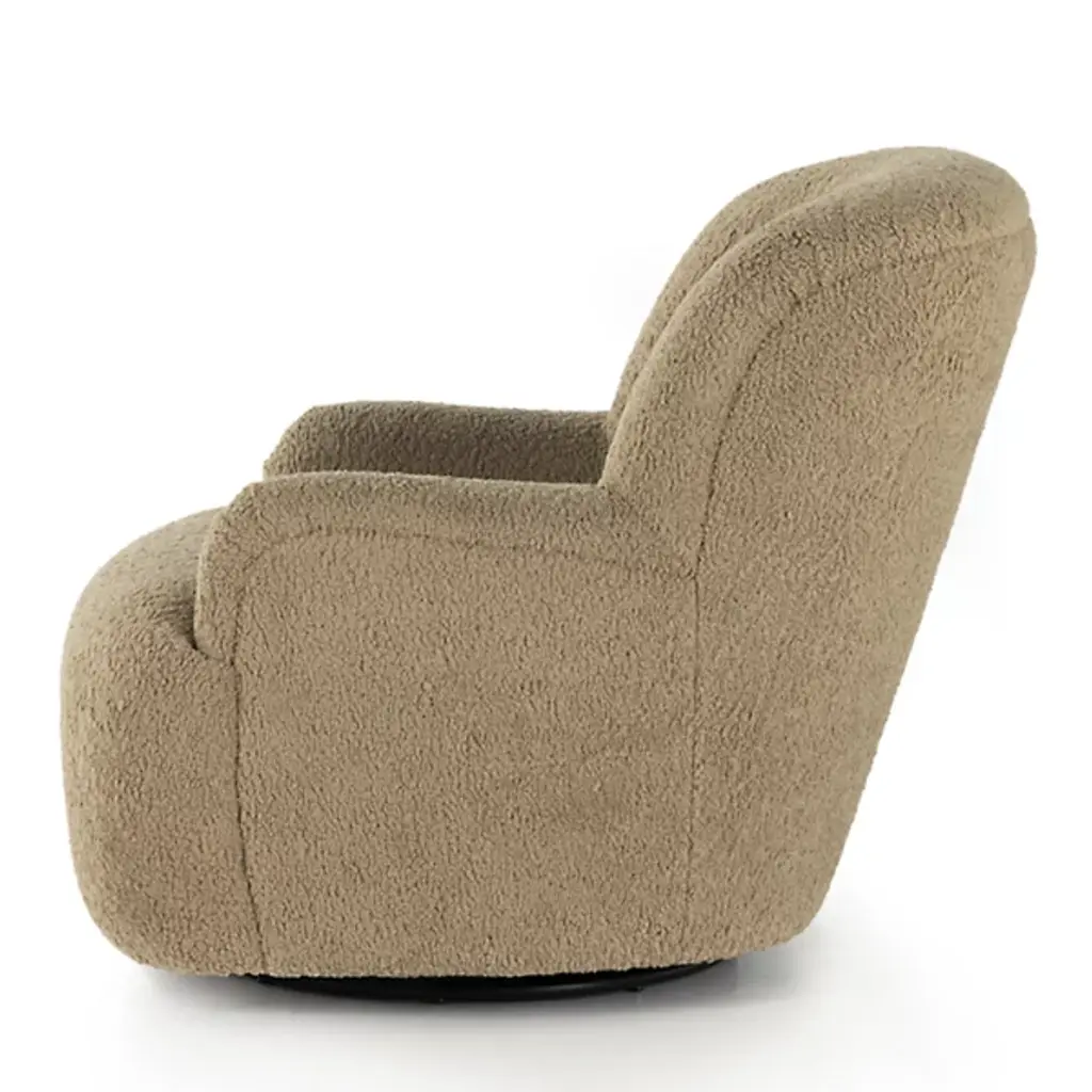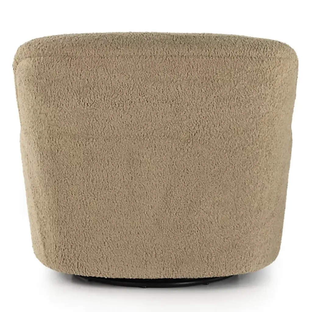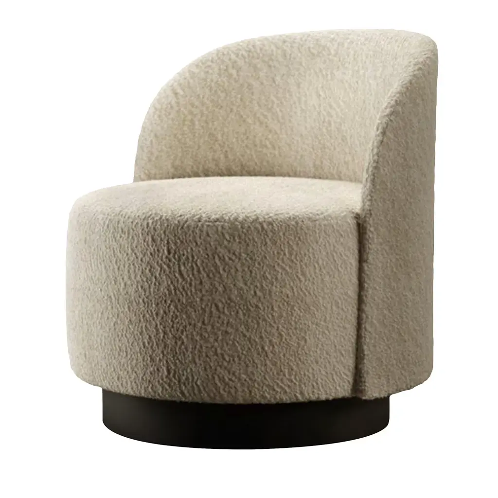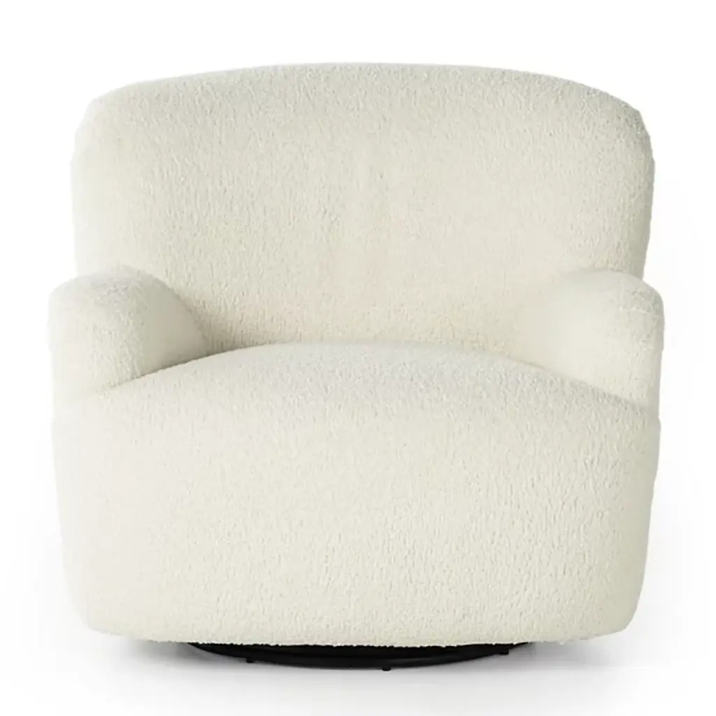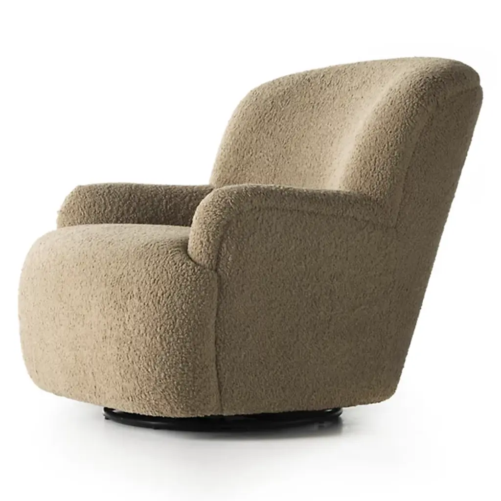 The Kadon Swivel Chair from Four Hands effortlessly embodies timeless elegance. It boasts a high wing back that harmonizes beautifully with softly rolled arms, creating a curvy silhouette that looks inviting and offers exceptional comfort. The shearling-upholstered seating provides a luxurious touch and sits atop a 360-degree swivel, enhancing its functionality. This design effortlessly merges classic aesthetics with modern convenience, making it a sophisticated addition to any space.