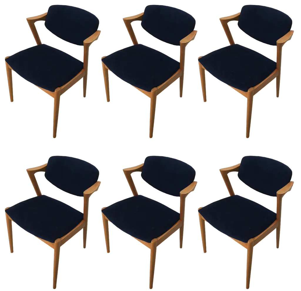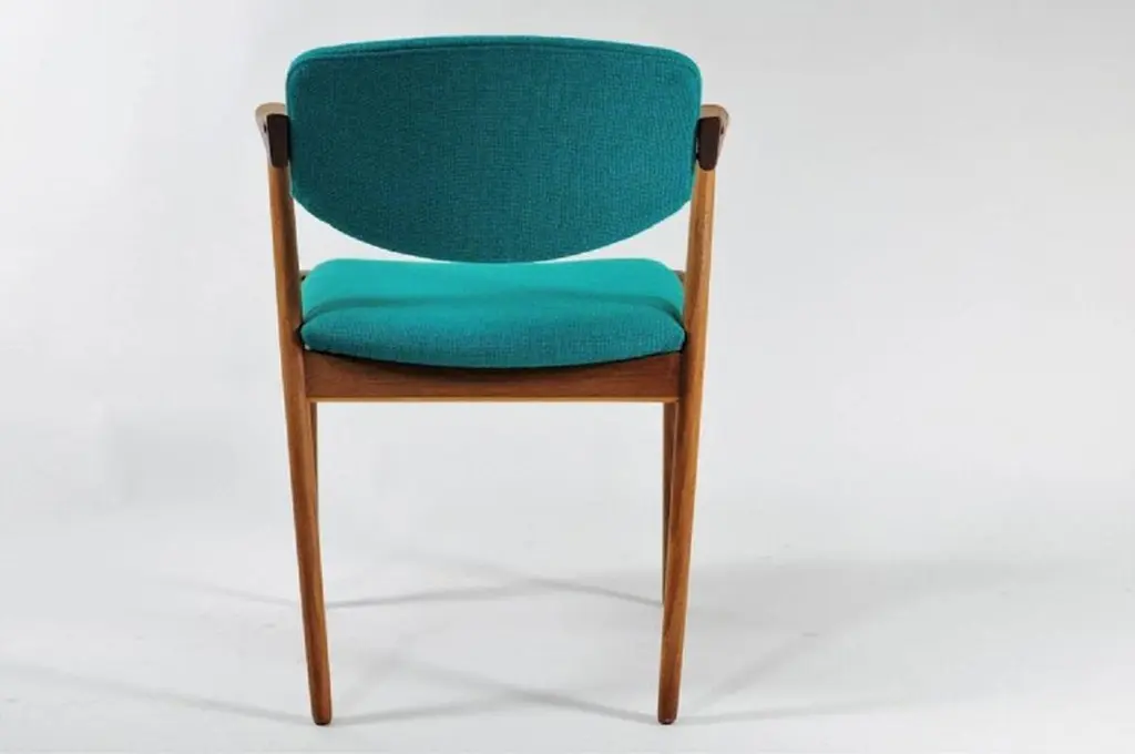 Set of eight fully restored, 1960s teak dining chairs by Kai Kristiansen for Schous Møbelfabrik.The chairs have Kai Kristiansens typical light and elegant design that make them fit in easily where you want them in your home - a design that was so uniqe that his colleague the famous designer Hans J. Wegner characterized model 42 as beautiful from all angles when the chair with it´s unique backrest swivel function was revealed in 1956.The chairs are in very good condition as they have been fully restored, all joints chacked and split apart if any signs of them getting loose, those that are split apart reglued under pressure, all other needed repairs made, sanded by hand 2 - 3 times and vaxed 2 - 3 times by our experienced workshop to insure that they are in very good condition with only minimal signs of age and use and will be reupholstered without additional cost in fabric a large selection of fabrics from "Kvadrat" / "Romo" or a large selection of leathers from "Sorensen Leather" / Ca-mo Leather".Kai Kristiansen was one of the last pupils of the famous architect Kaare Klint who founded modern Danish design and laid the foundation for the "Danish Modern" style. During the years 1958-78 Kristiansen worked in his business in Aarhus owned jointly by himself and furniture maker Illum Wikkelsø (1919-99). Kristiansens works met their most intense demand during a few decades from 1950, then production of them was discontinued. However, several of them are now being produced again by the Japanese furniture producer Miyazaki Chair Mill in Tokushima. An Australien producer has also included Kristiansen production in their portfolio. Kai Kristiansen might have been the originator of mass produced furniture, had he accepted an offer from Ikea-founder Ingvar Kamprad. He declined to let himself enroll in the Ikea staff.Kristiansen exhibitions include numerous participations in furniture and design shows in Milano, Paris, Cologne and London. Among his most cherished works is the Paper Knife collection, including two sofas, a coffee table and an armchair. His 4110 og Handy chairs are also widely sold. In fact, the Kai Kristiansen name is probably better known by a selected global furniture design public than it is known generally in his home country.