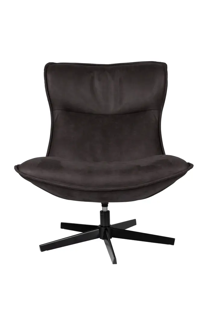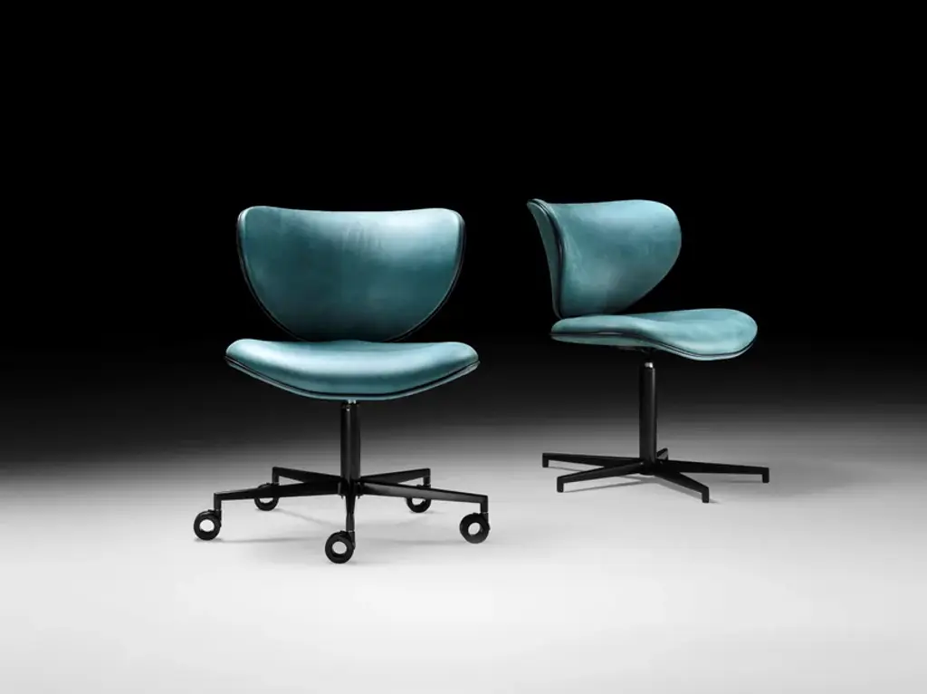 Kalida Office is a swivel leather chair with 5-spoke base. Leather: Denim col. 43. Chair with swivel base and seat, back in curved beech wood, padding in high-resilience expanded polyurethane. 5-point-star base in die-cast aluminium, painted matt black, with soft self-braking castors, or base without wheels with return device. Non removable cover.Precious and functional: in this version, the Kalida seating system reaches the maximum expression of practicality, designed specifically for business, contract and home office. With or without soft castors, which are optional for the 5-point-star base, Kalida gives elegance and refinement with its precious fabric combinations, in perfect Black Tie style.