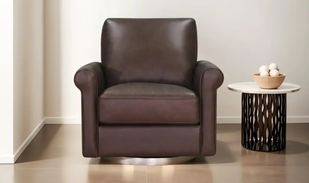 The Kent Leather Swivel Chair delivers classic, tall-back elegance in the much-desired, modern swivel relaxation mode. Enhance Kent's historical stature with your choice of supple Bassett leather upholstery, fit for a lifetime of warming to your touch. Its loose, boxed seat cushion is balanced by an enhanced plush back to offer secure comfort in this archetypal easy chair. Add even more classic styling with nailhead trim, an in-store option.