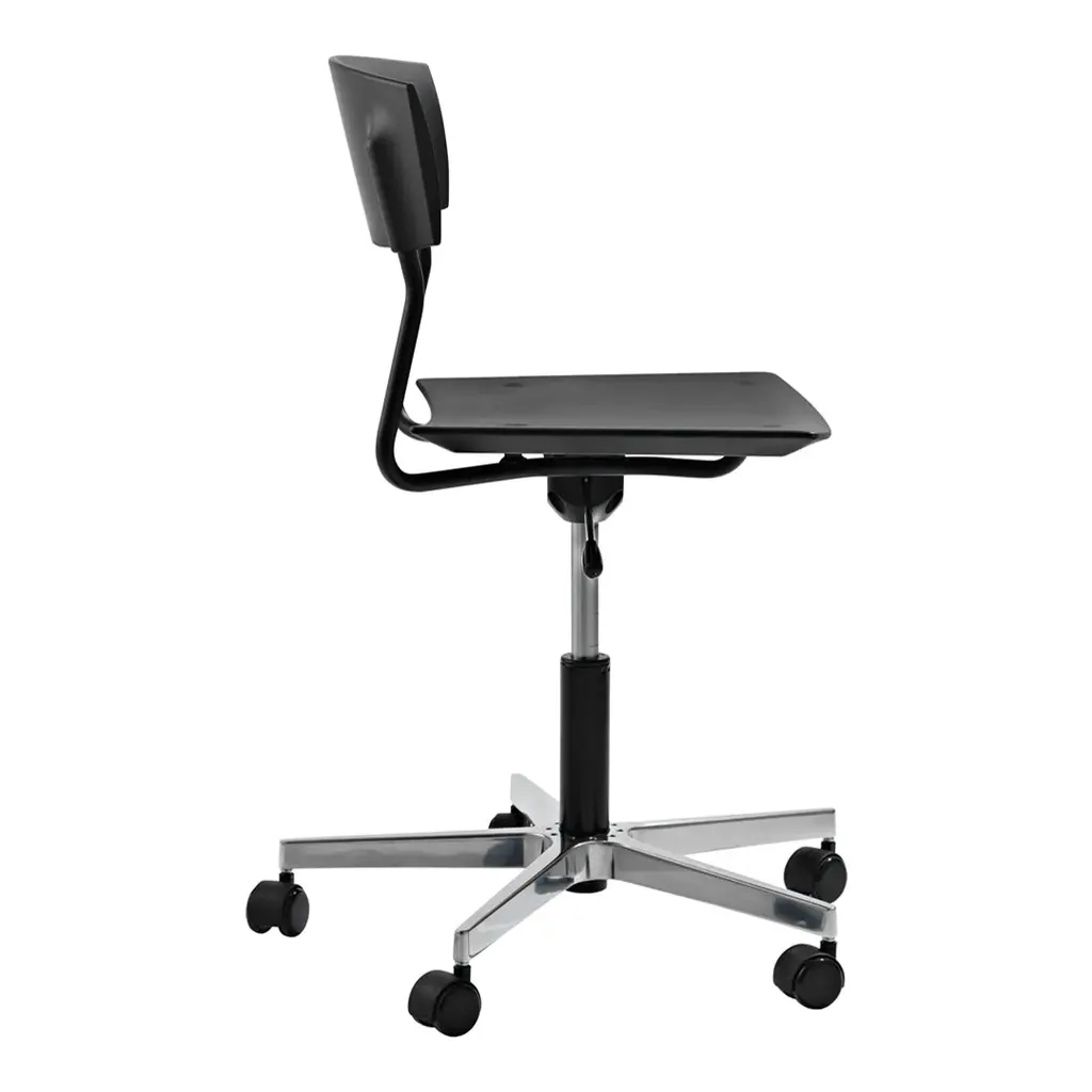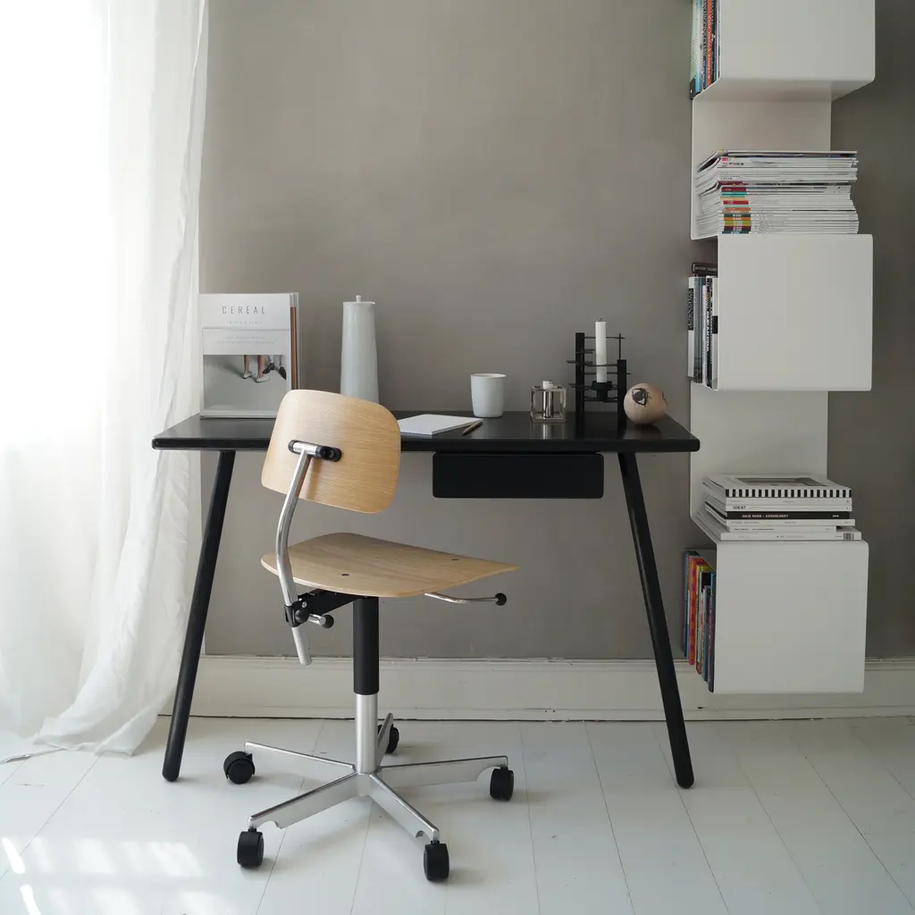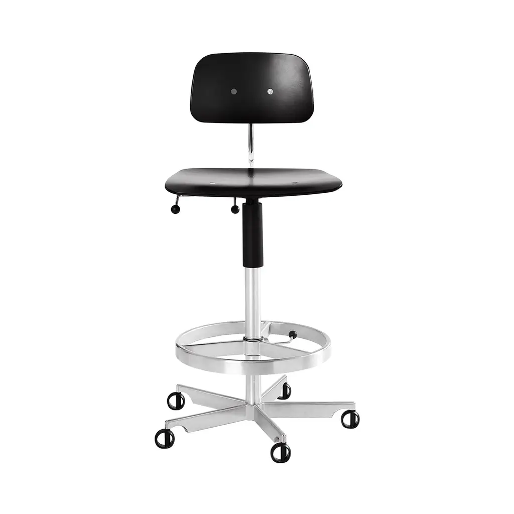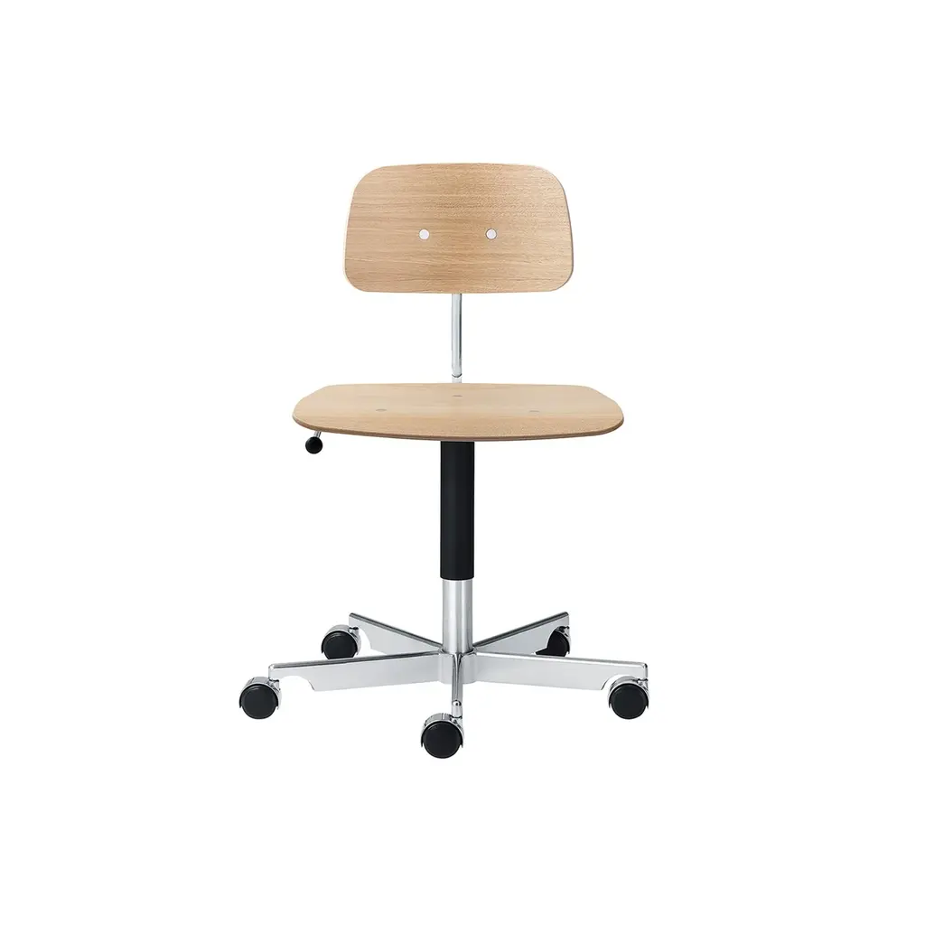 Spanning the decades, Kevi 2533 is the original design circa 1958 by Danish architect Jørgen Rasmussen. His now-iconic swivel chair stemmed from his belief that comfortable, supportive seating enhances the ability to get work done. Jørgen's design is a master stroke of function with its ergonomically curved wood backrest and seat. Available in oak veneers or black or white lacquer with optional seat and/or back upholstery in an array of premium textiles or leather. In 4 different seating heights, all with satin-finish aluminum base equipped with automatic adjustment and double-wheel castors, now an industry standard and also first introduced by Jørgen.
