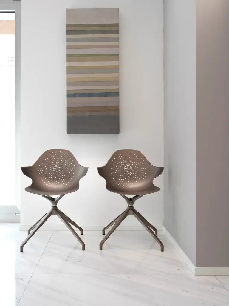 Klera is a swivel chair with armrests and an unique and playful design. Klera is a chairs and stools collection made of die-cast aluminum with a painted finishing. It is designed to adapt to different spaces, both indoor and outdoor. It changes its appearance according to the chosen colors: from a playful complement for a fun interior, to a professional piece of furniture for public areas.With a unique and playful design, Klera is a collection of chairs and stools collection madeof die-cast aluminum with a painted finishing. It is designed to adapt to different spaces, both indoor and outdoor. It changes its appearance according to the chosen colors: from a playful complement for a fun interior, to a professional piece of furniture for public areas.