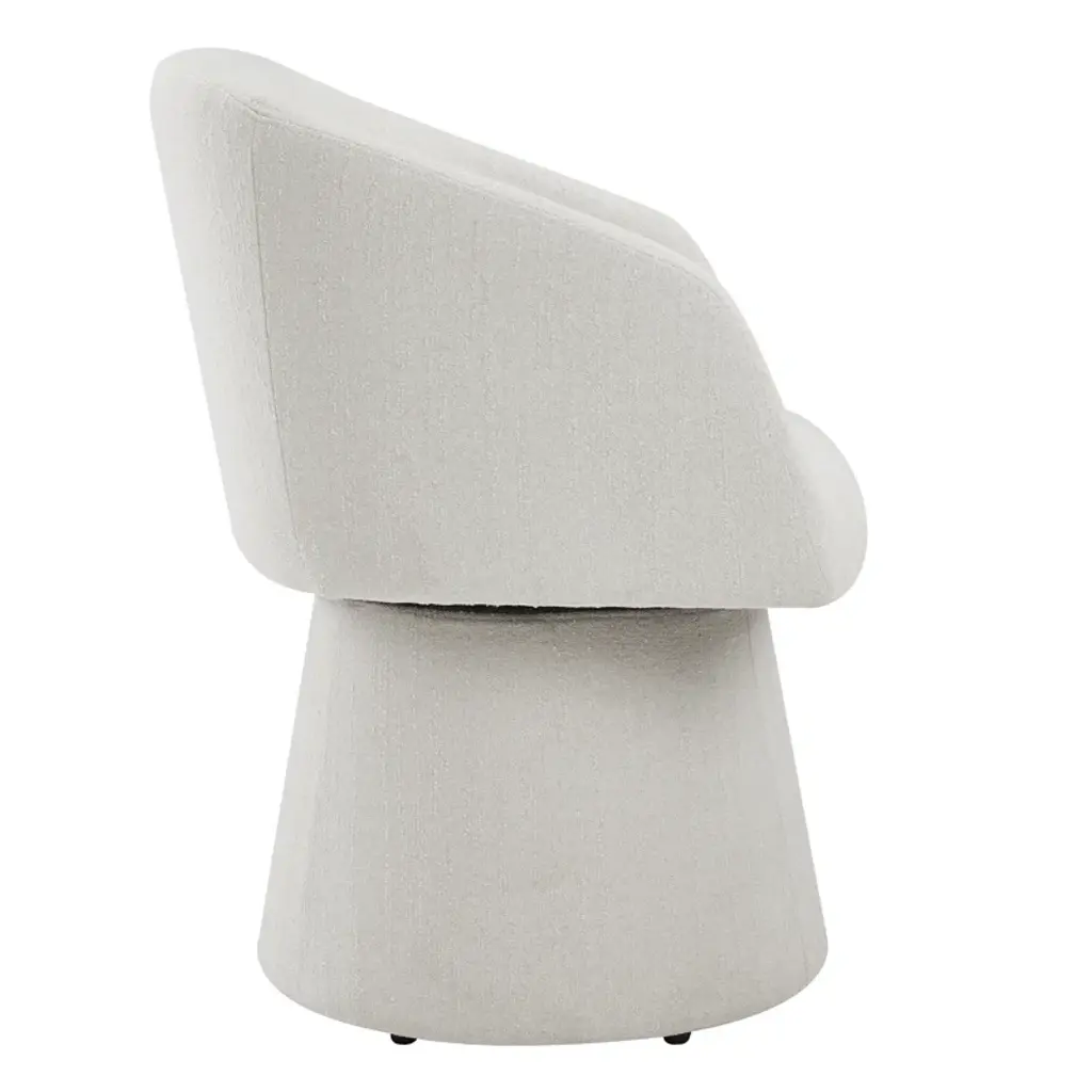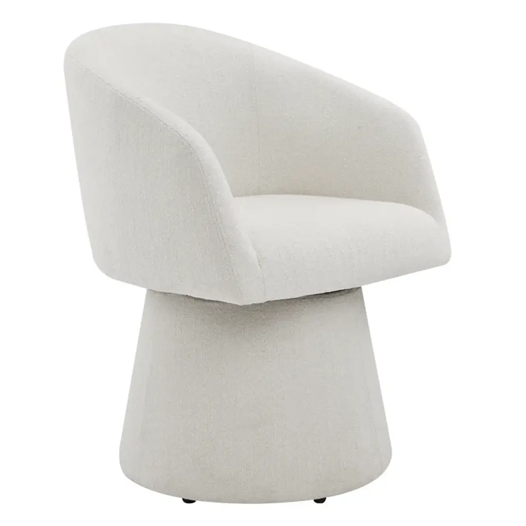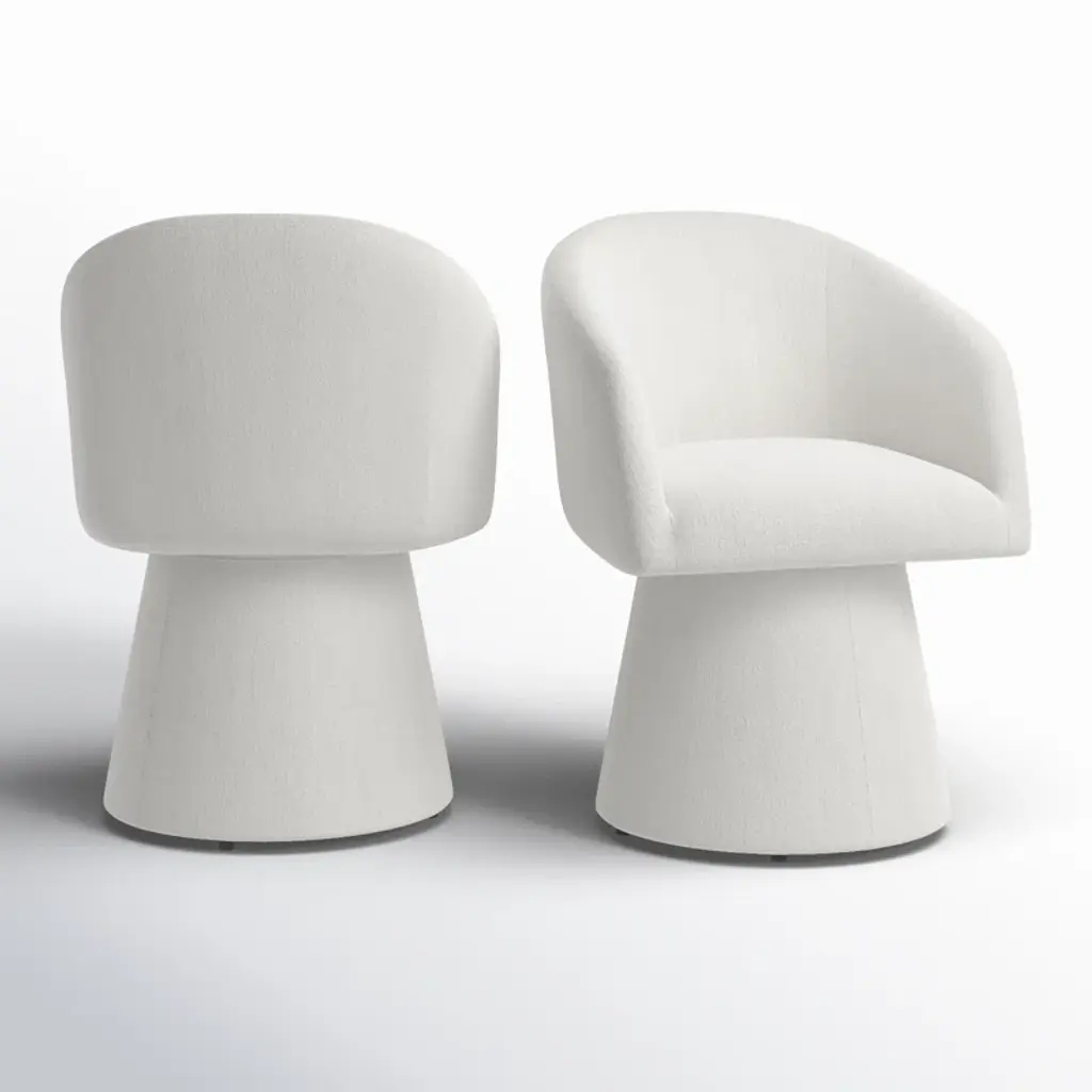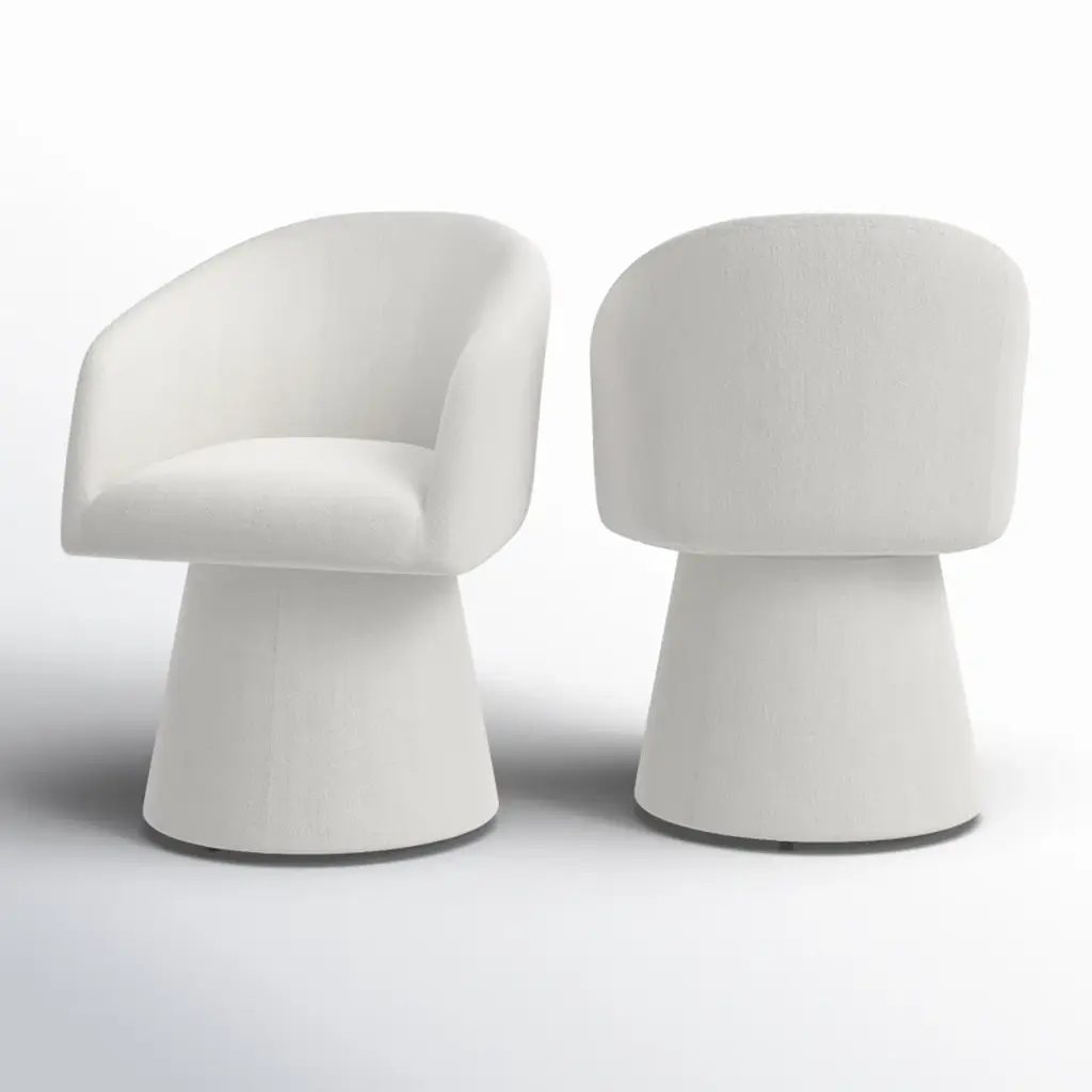 Swivel in style. These barrel armchairs wrap you in comfort with their curved backs, spacious seats, and high-density foam cushioning. Each one sits on a flared base with a smooth 360-degree swivel, offering both function + sculptural presence. Set of two.