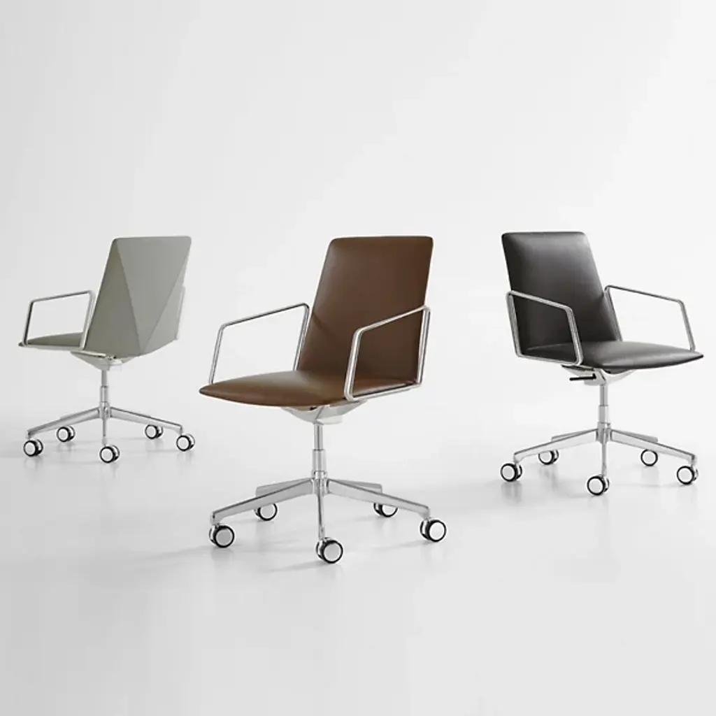 The L.A.M. Swivel Conference Chair from Bernhardt Design explores the interface between architecture and human form through contrasting geometries. A soft, curved interior nestles within a gently faceted exterior that remains visually understated. The organic seat juxtaposed with angular back elements creates engaging perspectives from every angle. Lievore Altherr Molina's design integrates swivel tilt mechanisms and pneumatic lift adjustment within the five-star base. Saddle stitching accentuates "V" shape details on the back, while full-grain leather construction complements the stainless steel framework.