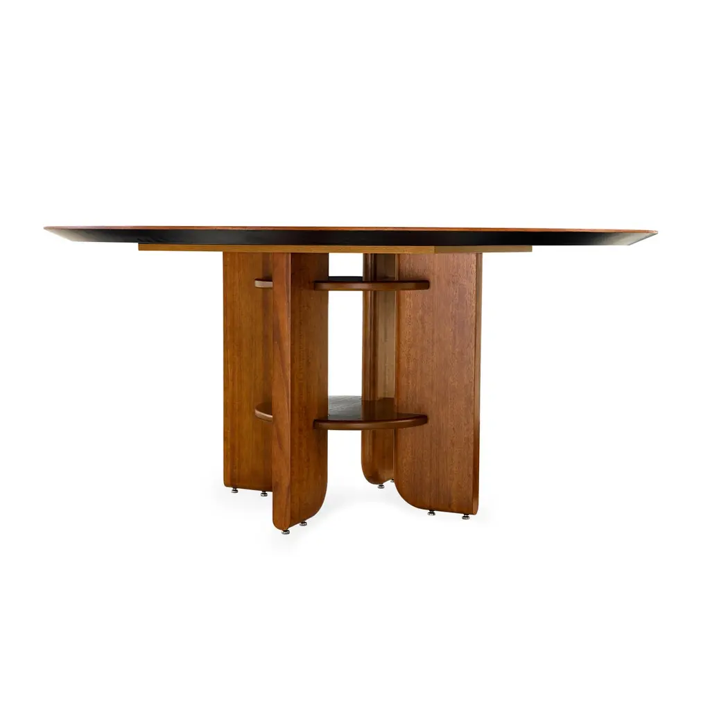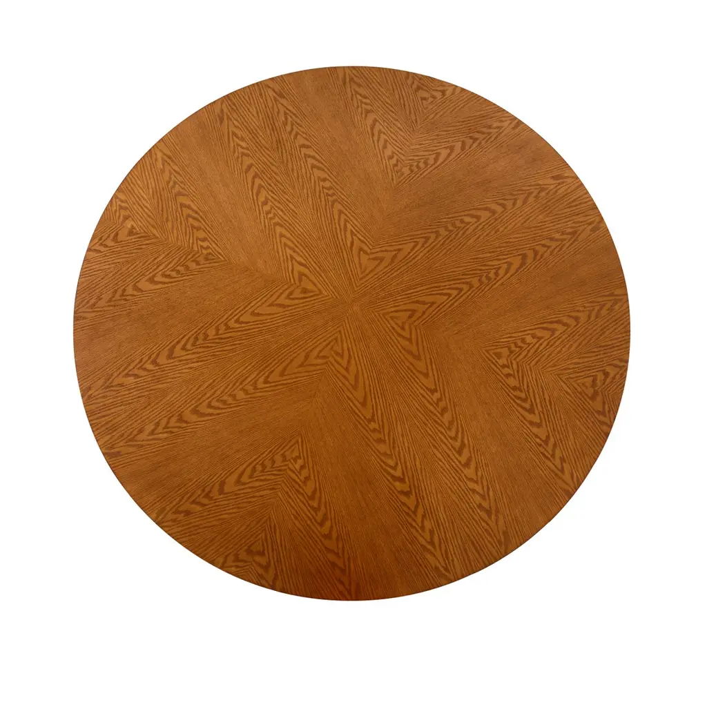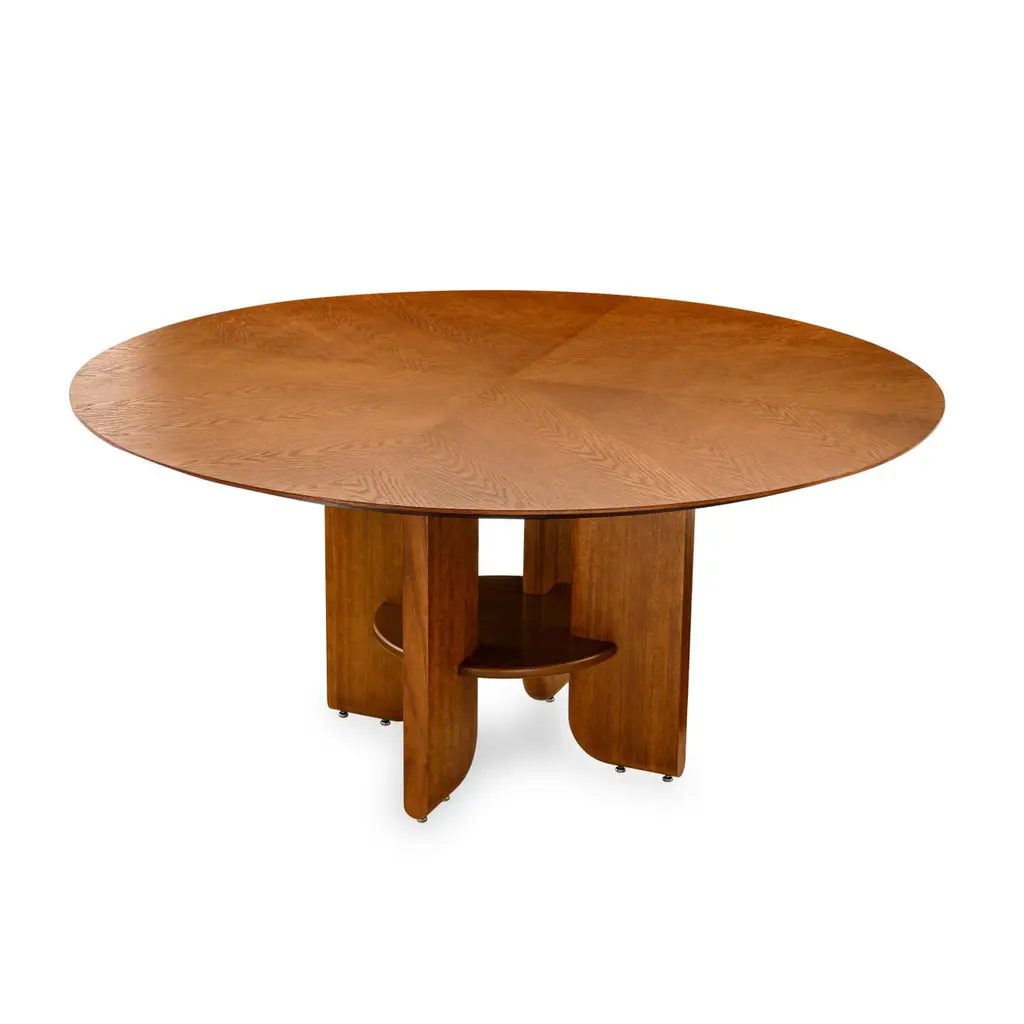 Art Deco style dining table by Uultis with almond oak veneered top measuring 63" of diameter and wooden legs. Please check availability prior to purchase.The "Moon" round dining table by Uultis exudes an elegant Art Deco style, blending modern design with timeless craftsmanship to create a stunning focal point for any dining space. Featuring an almond oak veneered top, this table is beautifully complemented by sturdy solid wood legs, which are interlocked with a unique fastening structure. This distinctive Art Deco-inspired design ensures superior stability and durability, while adding a touch of exclusivity and geometric sophistication. Perfect for both intimate meals and larger gatherings, the Moon table effortlessly creates a refined and inviting atmosphere, especially when paired with Uultis chairs.Crafted from sustainable and environmentally friendly materials, the Moon table reflects Uultis’s commitment to quality and eco-friendliness. Its solid wooden legs and veneered top, with clean lines and a strong profile, are built to last, making this table a practical yet stylish centerpiece for any home. The option to include a swivel disc tabletop adds versatility, allowing you to tailor the table to your needs and enhance its Art Deco charm.Assembly is straightforward, with detailed step-by-step instructions included, allowing you to enjoy its beauty and functionality right away. Whether in a dining room, kitchen, or open-concept space, the Moon round dining table promises to elevate any interior with its Art Deco elegance and robust construction.