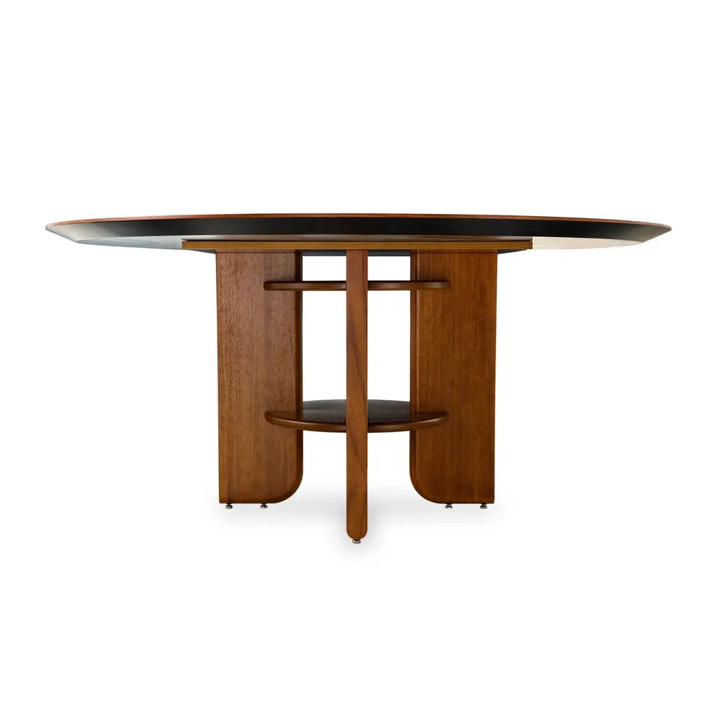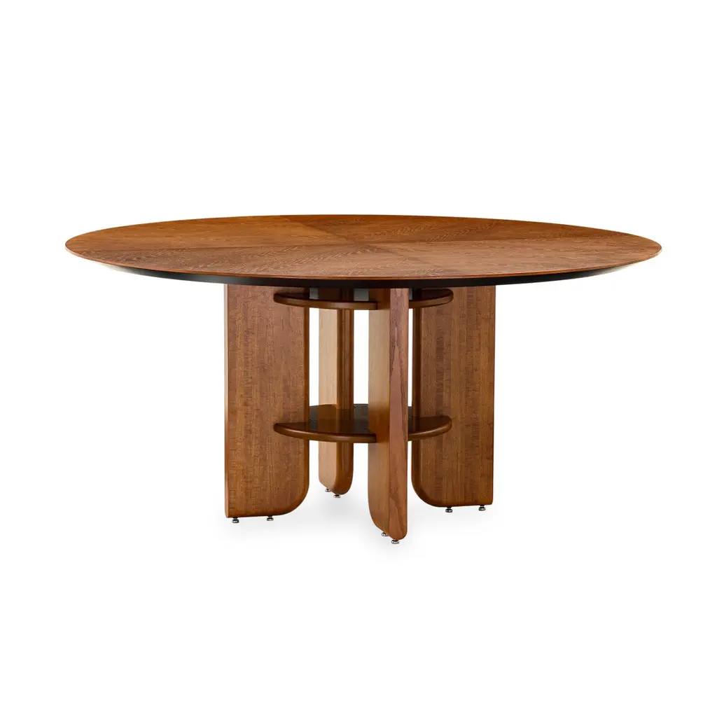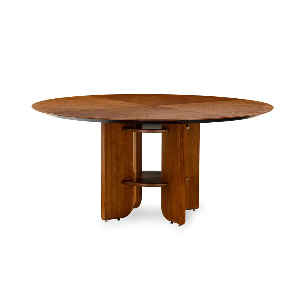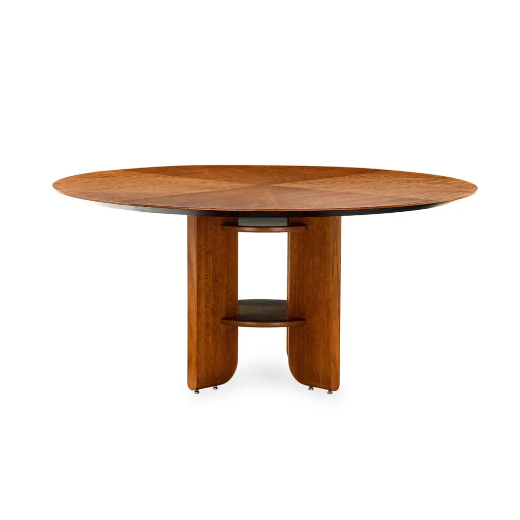 Art Deco style dining table by Uultis with almond oak veneered top measuring 63" of diameter and wooden legs. Please check availability prior to purchase.The "Moon" round dining table by Uultis exudes an elegant Art Deco style, blending modern design with timeless craftsmanship to create a stunning focal point for any dining space. Featuring an almond oak veneered top, this table is beautifully complemented by sturdy solid wood legs, which are interlocked with a unique fastening structure. This distinctive Art Deco-inspired design ensures superior stability and durability, while adding a touch of exclusivity and geometric sophistication. Perfect for both intimate meals and larger gatherings, the Moon table effortlessly creates a refined and inviting atmosphere, especially when paired with Uultis chairs.Crafted from sustainable and environmentally friendly materials, the Moon table reflects Uultis’s commitment to quality and eco-friendliness. Its solid wooden legs and veneered top, with clean lines and a strong profile, are built to last, making this table a practical yet stylish centerpiece for any home. The option to include a swivel disc tabletop adds versatility, allowing you to tailor the table to your needs and enhance its Art Deco charm.Assembly is straightforward, with detailed step-by-step instructions included, allowing you to enjoy its beauty and functionality right away. Whether in a dining room, kitchen, or open-concept space, the Moon round dining table promises to elevate any interior with its Art Deco elegance and robust construction.