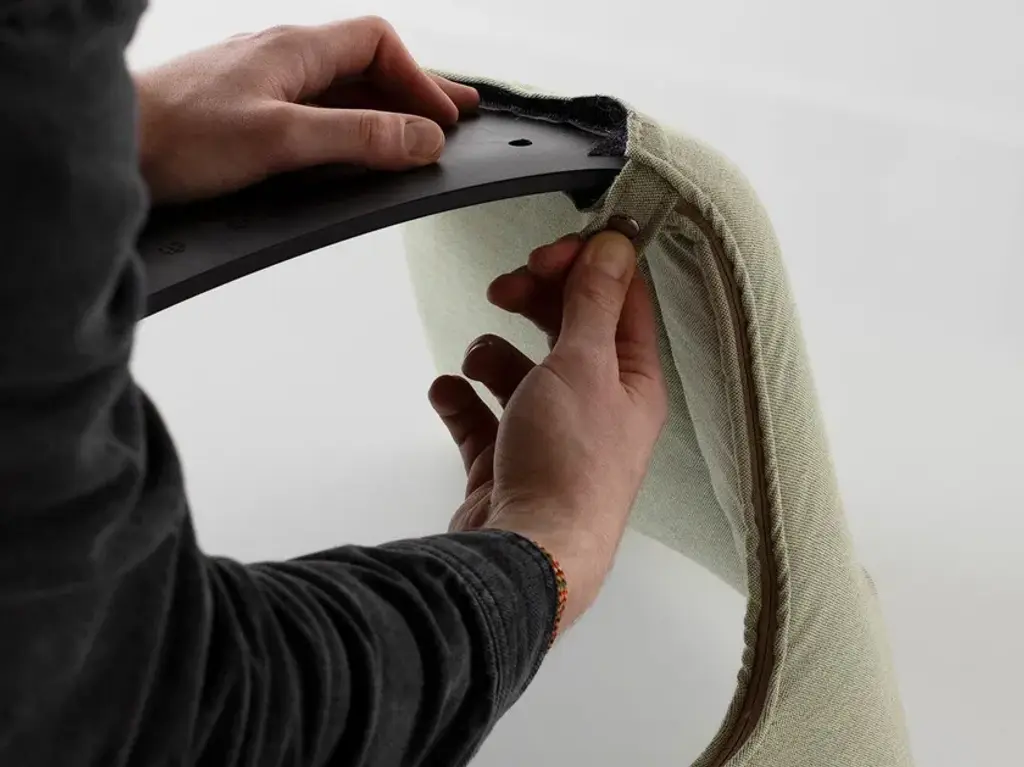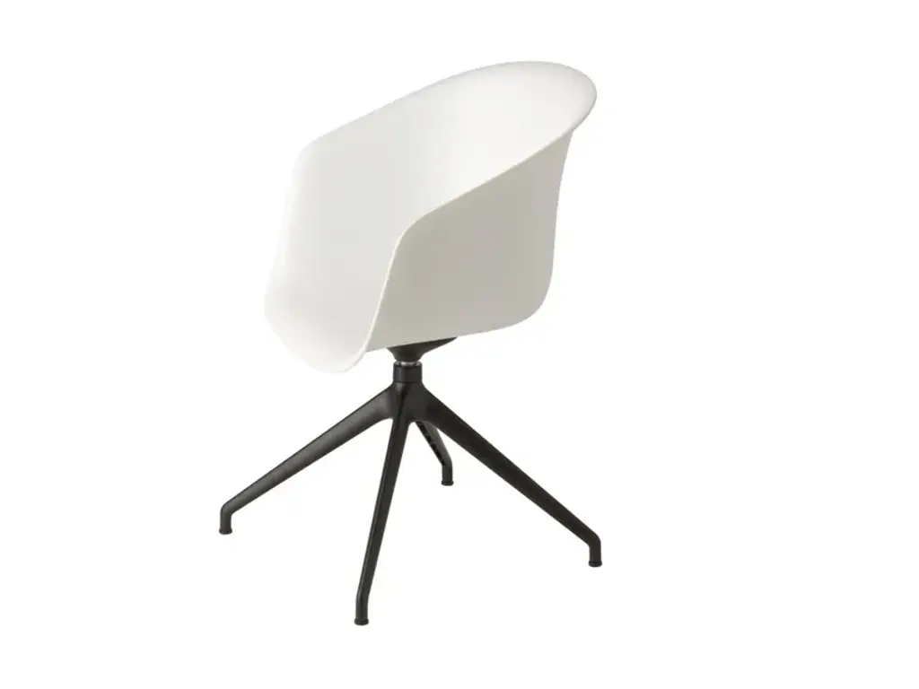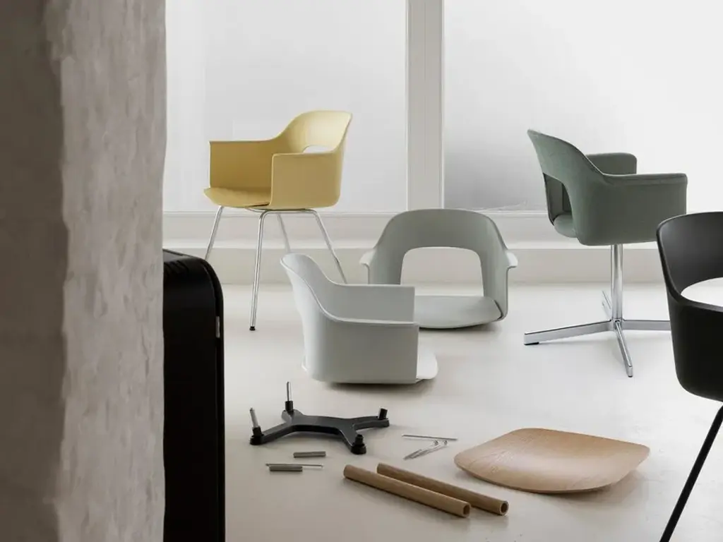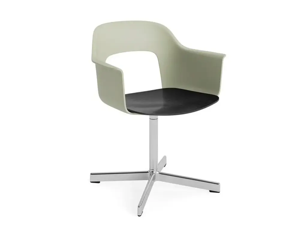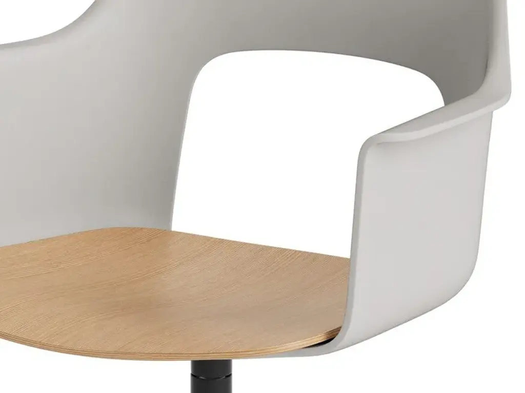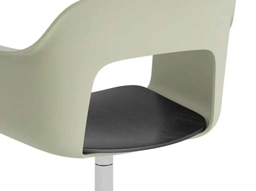 Layout 232 is an open-back swivel chair with armrests, featuring a polypropylene shell and a four-star base in chromed or powder-coated aluminum. Wooden seat.Designed by Julien Renault, Layout Armchair 232 offers a flexible and innovative design shaped by a commitment to comfort, functionality, and circularity. Characterised by the opening in the backrest, this defining feature provides greater comfort while giving its appearance a sense of lightness and transparency. A plywood seat brings natural warmth, while a sleek swivel four-star base provides stability and ease of movement, with all components designed for disassembly to extend the lifespan and enable refurbishment for long-term use. The shell is crafted from a minimum of 96% post-consumer recycled plastic and offered in a wide range of colours, with the seat offered in several finishes, and the aluminium base available in polished or powder-coated options, making Layout a versatile and durable seating solution ideal for most corporate settings and domestic environments.
