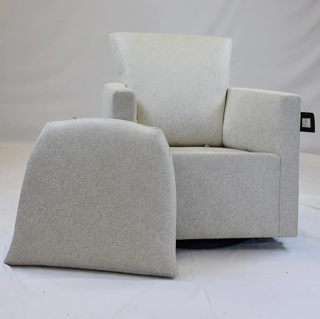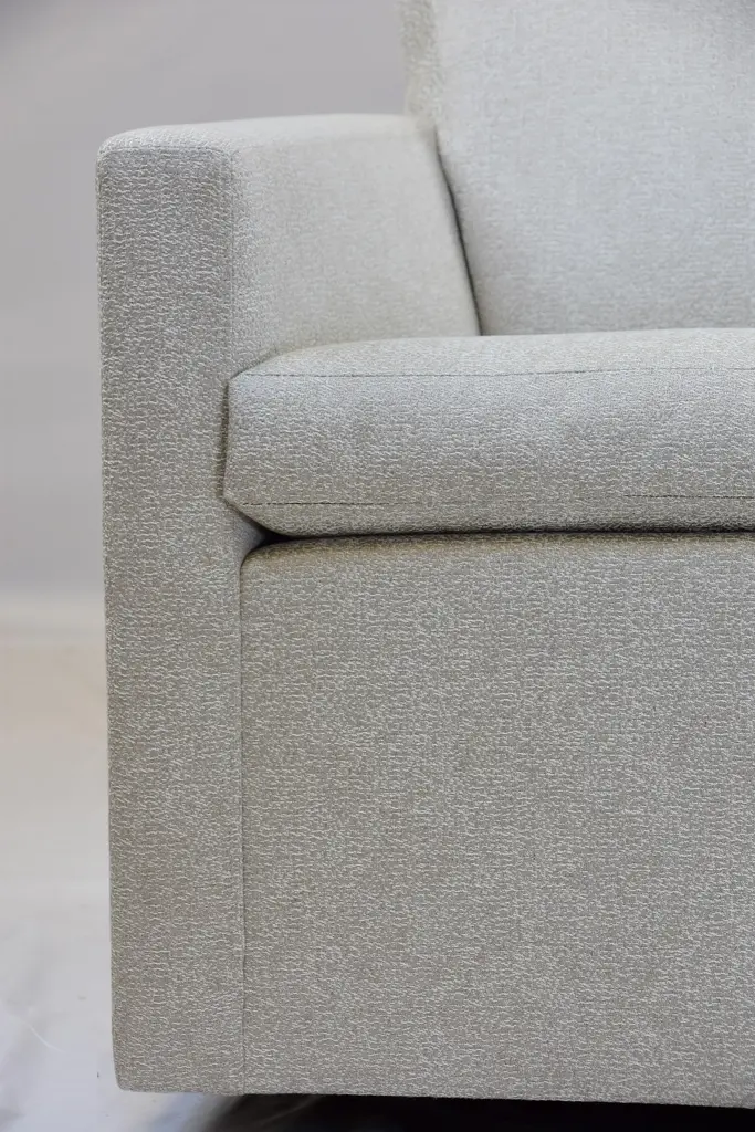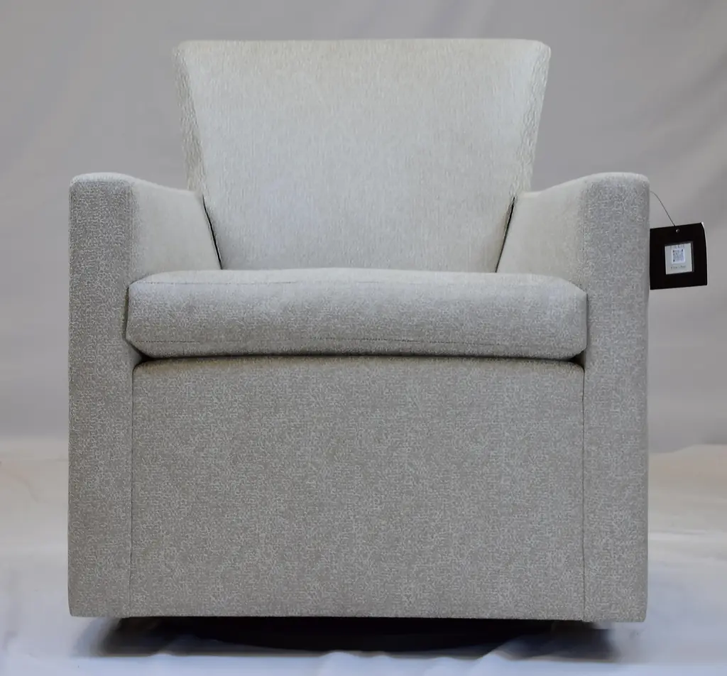 Le Jeune Upholstery Barrel Swivel Kara Chair Showroom Model, per item Offered for sale individually are 2 KARA barrel swivel showroom model chairs from Le Jeune Upholstery. The Kara chair is a medium-sized modern Barrel chair with a swivel base. The arms are boxed and reduced in a size proportionate to chair dimensions. The chair has a tight back with a loose seat design. The seat fill is an envelope type (foam core with down and feather wrap). The fabric covering the chair is a light gray synthetic woven blend. The chair has a solid hardwood frame construction and is American-made. Although a showroom model, the chairs have been lightly used and look like new. The chairs are offered individually or as a pair. Arm height, 23 ¼ " Dimensions: Height: 32.75 in (83.19 cm) Width: 28 in (71.12 cm) Depth: 32 in (81.28 cm) Seat Height: 18.5 in (46.99 cm)