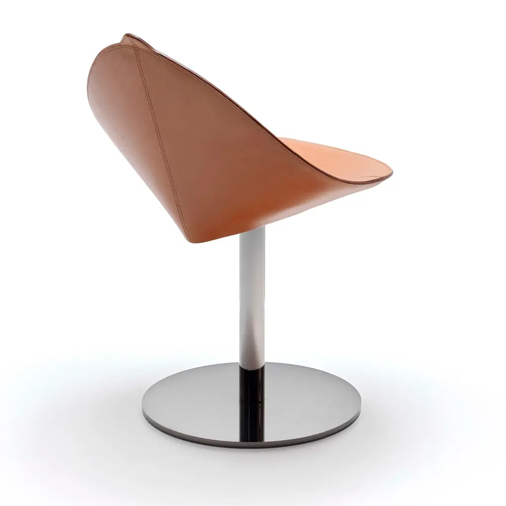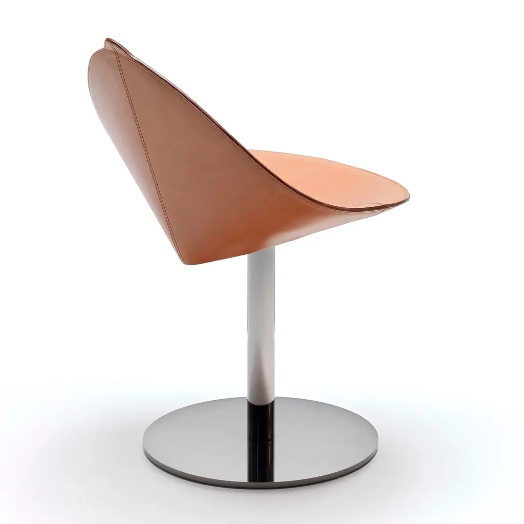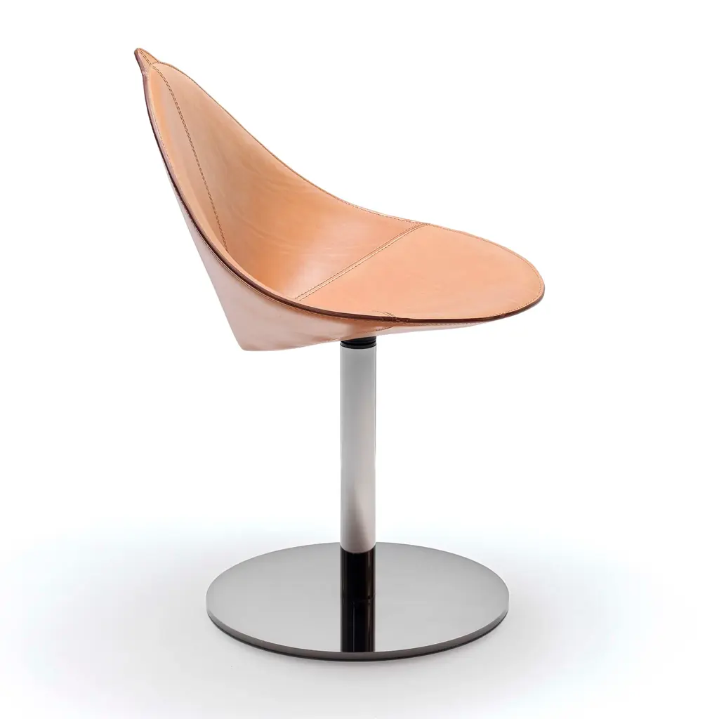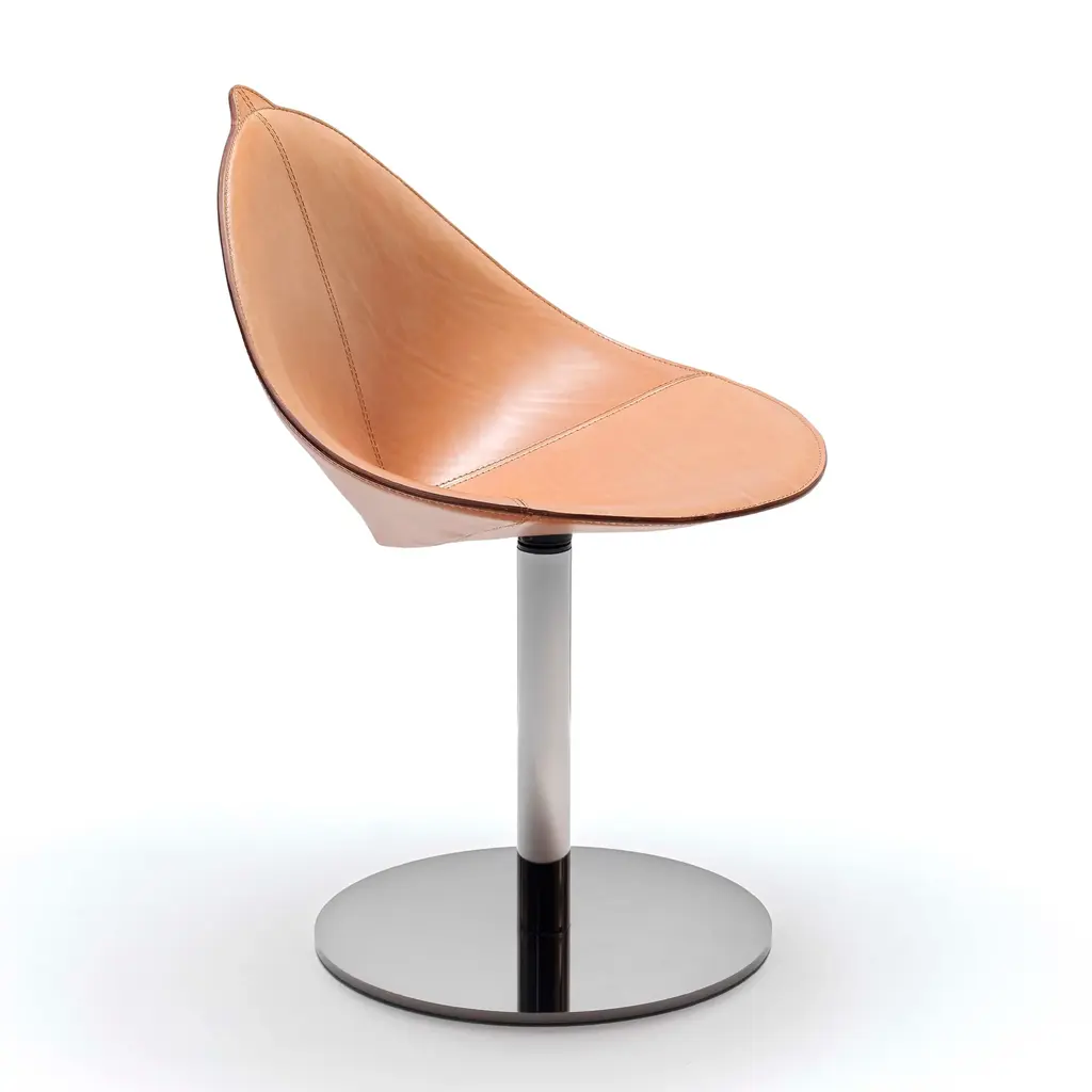 The Fiorile BT is a dining chair with a round base, featuring a swivel design and fixed height, constructed from steel in various finishes. The seat and backrest shell are made of slightly padded steel sheet, upholstered both internally and externally in full-grain leather or premium leather. This chair exemplifies elegance and ergonomics in a unique, handcrafted piece. It is ideal for dining rooms and representative settings.