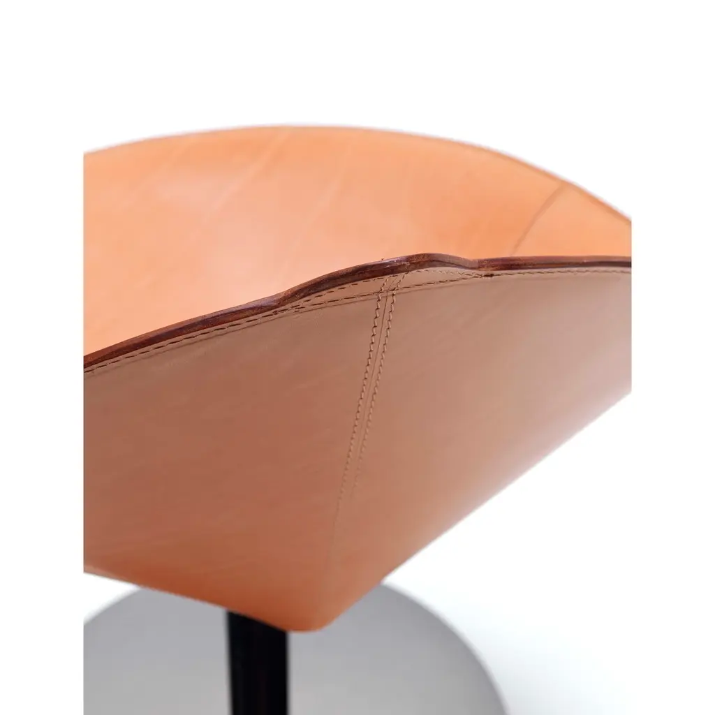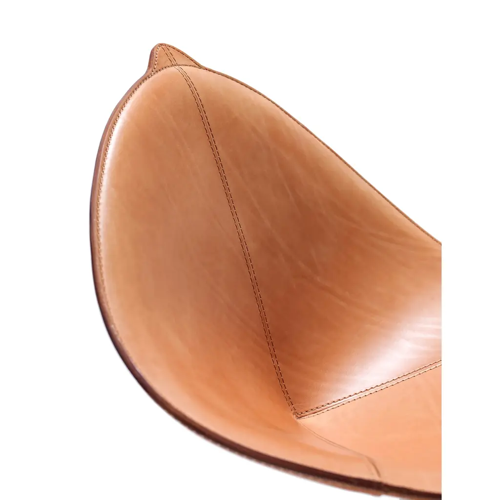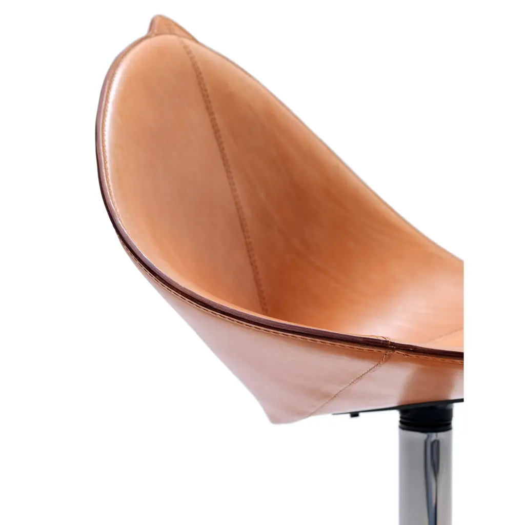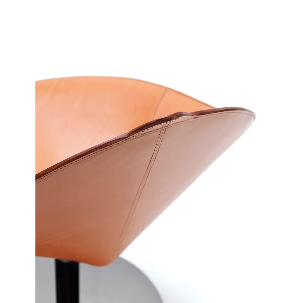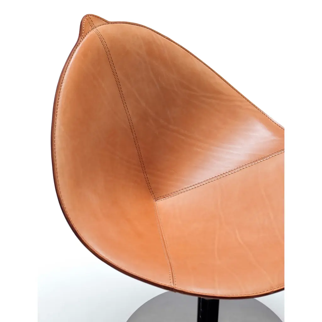 The Fiorile BT is a dining chair with a round base, featuring a swivel design and fixed height, constructed from steel in various finishes. The seat and backrest shell are made of slightly padded steel sheet, upholstered both internally and externally in full-grain leather or premium leather. This chair exemplifies elegance and ergonomics in a unique, handcrafted piece. It is ideal for dining rooms and representative settings.