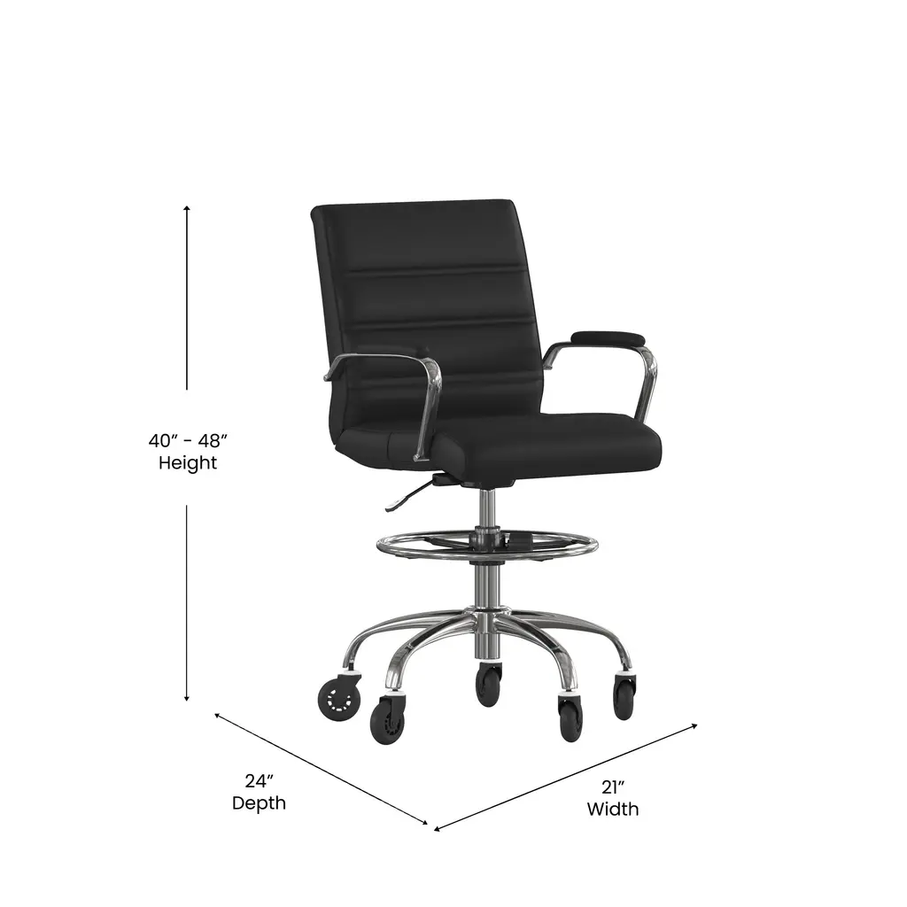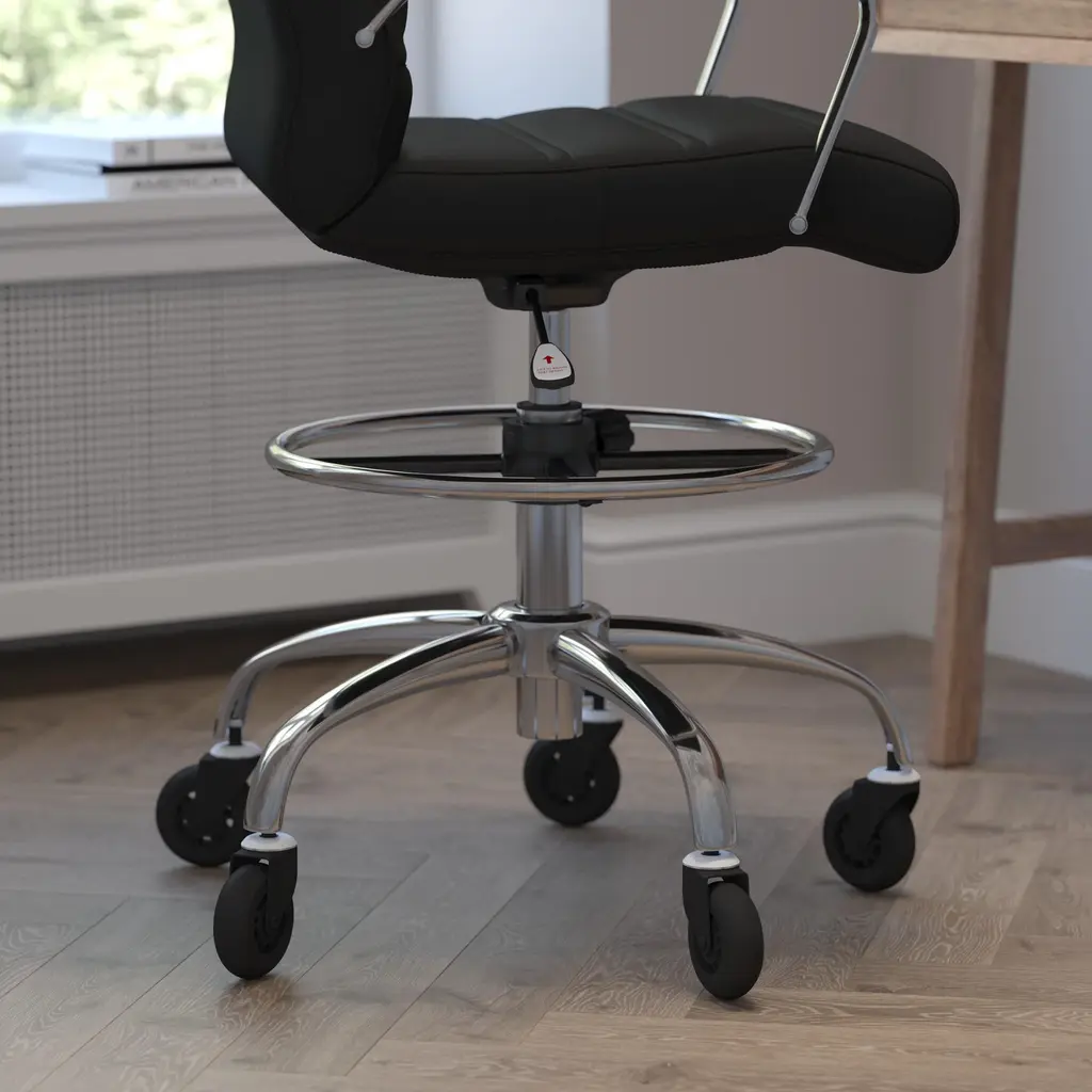 Working at higher than average surfaces is a breeze with this height adjustable drafting chair with updated roller style wheels. Covered in soft and durable LeatherSoft upholstery with ribbed stitching, this modern drafting chair brings subtle sophistication to any area. The padded arms provide tension relief for your neck and shoulders to ease strain and help maintain productivity. Working long hours can be stressful on the mind and body so comfortable seating is a must. The contoured mid-back design provides built-in lumbar support while the height adjustable foot ring and waterfall seat will ease pressure on your legs no matter your seat height. Adjust the seat from counter to bar height with the pneumatic lever under the seat and reach any work surface with the 360° swivel. The chrome column atop a 5-star chrome base with smooth ball-bearing polyurethane tires will provide stable seating and excellent mobility to get you where you need to go. Be ready to work in 30 minutes or less with the included step-by-step illustrated instructions. Wipe down your new drafting chair with a damp cloth to keep it looking new.
