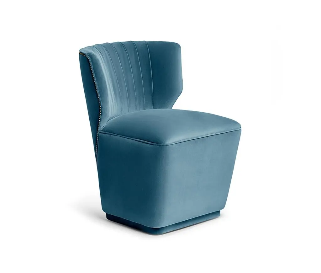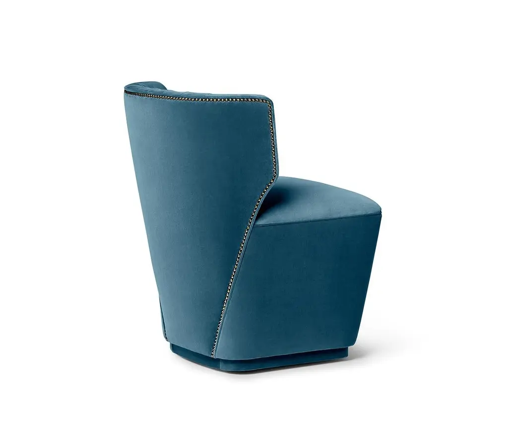 Lipstick Swivel Chair by MunnaDimensions: D 66 x W 60 x H 80 cm. SH: 51 cm.Materials: Solid wood, foam, bronze, and upholstery.Finish: Cotton Velvet, ref. Steel Blue, CV27 upholstery, and Bronze Renaissance upholstery nails.Available in all Munna fabrics except Wild Silk. Available in client’s ownmaterial. Available upholstered, Rosewood or Ebony veneer, solid Walnut, Wengé stain, or lacquer in all RAL colors, in matt or gloss. Fire retardant interlining is available on request. Handmade in Porto. Please contact us.Established in Porto in 2008, Munna is a furniture design brand renowned for creating handmade upholstery with unmatched craftsmanship, seamlessly blending noble materials and timeless design, for both commercial and residential projects.Made by hand in Porto, Munna’s pieces honor the profound heritage of craftsmanship, while drawing inspiration from history’s most influential artistic periods. Munna’s pieces are made of the finest fabrics such as cotton velvet, twill, leather, and silk; the finest wood veneers, such as ebony, walnut, and rosewood; sumptuous gold, silver, and copper leaves, metal details in brass, nickel, and copper, and superior lacquers.