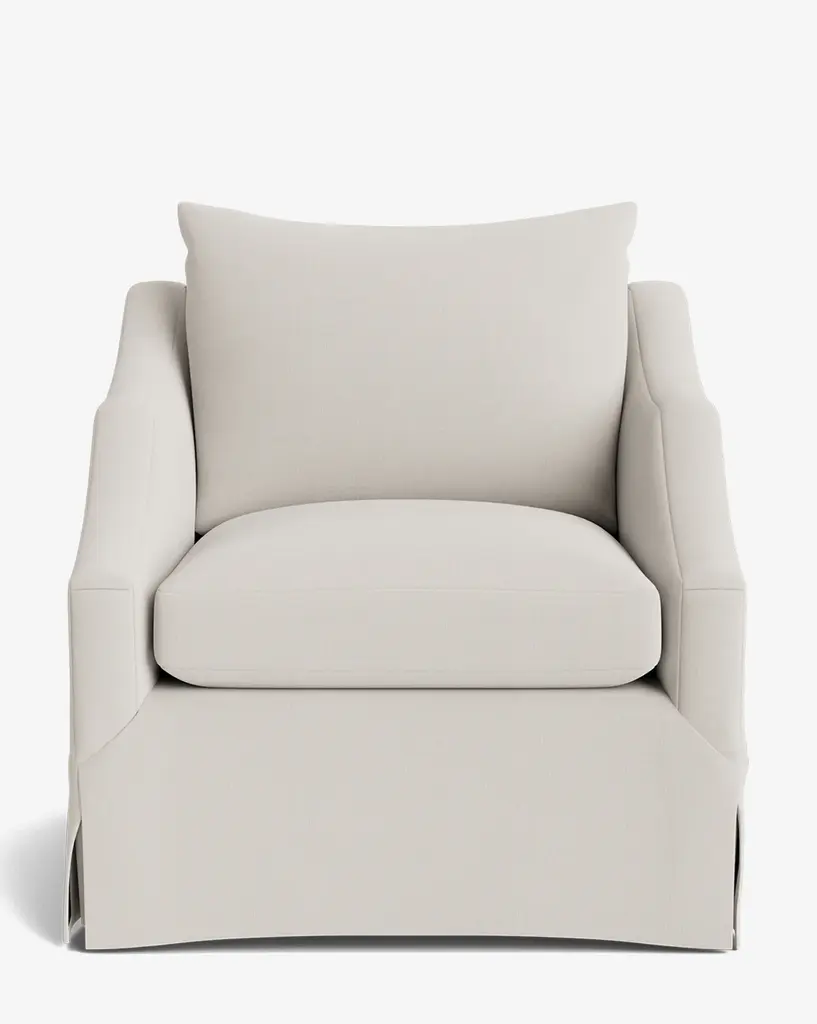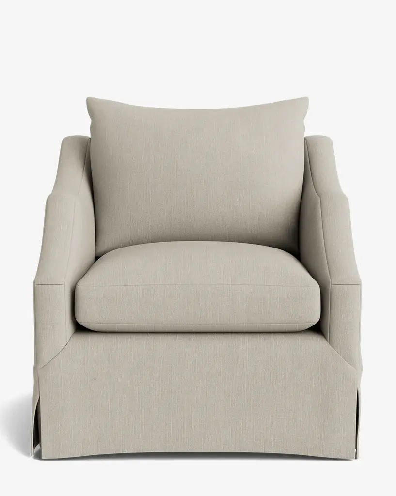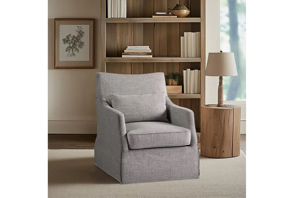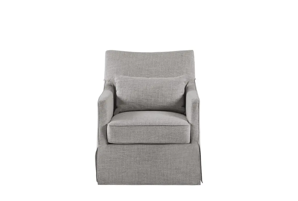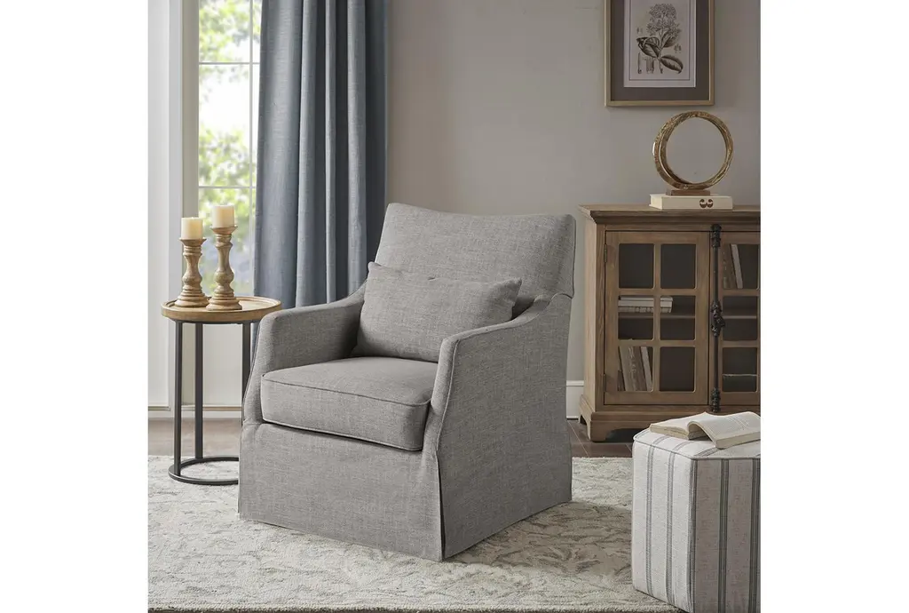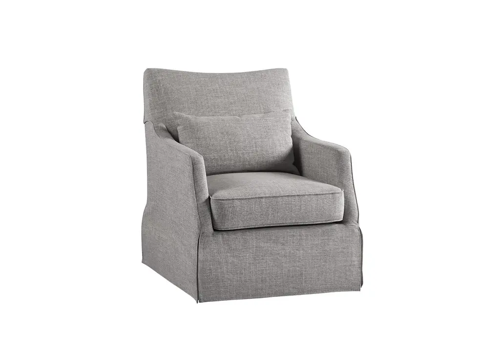 London Grey Skirted Swivel Chair brings modern elegance to your living room with its sleek silhouette and swivel base that allows easy conversation and ability to rotate 360 degrees.