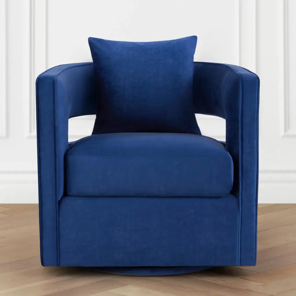With its barrel back, cutout arms, and Navy velvet upholstery, this swivel chair adds instant glamour to a room. A kiln-dried frame and plush foam-and-fiber fill ensure long-lasting comfort and support.