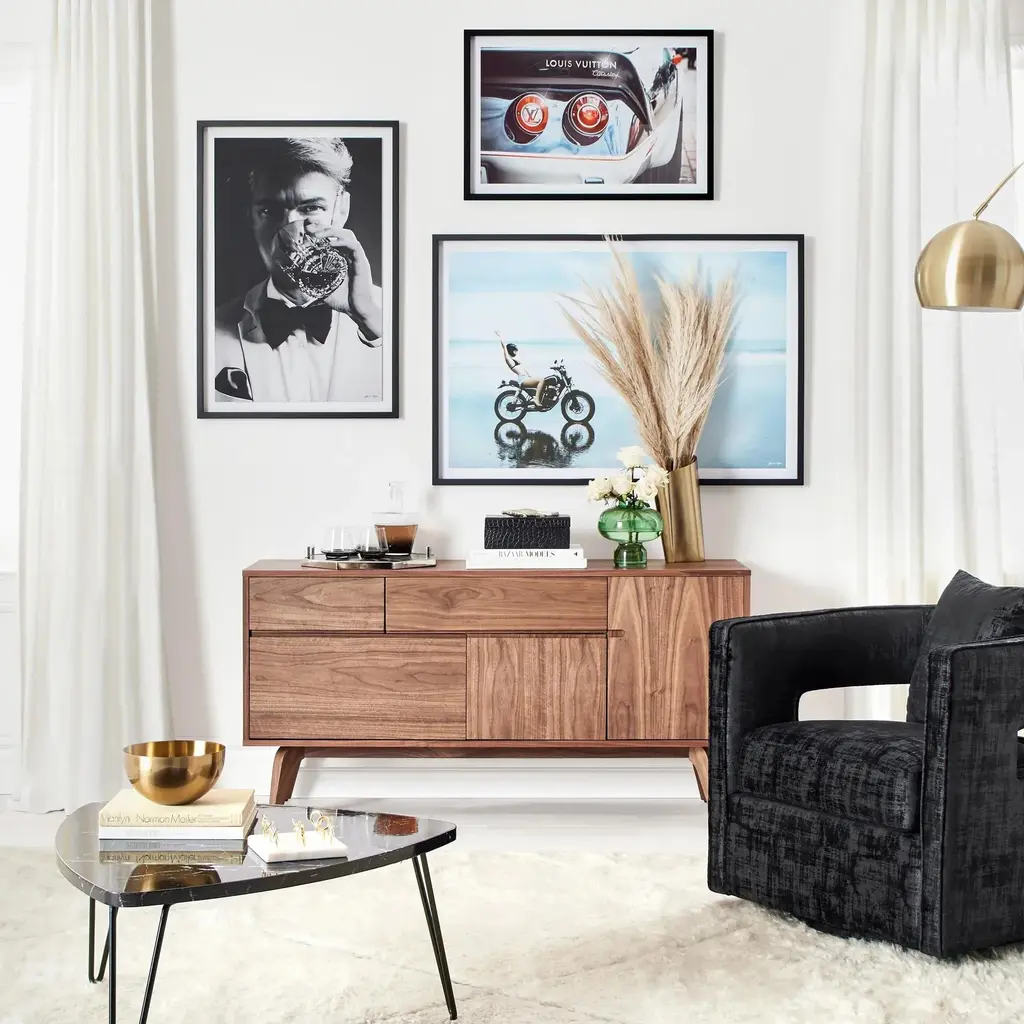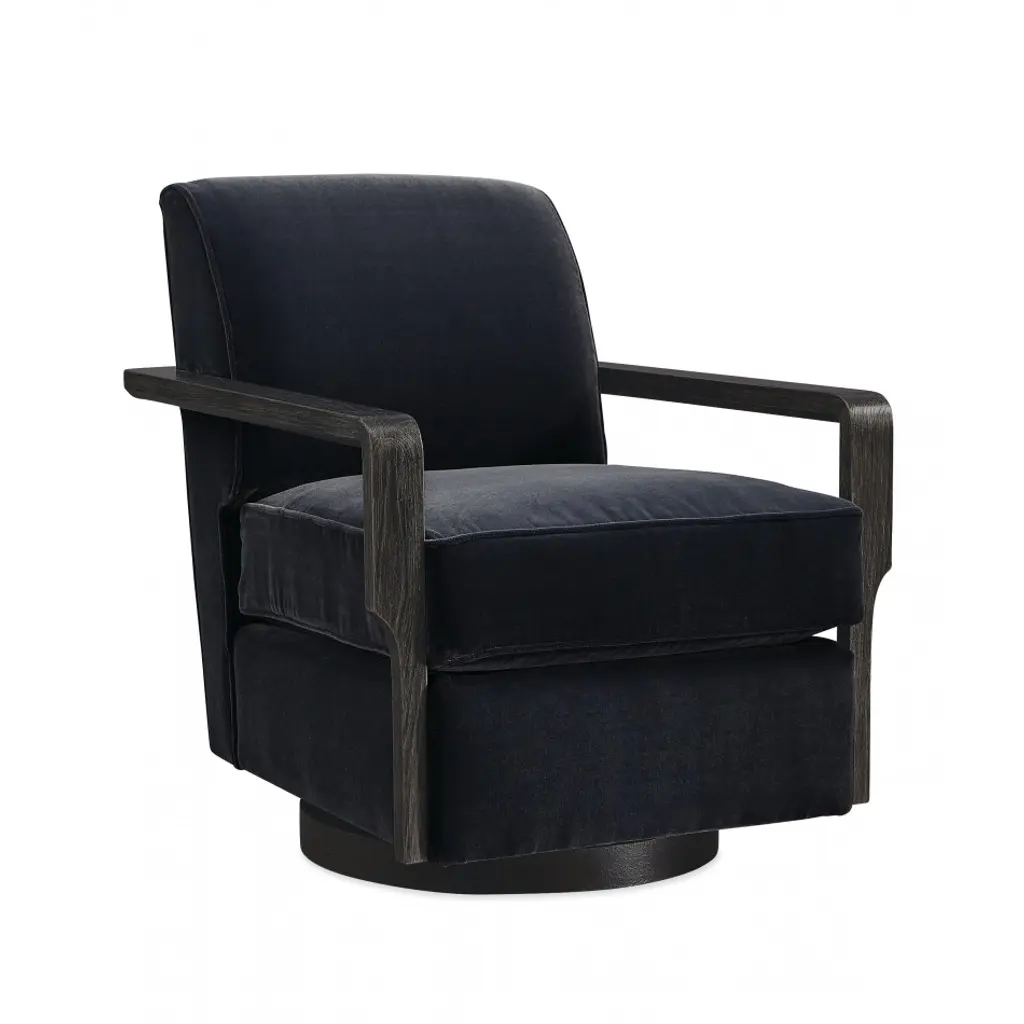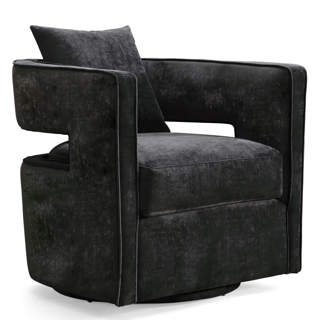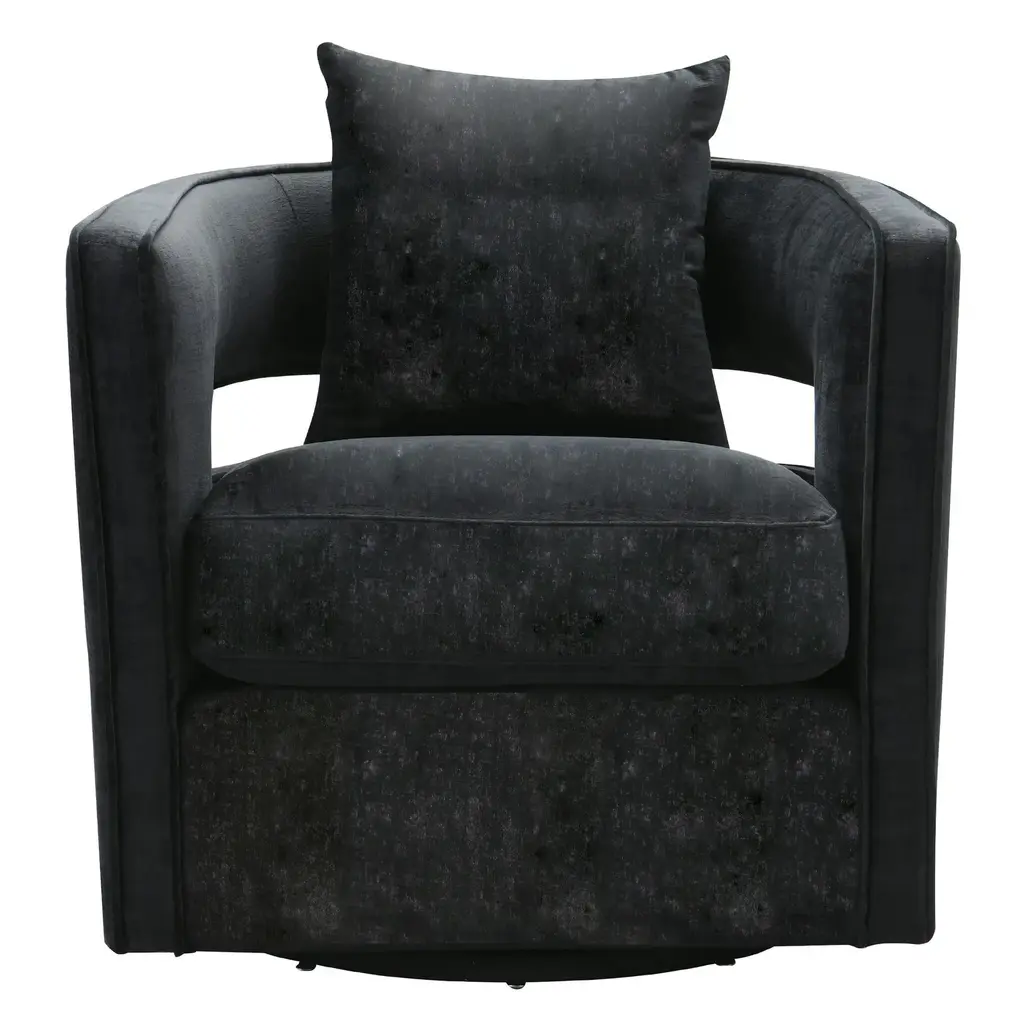 With its barrel back, cutout arms, and Black velvet upholstery, this swivel chair adds instant glamour to a room. A kiln-dried frame and plush foam-and-fiber fill ensure long-lasting comfort and support.