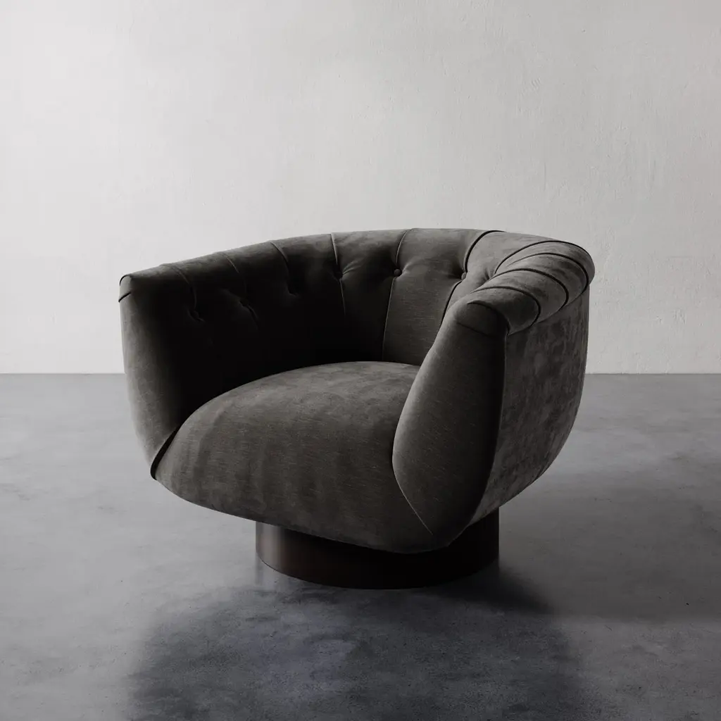 The Lune Swivel Chair from Lemieux et Cie is a masterful expression of sculptural comfort, its perfectly rounded form embracing the body with the same enveloping ease as the great Danish Modern chairs of the 1940s and ’50s. With its meticulously tailored, tufted back rests atop a discreet swivel base, this piece moves effortlessly within a space, offering both versatility and an undeniable sense of design pedigree.The Lune Swivel Chair is handmade by skilled artisans in North Carolina