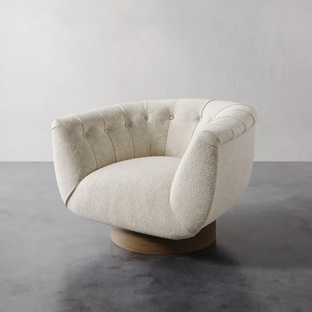 The Lune Swivel Chair from Lemieux et Cie is a masterful expression of sculptural comfort, its perfectly rounded form embracing the body with the same enveloping ease as the great Danish Modern chairs of the 1940s and ’50s. With its meticulously tailored, tufted back rests atop a discreet swivel base, this piece moves effortlessly within a space, offering both versatility and an undeniable sense of design pedigree.The Lune Swivel Chair is handmade by skilled artisans in North Carolina